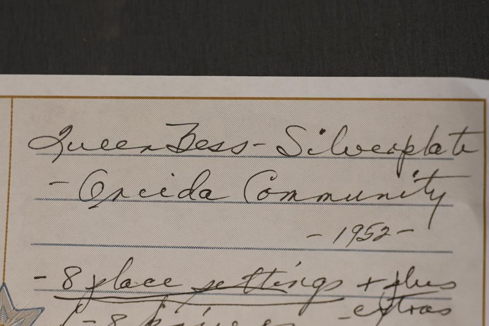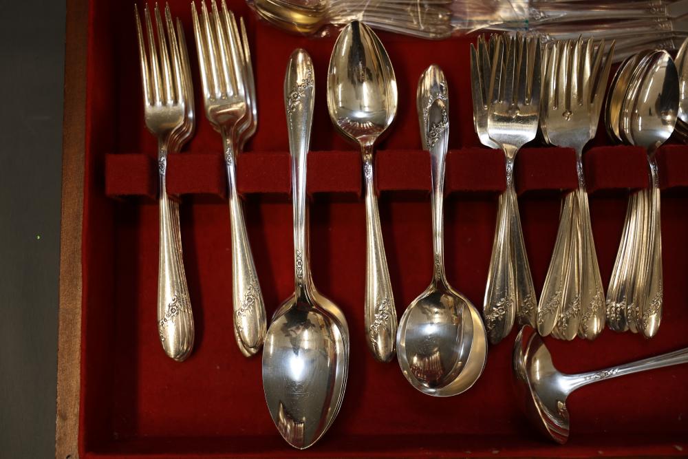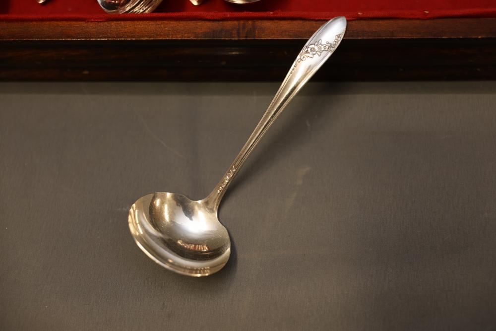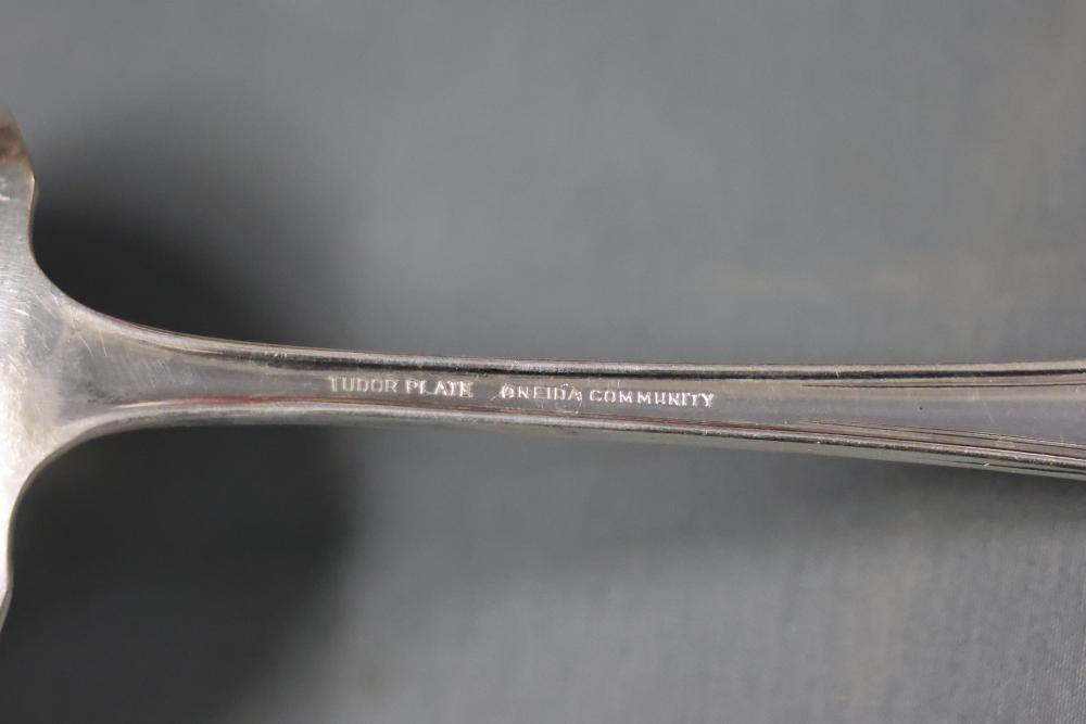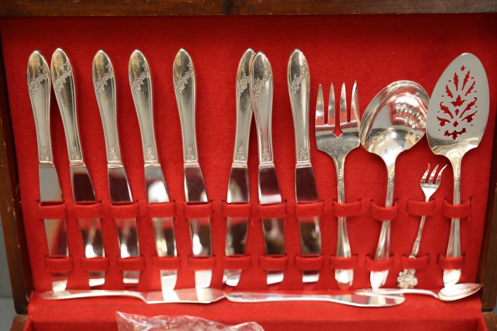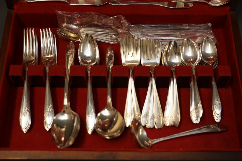 Oneida Community Tudor Plate Queen Bess Silverplate Flatware Set with Wood Storage Box. Set includes service for eight with additional serving pieces, featuring knives, forks, spoons, and serving utensils. Stored in a hinged wooden box with decorative detailing and red felt interior. Tarnish and use wear present. Pickup only.