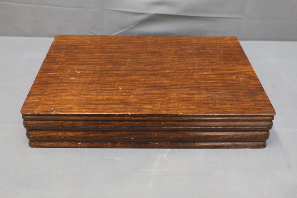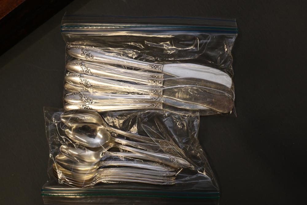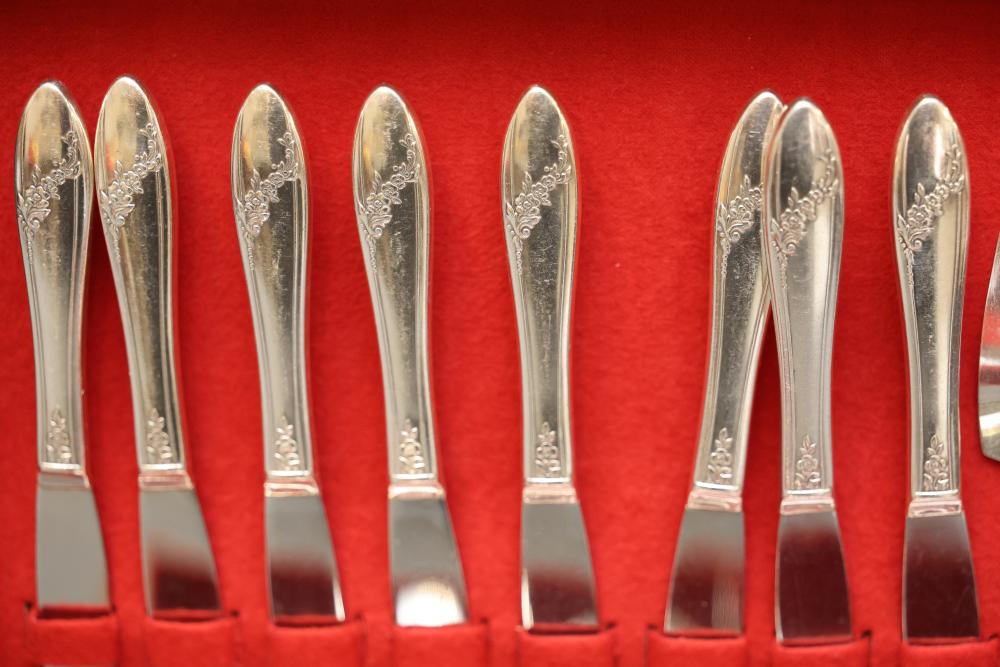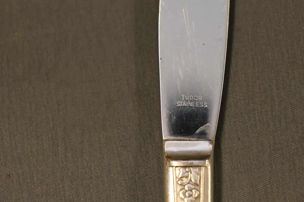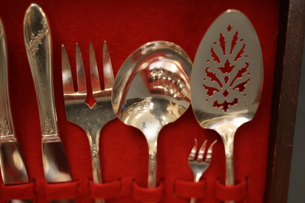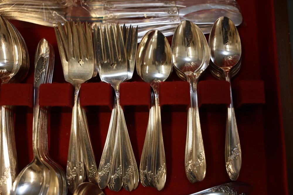 Oneida Community Tudor Plate Queen Bess Silverplate Flatware Set with Wood Storage Box. Set includes service for eight with additional serving pieces, featuring knives, forks, spoons, and serving utensils. Stored in a hinged wooden box with decorative detailing and red felt interior. Tarnish and use wear present. Pickup only.