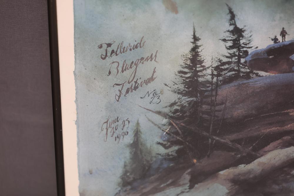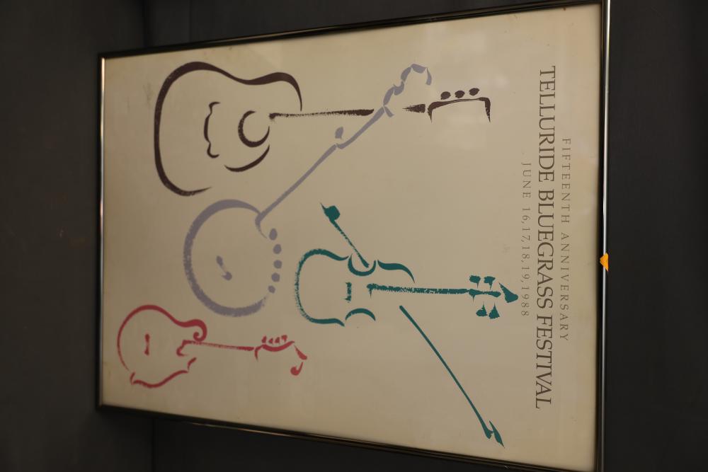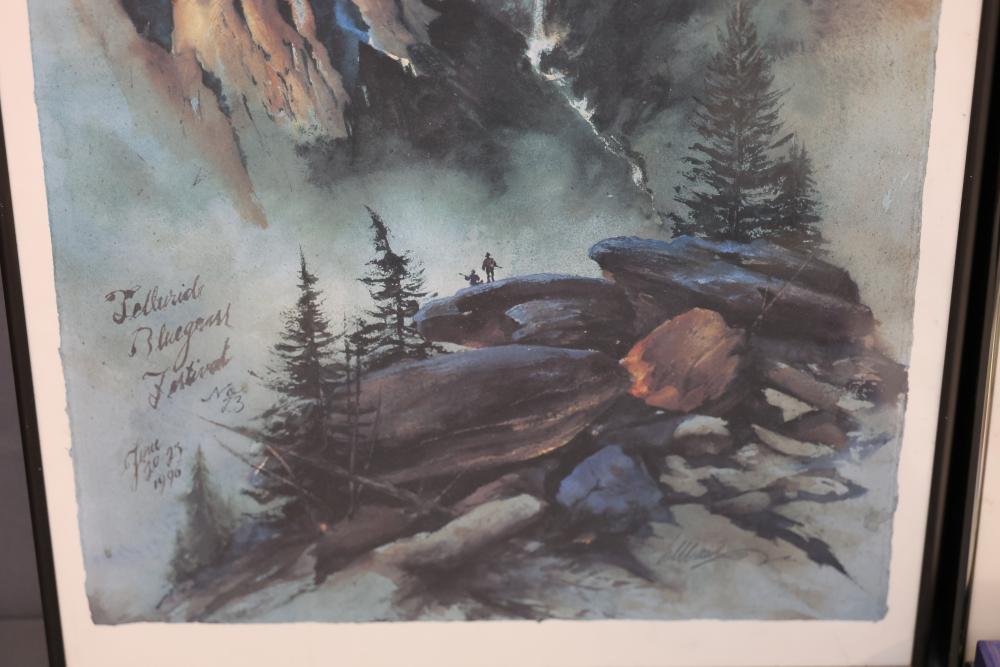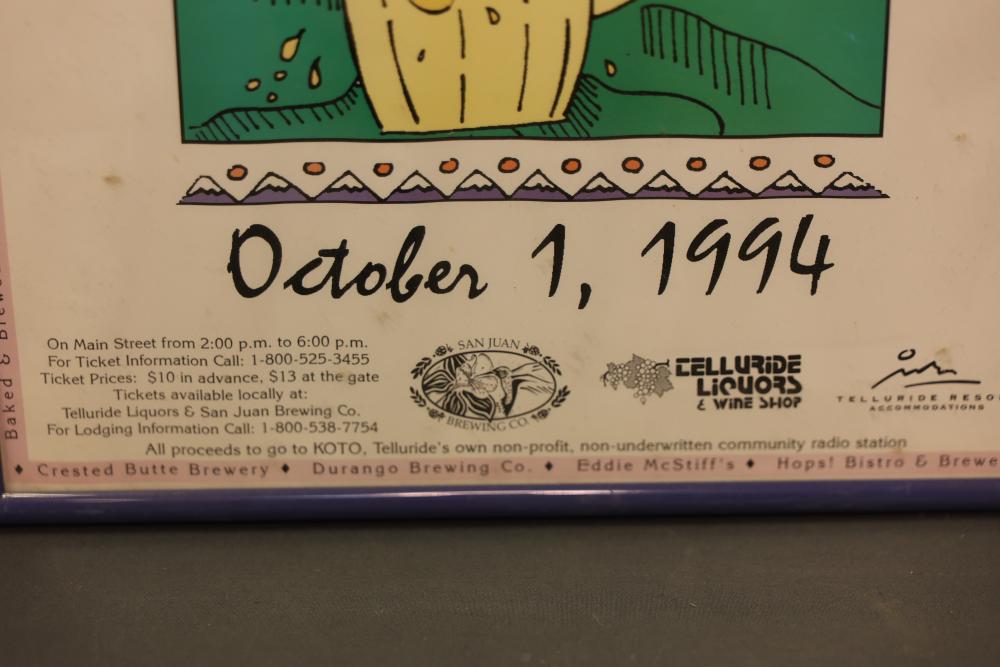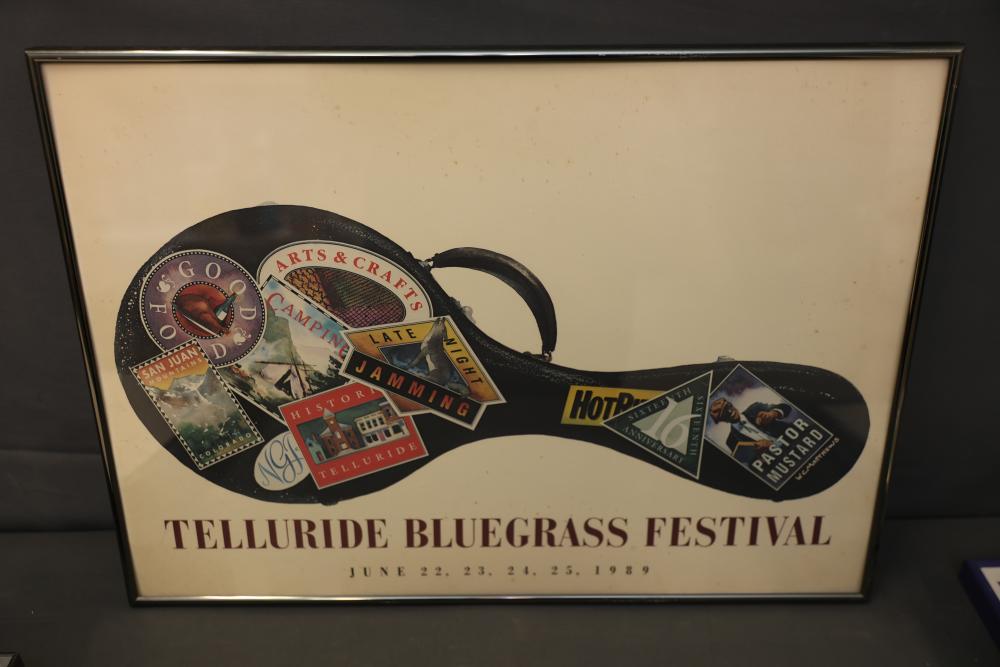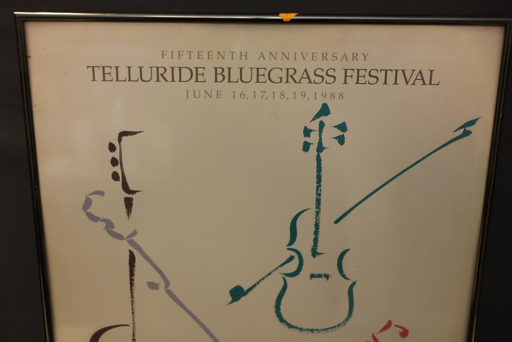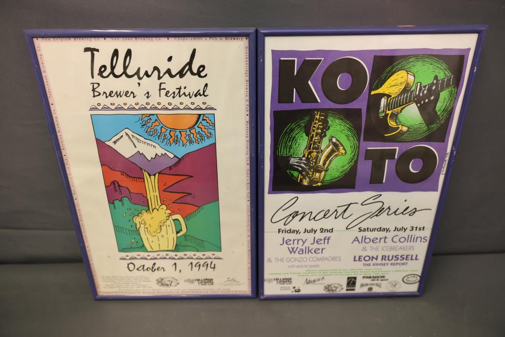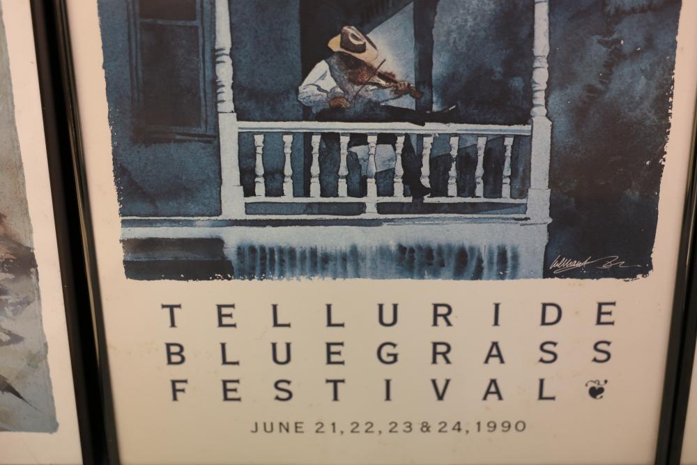 Framed Telluride event posters featuring designs for Bluegrass Festivals (1990, 1994) and the Brewer"s Festival (1994), with other concert art. Includes illustrations of mountain scenes, instruments, and event dates. Pickup only.