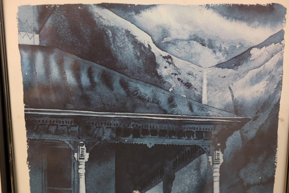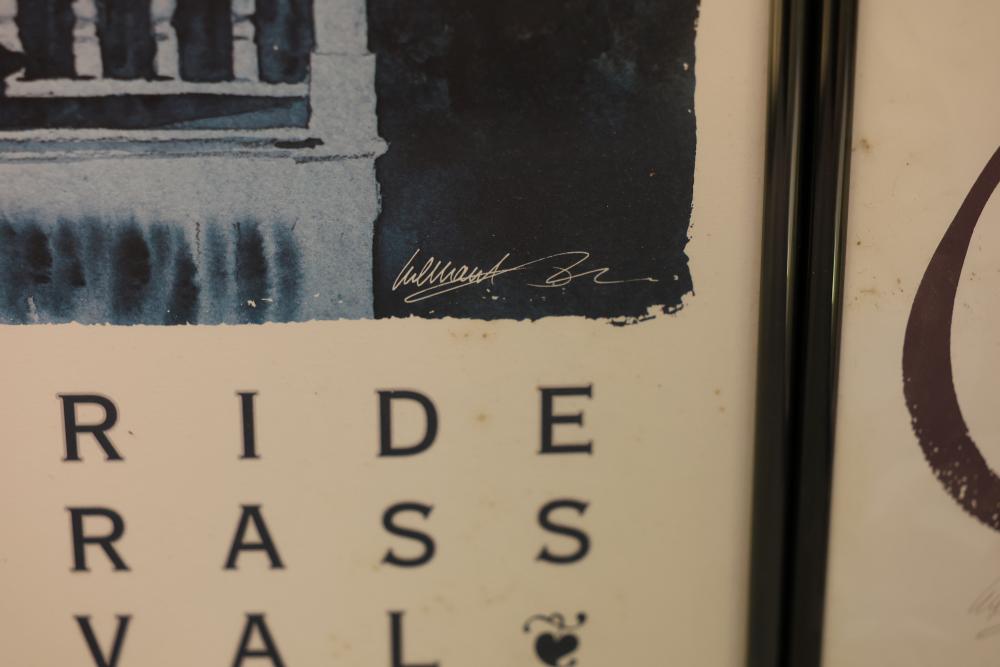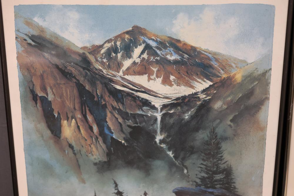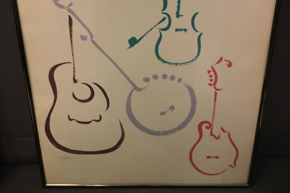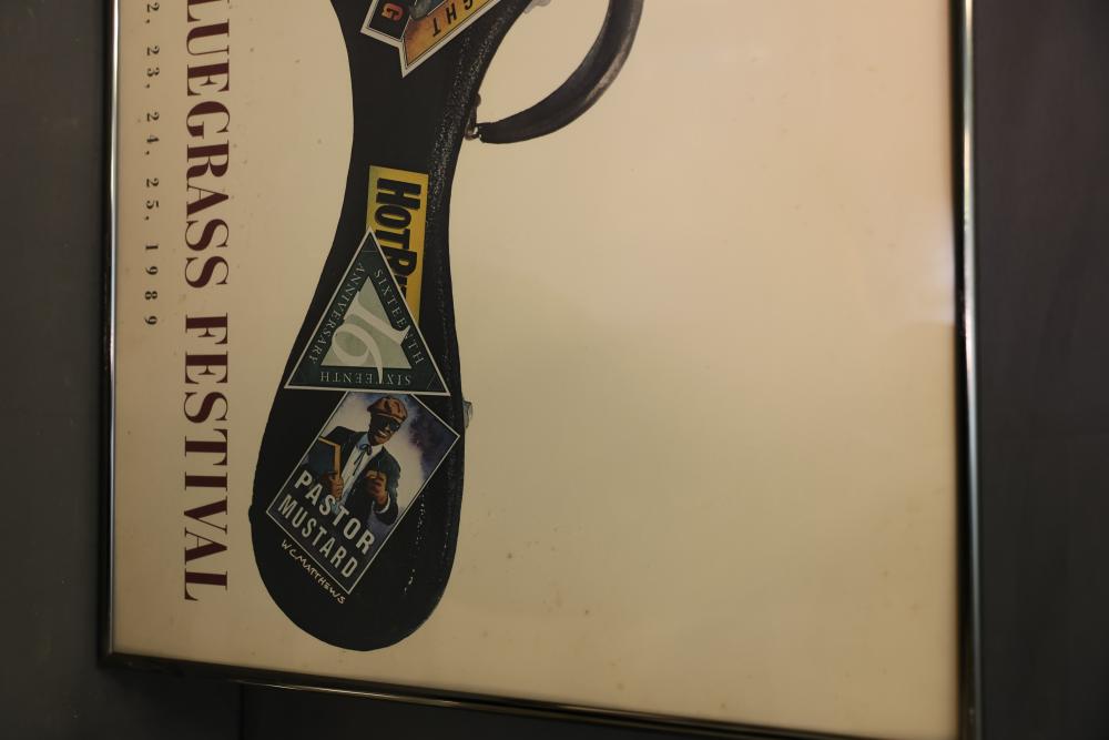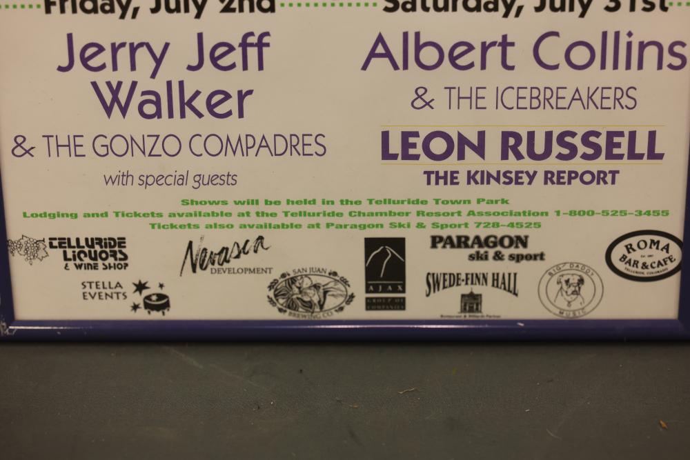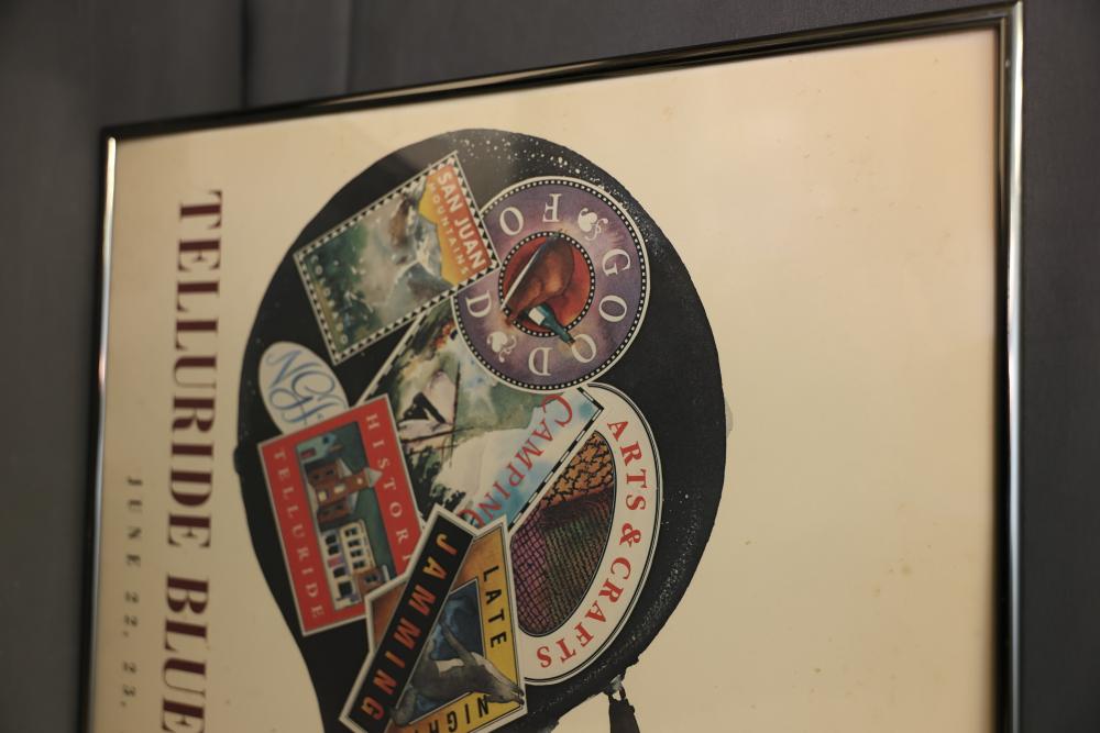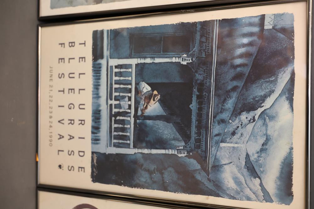 Framed Telluride event posters featuring designs for Bluegrass Festivals (1990, 1994) and the Brewer"s Festival (1994), with other concert art. Includes illustrations of mountain scenes, instruments, and event dates. Pickup only.