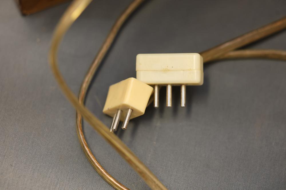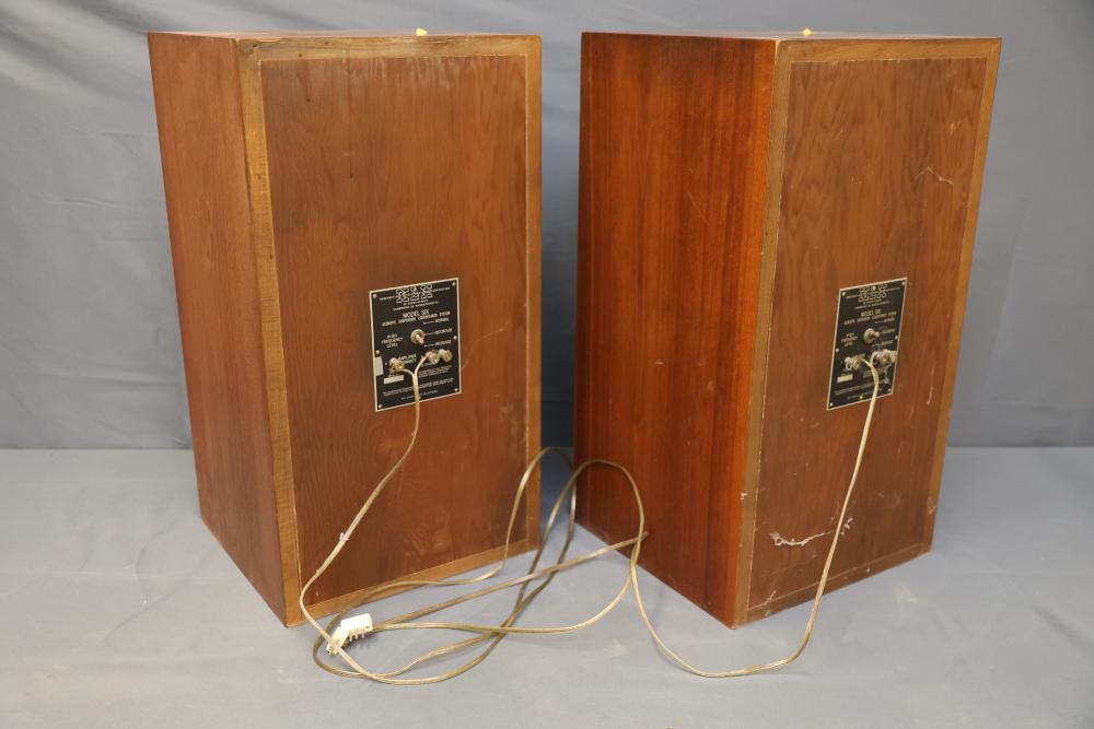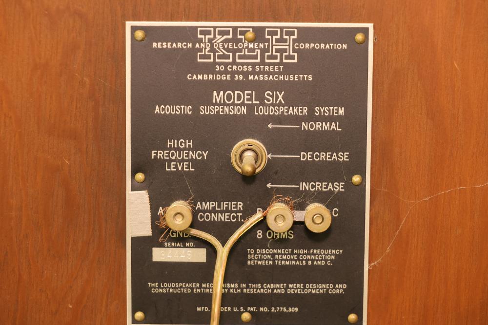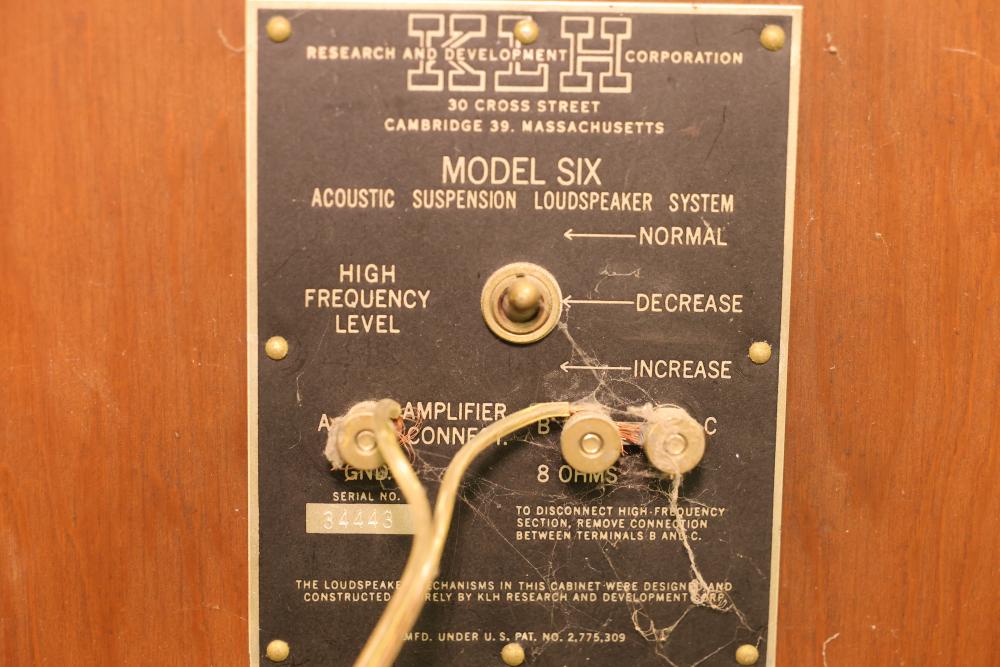 KLH Model Six Acoustic Suspension Loudspeaker Systems with Original Cables. Features include wood cabinets, fabric speaker grills, rear adjustment knobs for high-frequency levels, and input connectors for an amplifier. Pickup only.