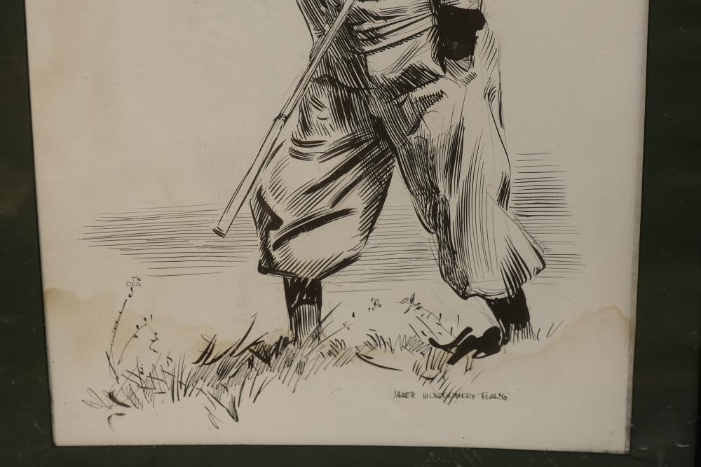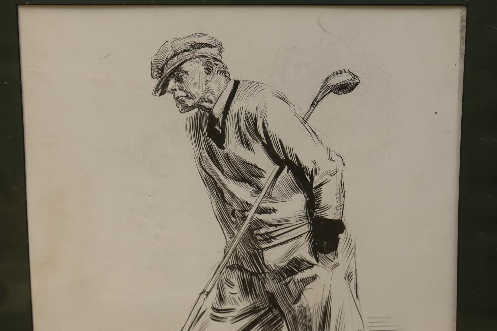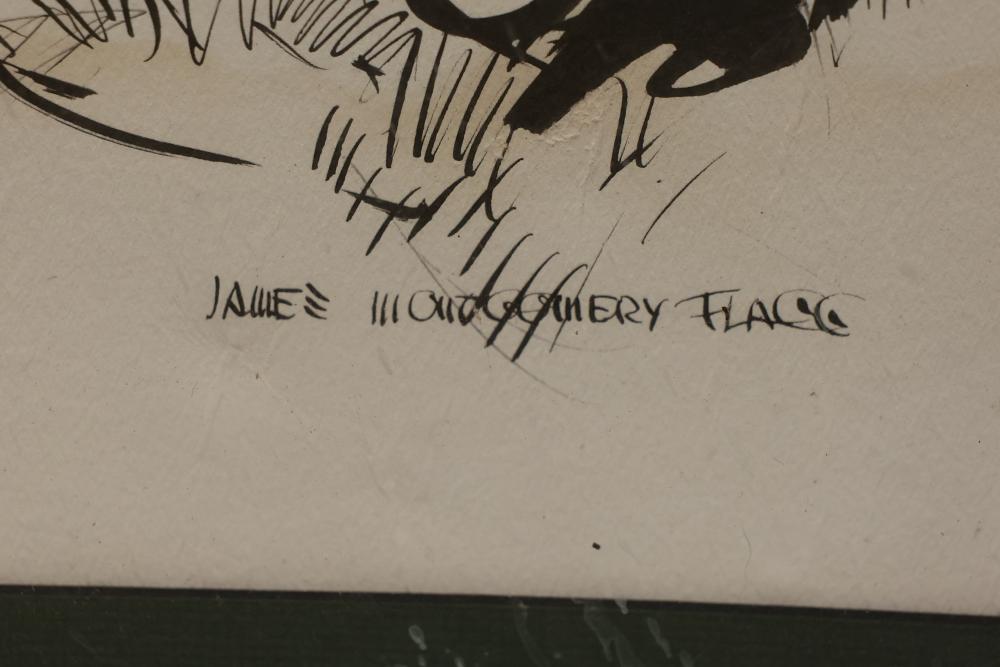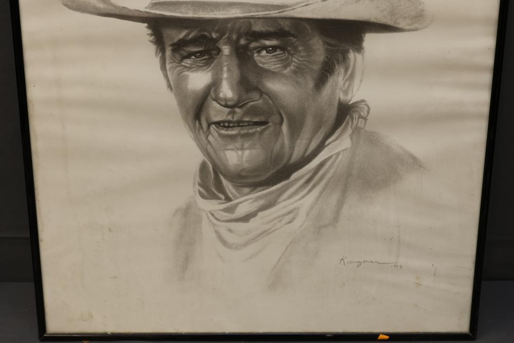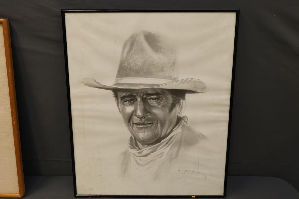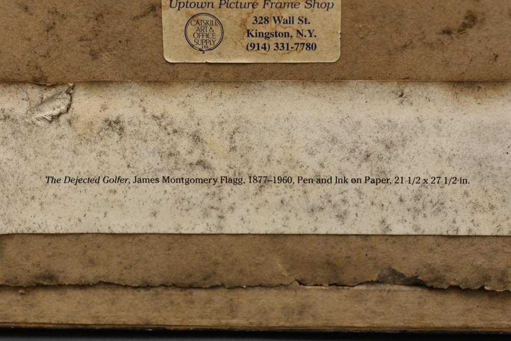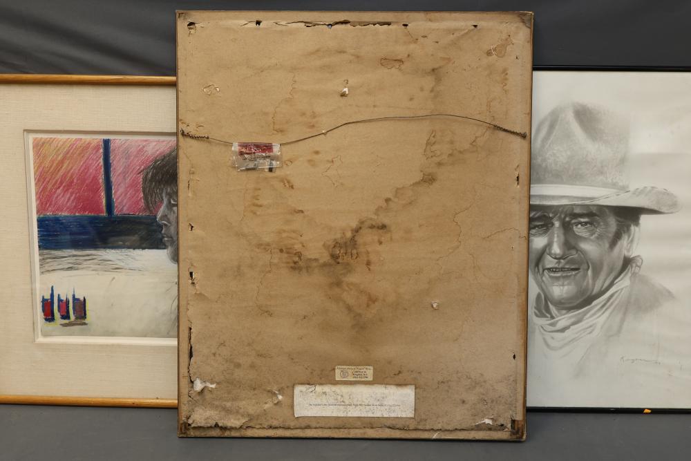 Three framed artworks. Includes pen and ink drawing titled 'The Dejected Golfer' by James Montgomery Flagg (21 1/2 x 27 1/2 in.), signed. A charcoal portrait signed Kingman (dated 1983) in a black frame. A mixed-media drawing titled 'Marianne' by Steve Smire (dated 1981) in a wooden frame. Frames show wear consistent with age. Pickup only.