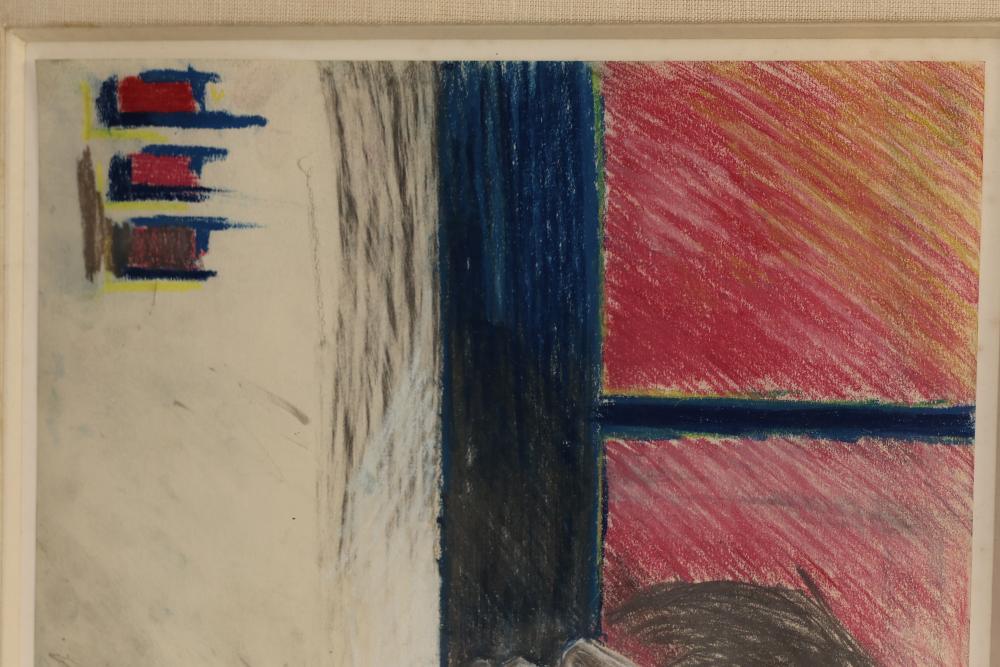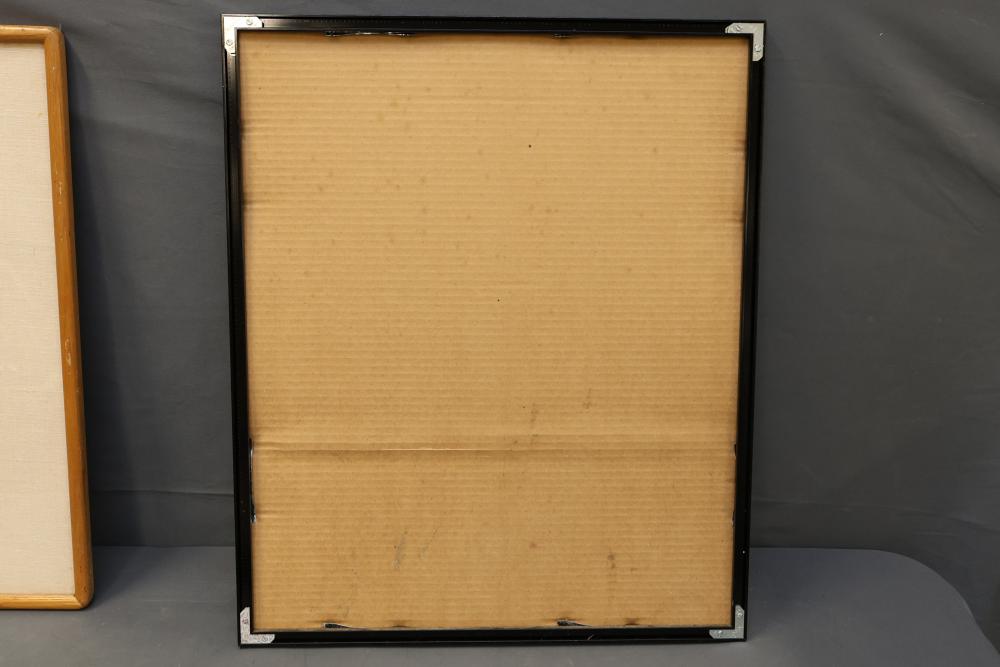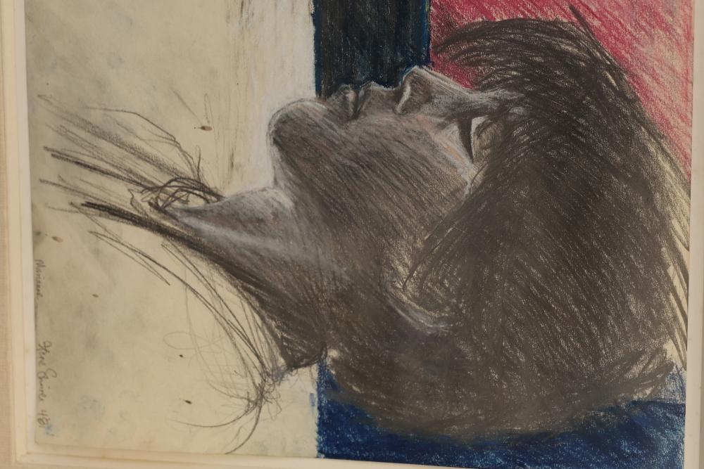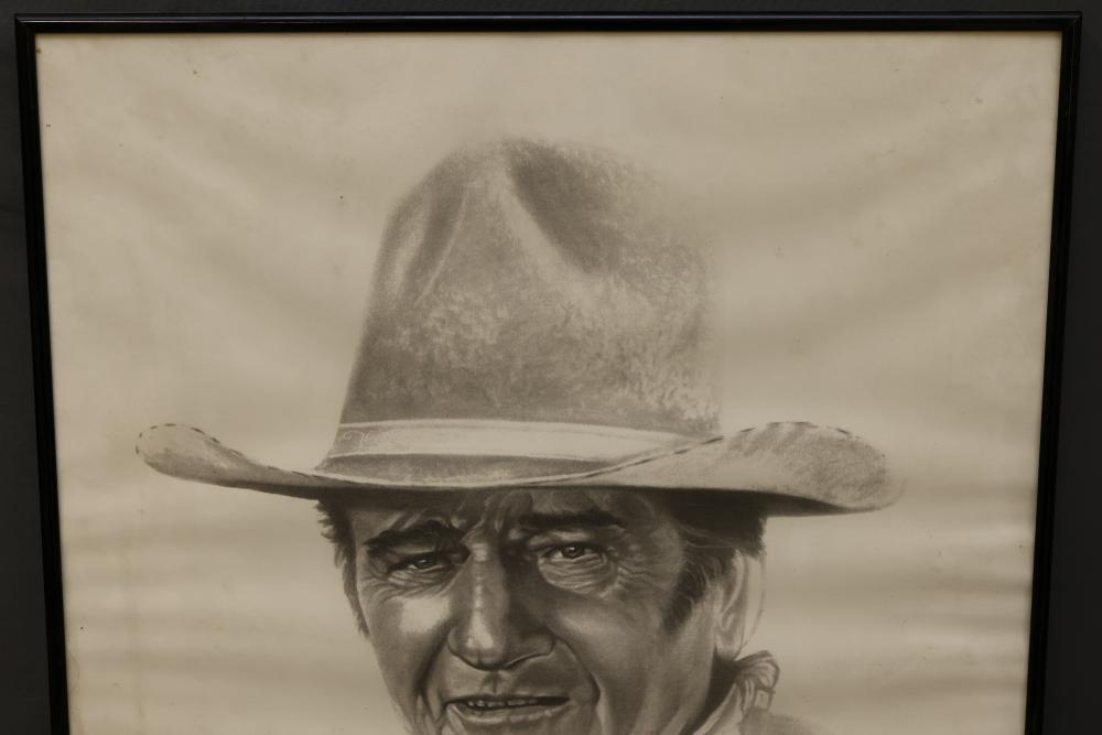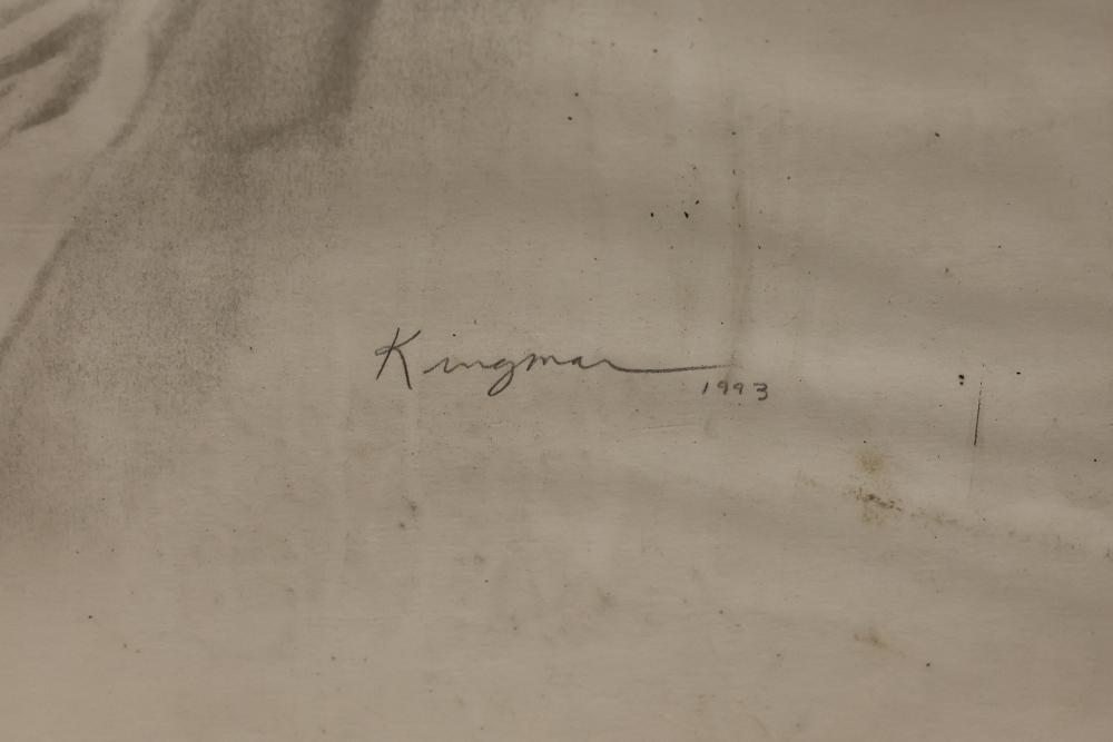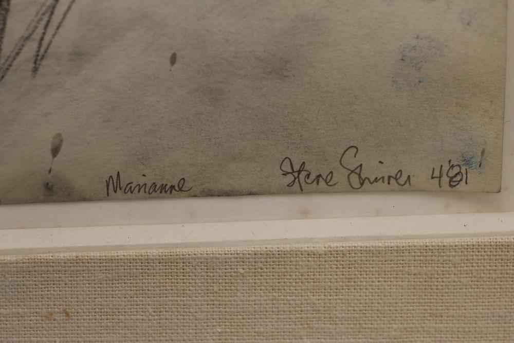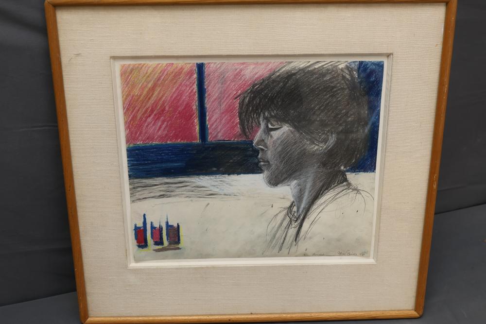 Three framed artworks. Includes pen and ink drawing titled 'The Dejected Golfer' by James Montgomery Flagg (21 1/2 x 27 1/2 in.), signed. A charcoal portrait signed Kingman (dated 1983) in a black frame. A mixed-media drawing titled 'Marianne' by Steve Smire (dated 1981) in a wooden frame. Frames show wear consistent with age. Pickup only.