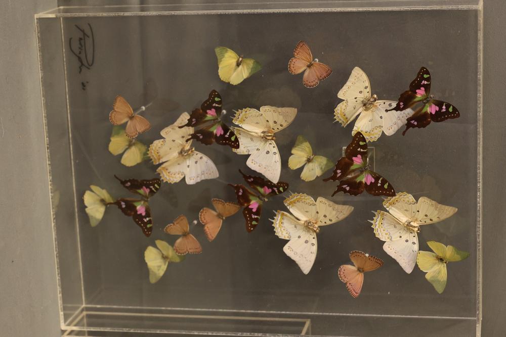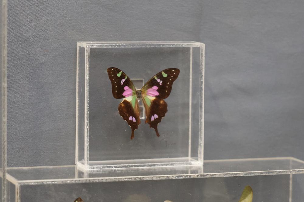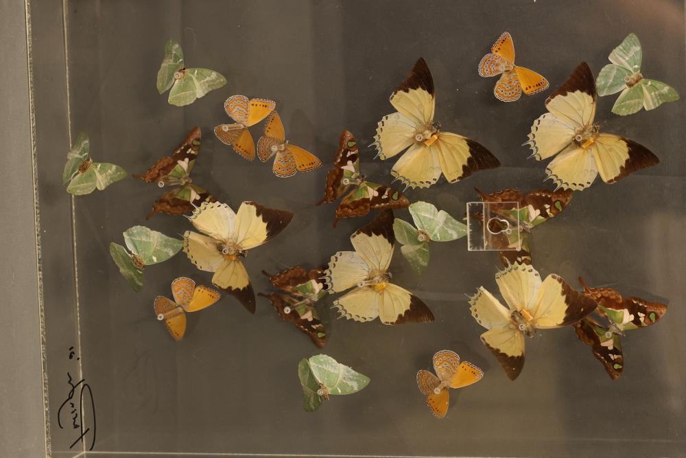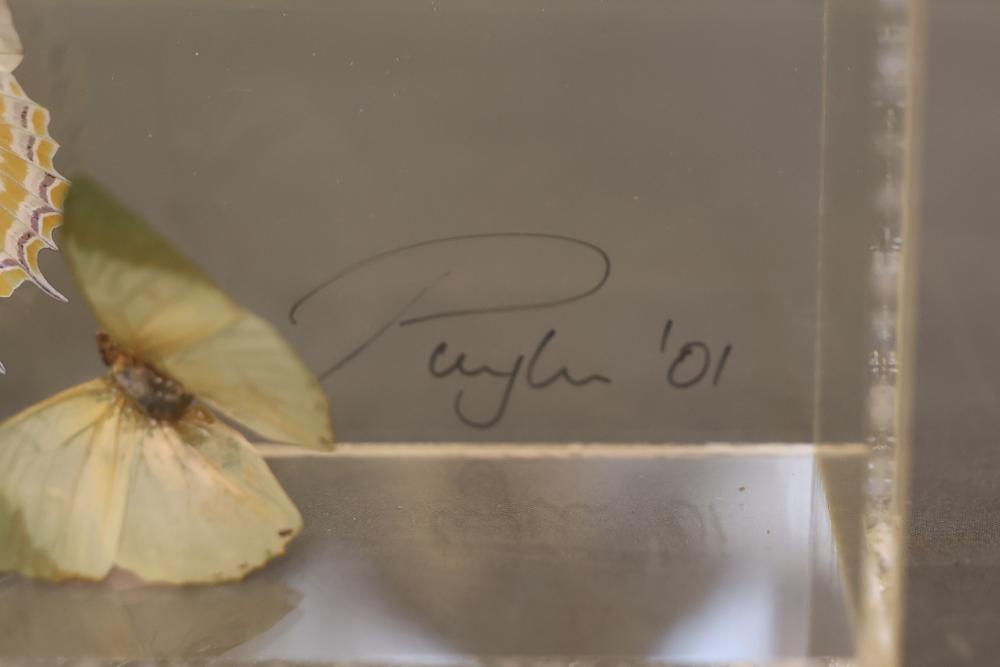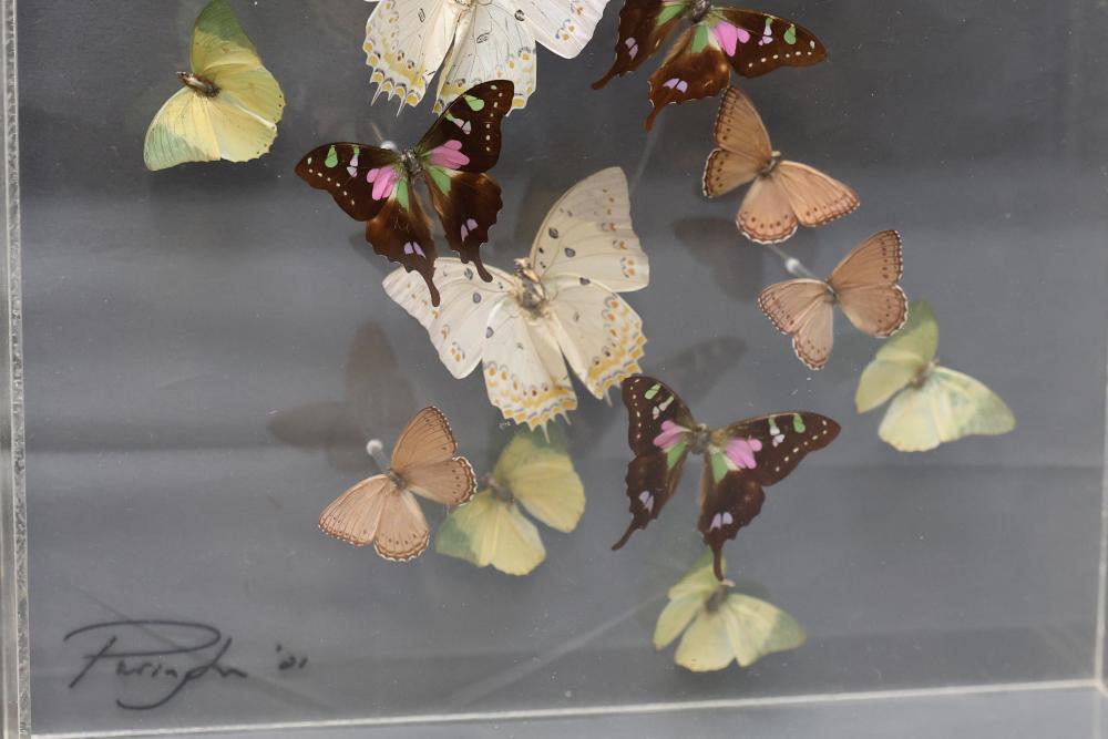 Acrylic display cases containing preserved butterflies in various colors, including white, brown, pink, green, and yellow tones. The butterflies are mounted within three clear acrylic cases of varying sizes. Each case is signed 'Puringho '01,' visible in the lower corner. Pickup only.
