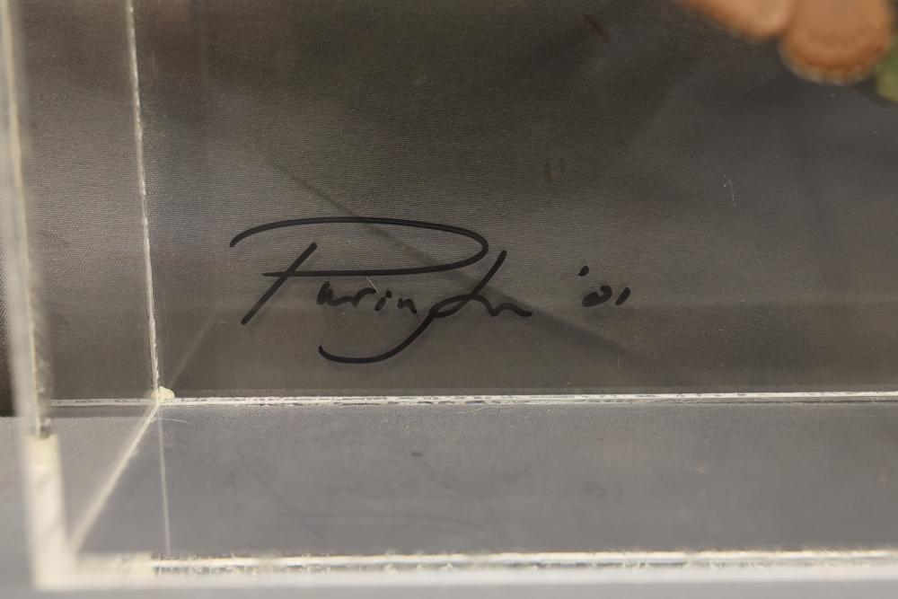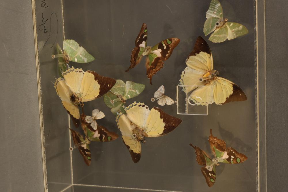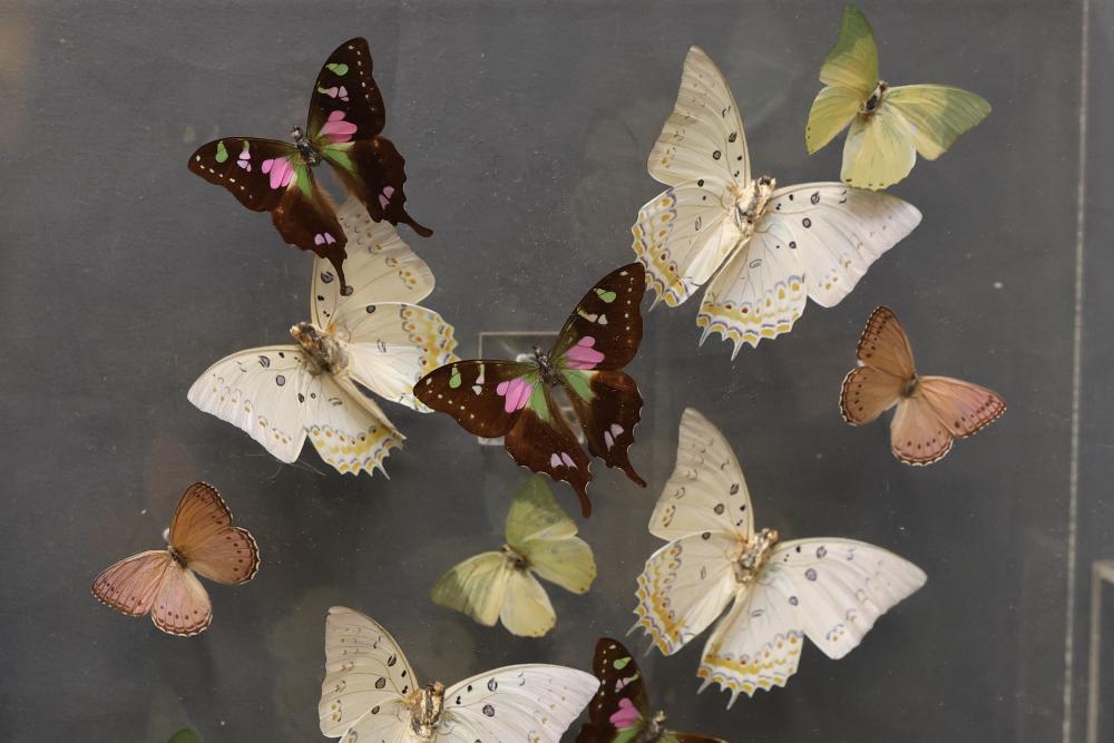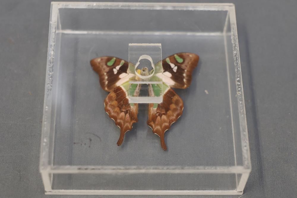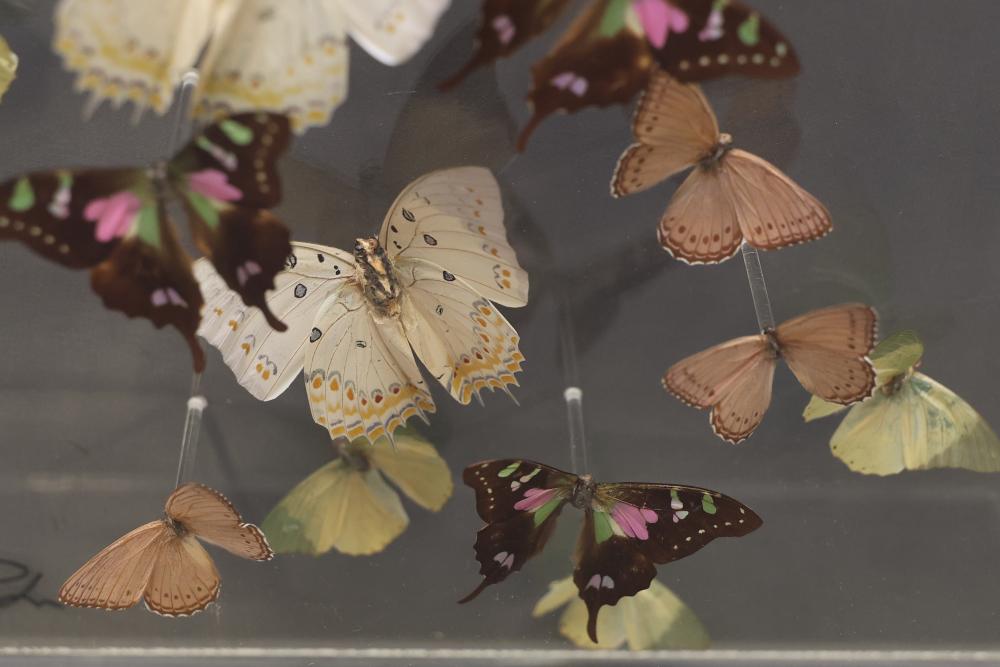 Acrylic display cases containing preserved butterflies in various colors, including white, brown, pink, green, and yellow tones. The butterflies are mounted within three clear acrylic cases of varying sizes. Each case is signed 'Puringho '01,' visible in the lower corner. Pickup only.