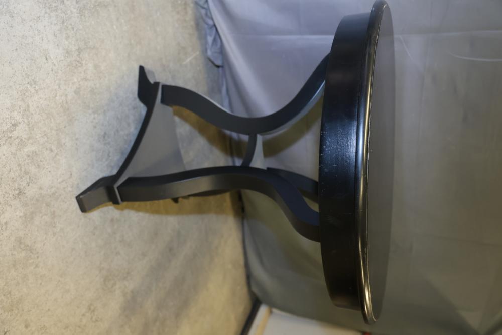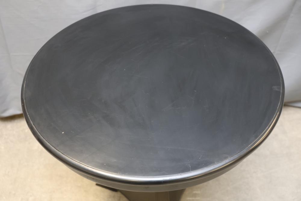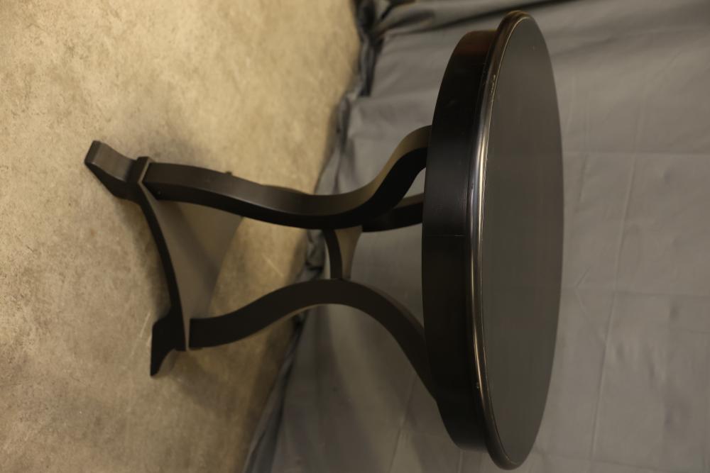 Black Round Pedestal Accent Table With Curved Legs. Features a round top with a smooth black finish and sturdy curved legs affixed to a stable base. 29"x30"dia. Pickup only.