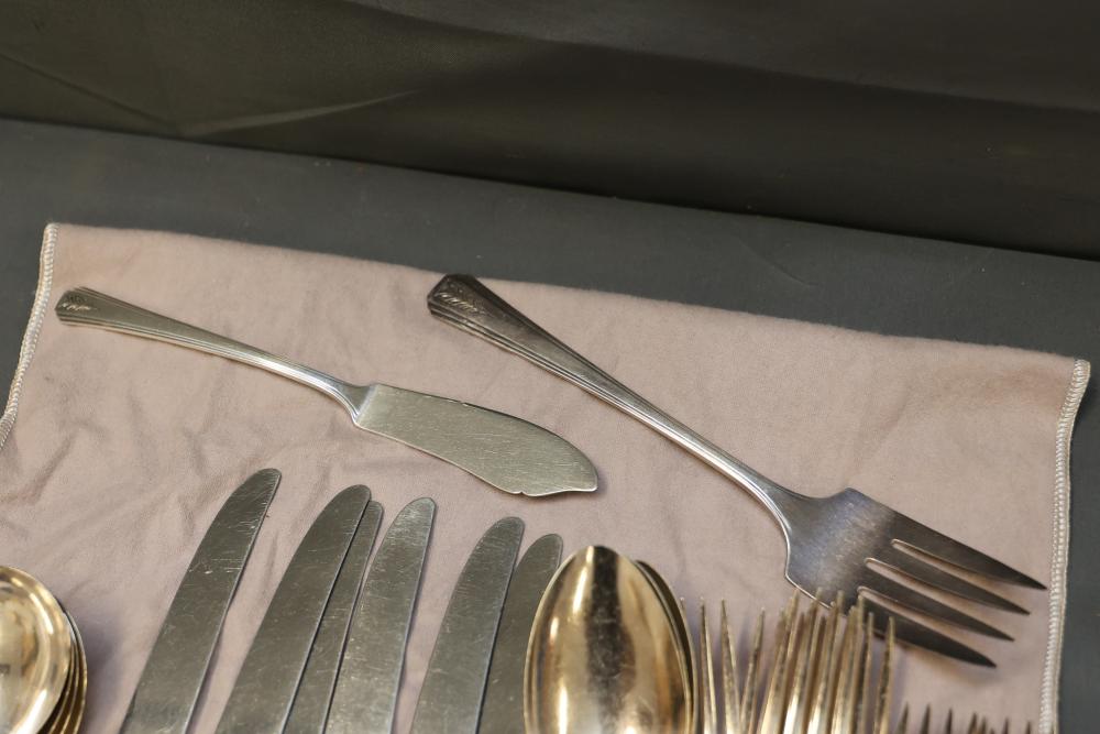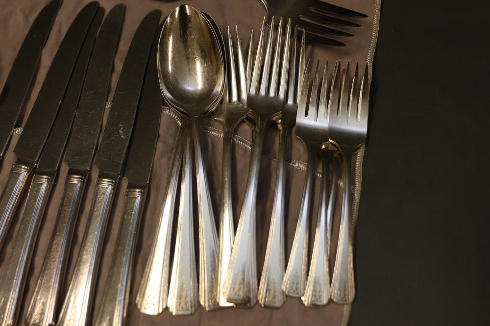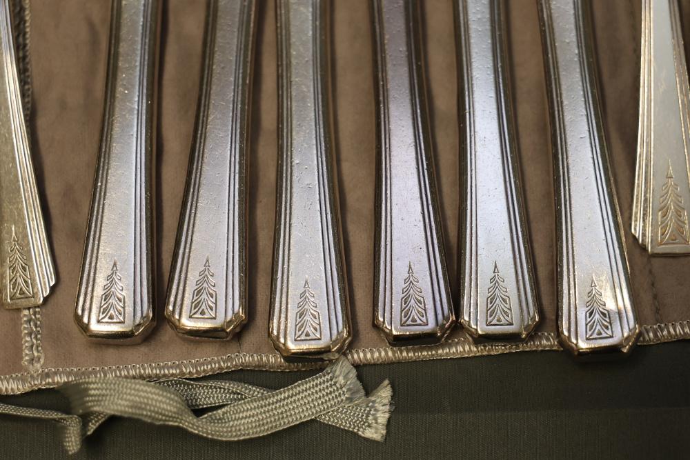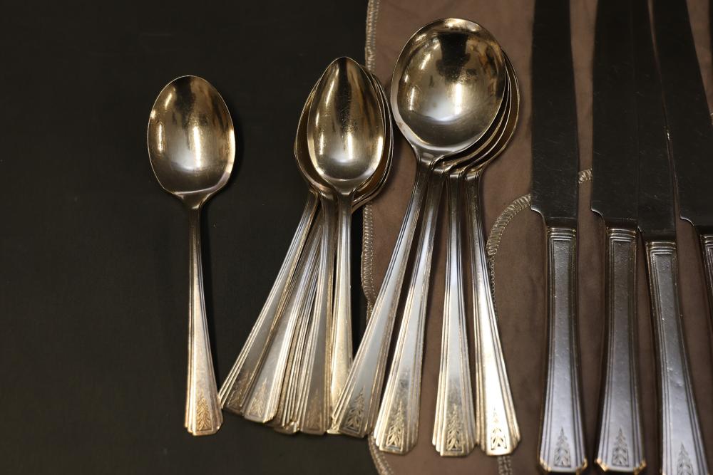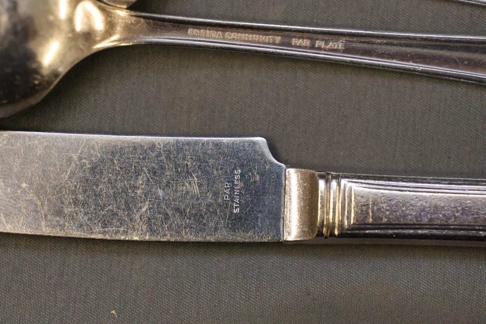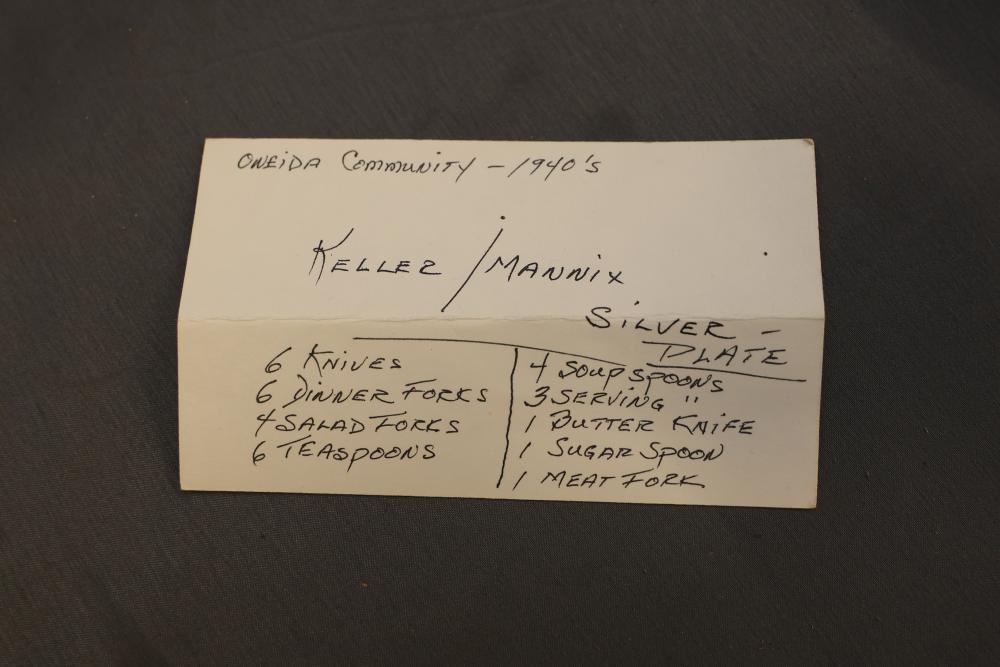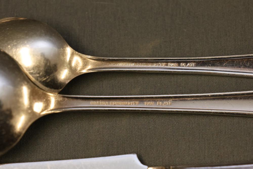 1940s Oneida Community Keller & Mannix Silver-Plated Flatware Set. Includes 6 knives, 6 dinner forks, 6 salad forks, 6 teaspoons, 4 soup spoons, 3 serving pieces, 1 butter knife, 1 sugar spoon, and 1 meat fork. Comes with fabric storage roll as shown in images. Condition shows some wear consistent with age and use. Pickup only.
