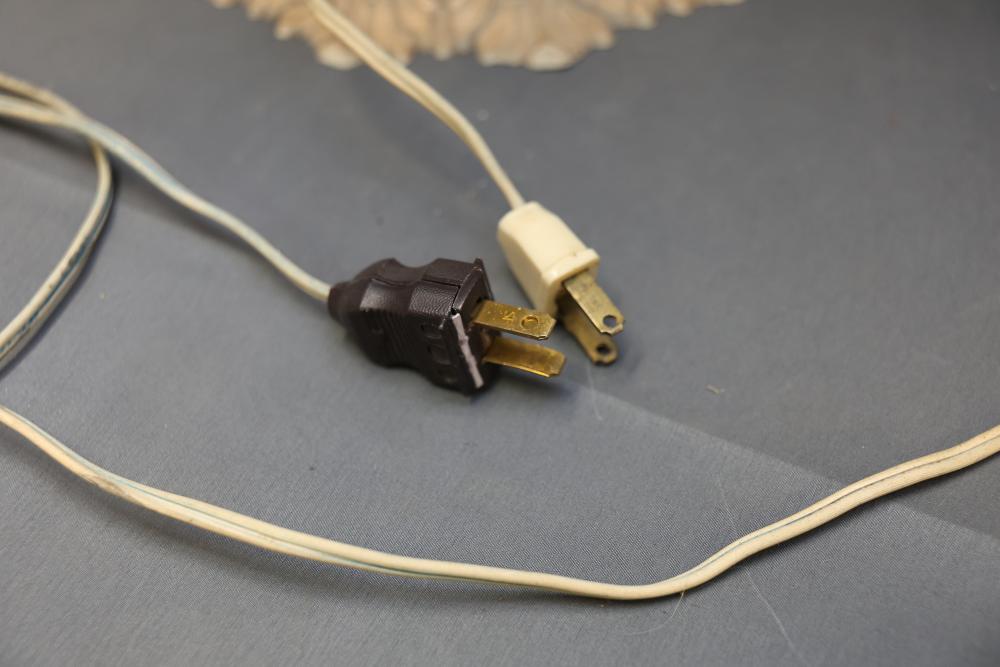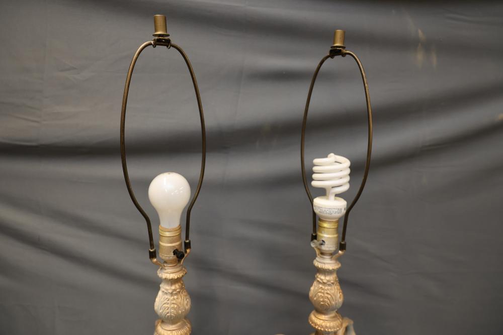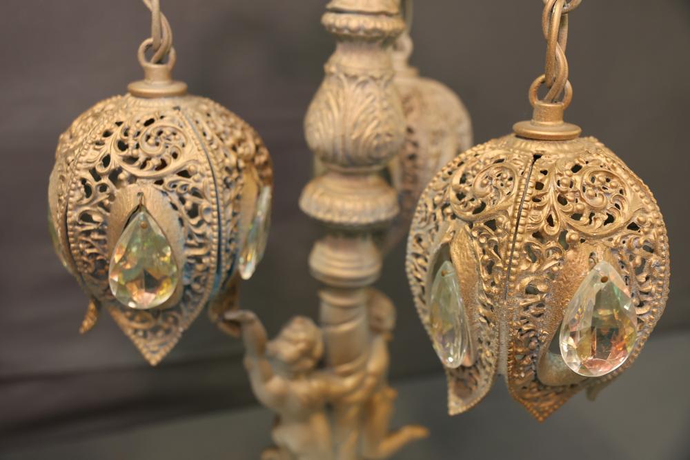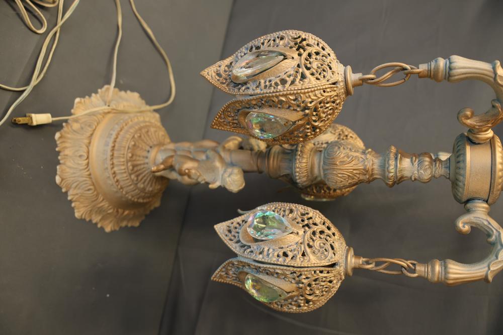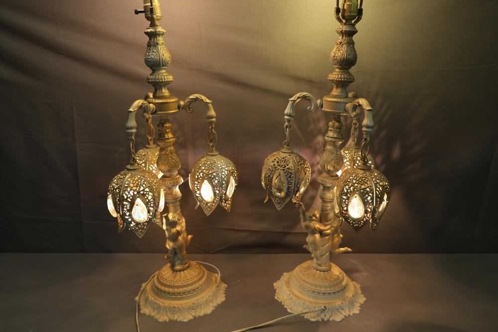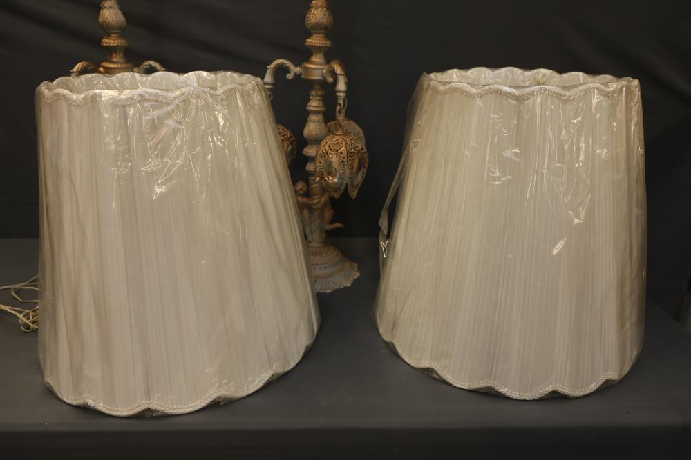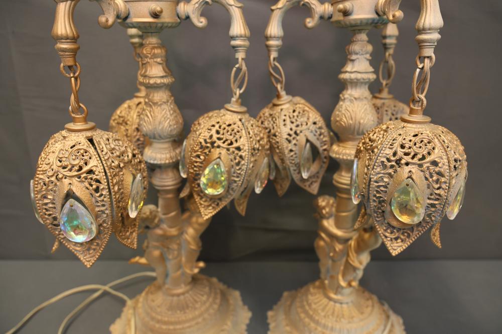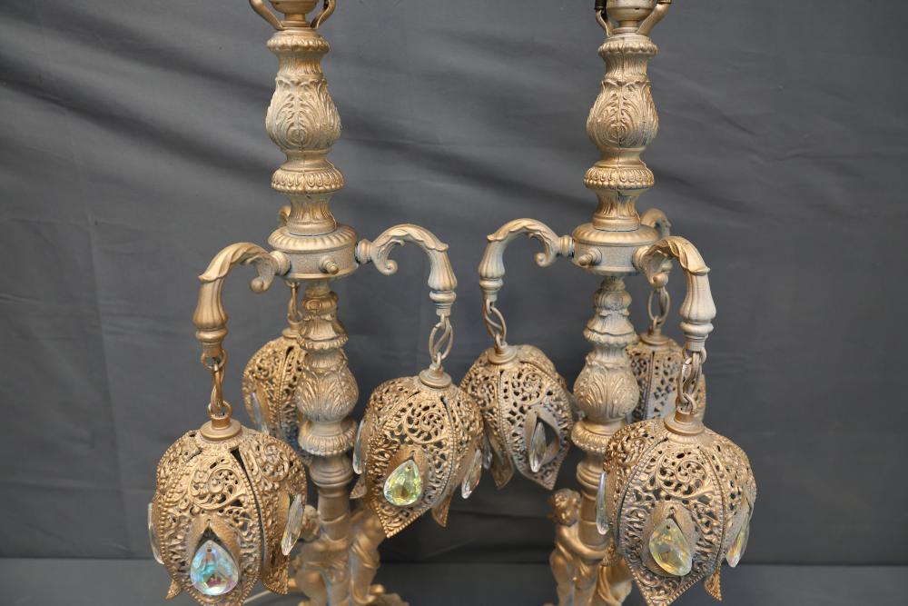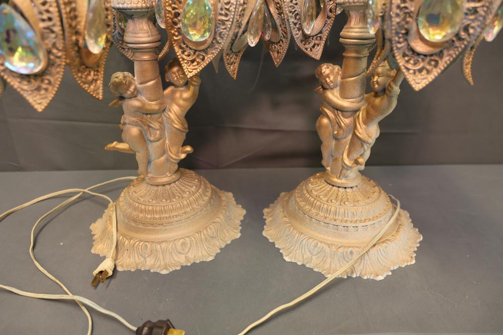 Ornate Brass Lamps With Prismatic Decorations and Shades. Each lamp features detailed brass construction with hanging prismatic decorative elements and ornate bases depicting cherubs. The lamps measure approximately 37 inches tall, including the finials, and come with fabric shades still wrapped in plastic. Some wear and patina consistent with age. Power cords are included. Pickup only.