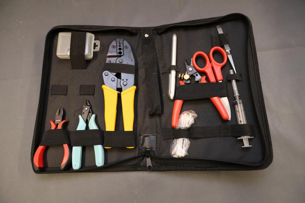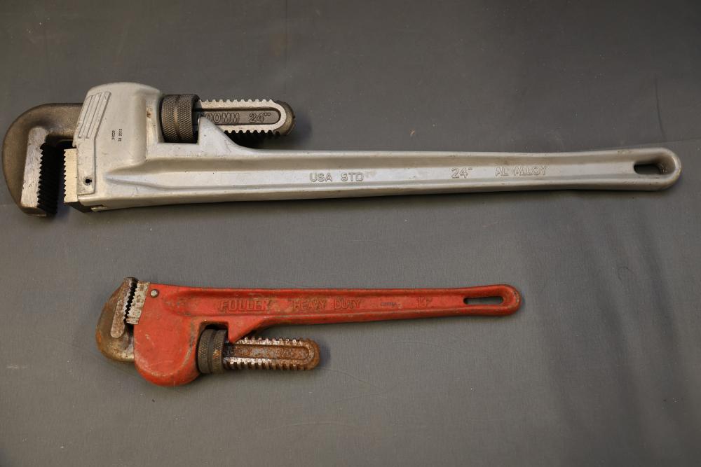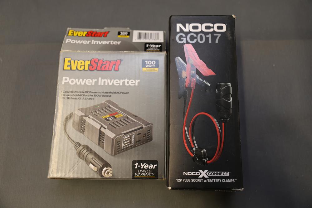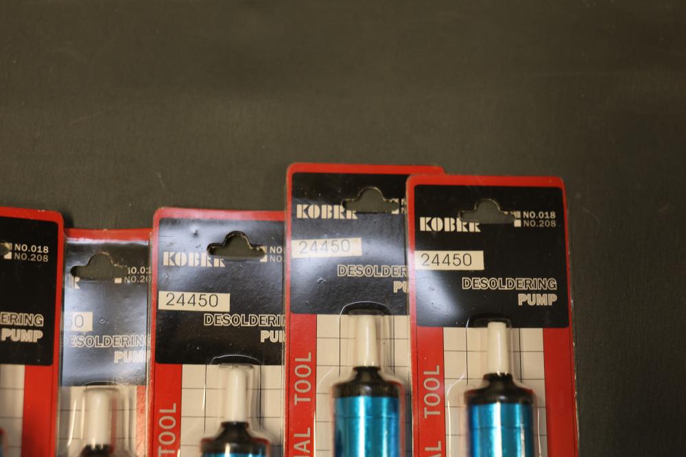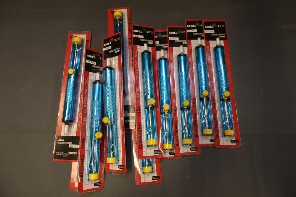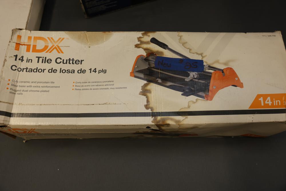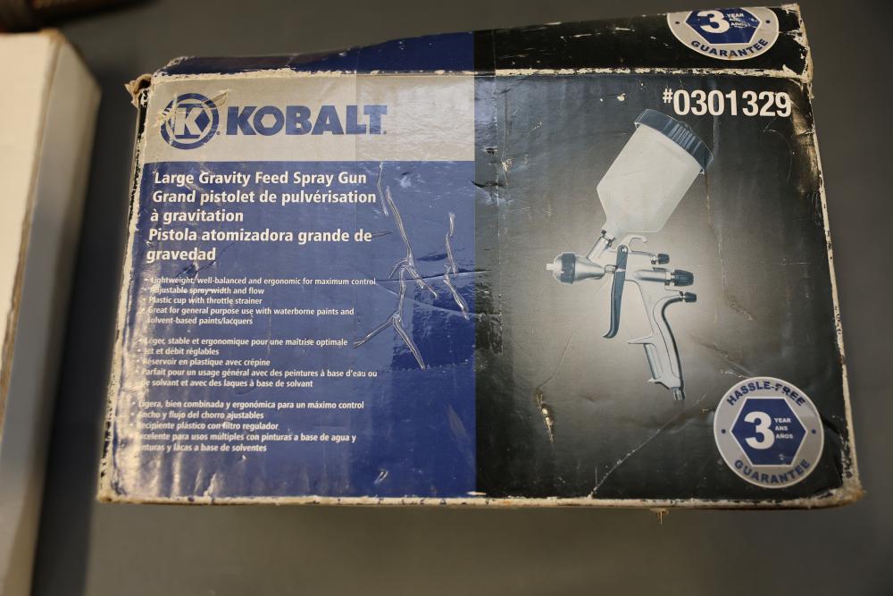 Tools and Equipment Including Tile Cutter and Desoldering Pumps. Includes items such as a hand tool set with case, two pipe wrenches (24-inch aluminum alloy and 14-inch heavy-duty), nine Kobalt-branded desoldering pumps, a 14-inch HDX tile cutter (box shows wear), a Kobalt large gravity feed spray gun (unused, box shows wear), a NOCO jump starter cable, and an EverStart power inverter. Pickup only.