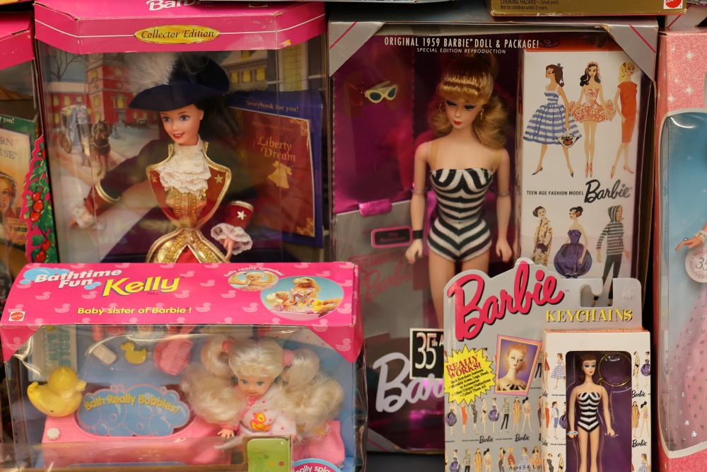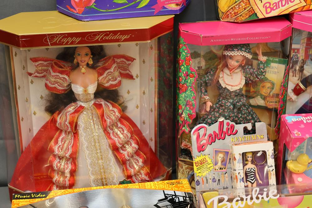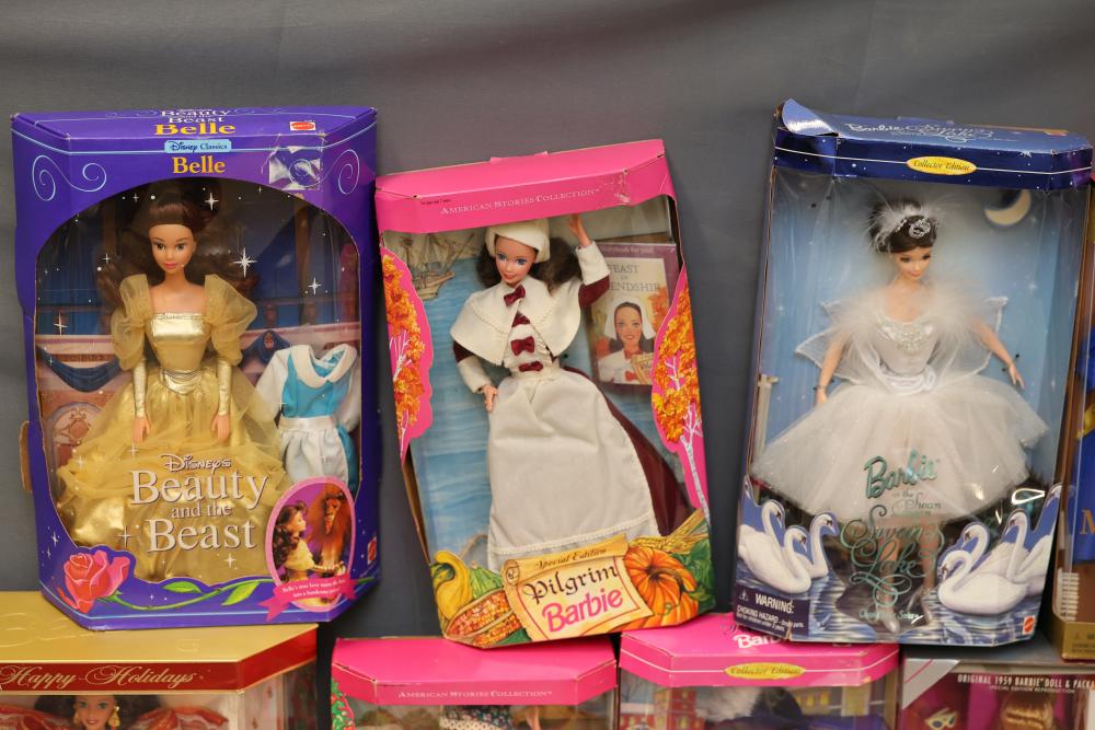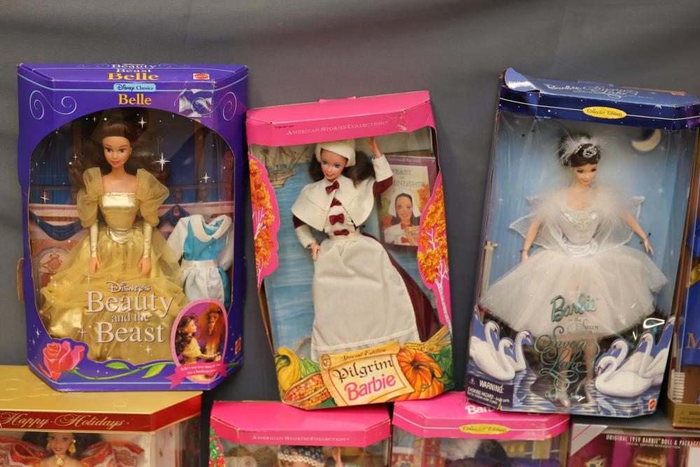 Barbie Dolls and Accessories Featuring 35th Anniversary Editions, Celebration Cake, and Paper Dolls. Group includes multiple boxed Barbie dolls such as 35th Anniversary editions, Celebration Cake set, deluxe paper dolls, and themed dolls including Millennium Grad and Colonial Barbie. Additional includes African-American Princess Imani and Beauty and the Beast items. All items appear to be sealed in their original packaging. Pickup only.
