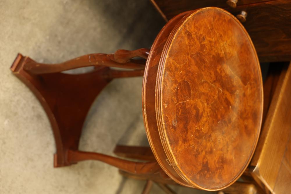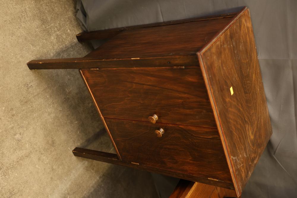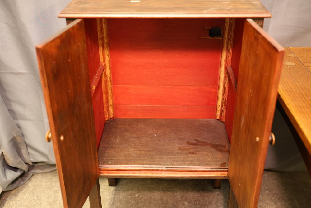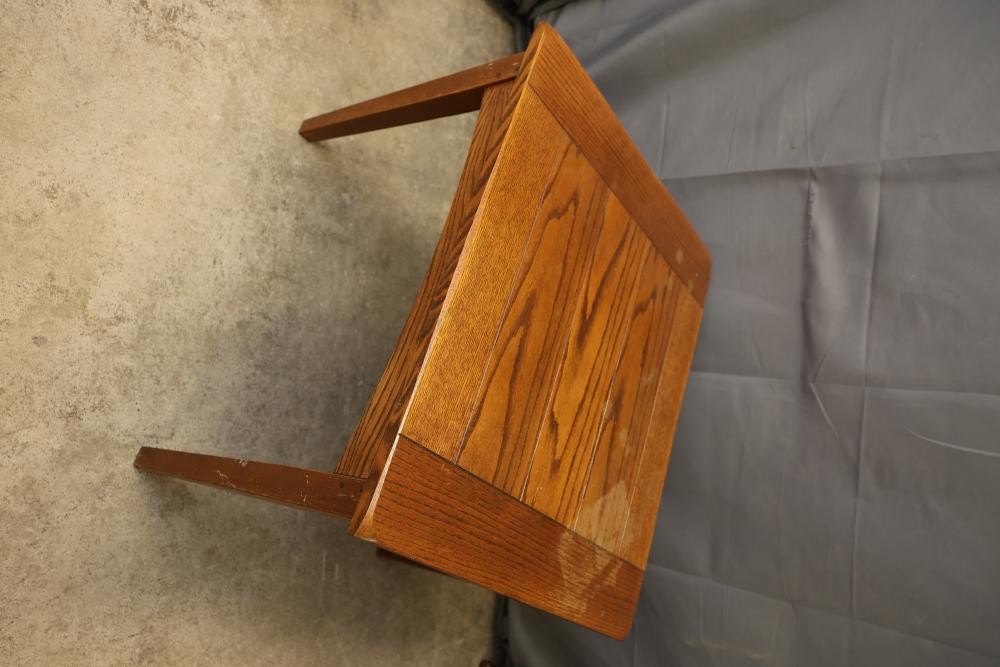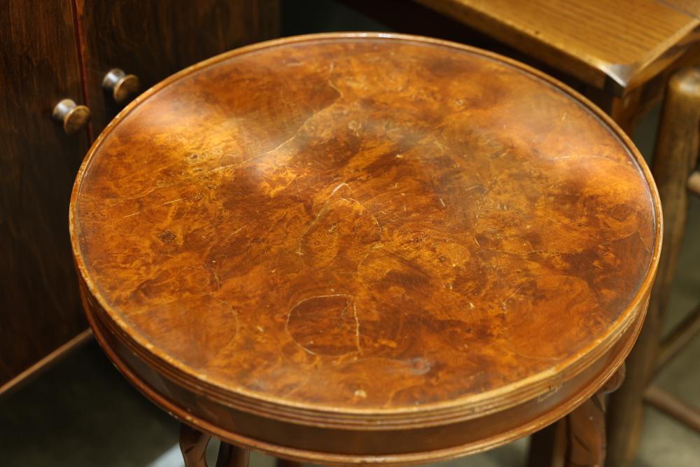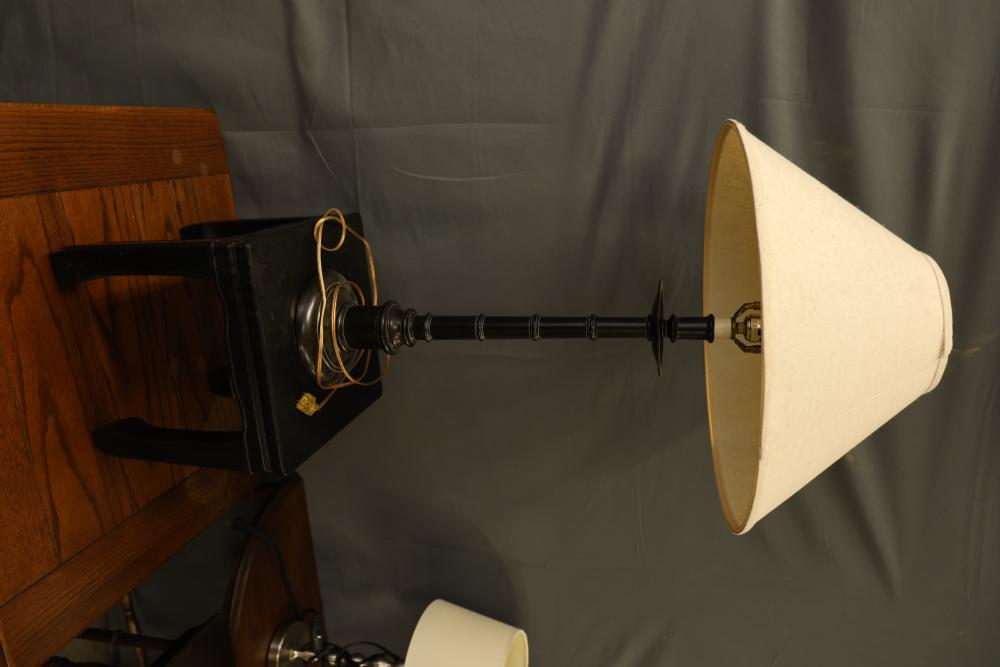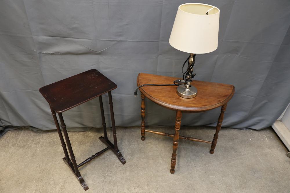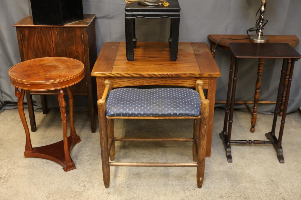 Wooden Tables and Floor Lamps. Includes a variety of wooden furniture pieces, such as a round side table with curved legs, a small cabinet with two doors and red interior, a square table with a woodgrain-patterned top, a black lacquered table with a tall lamp, and other accent tables. Pickup only.