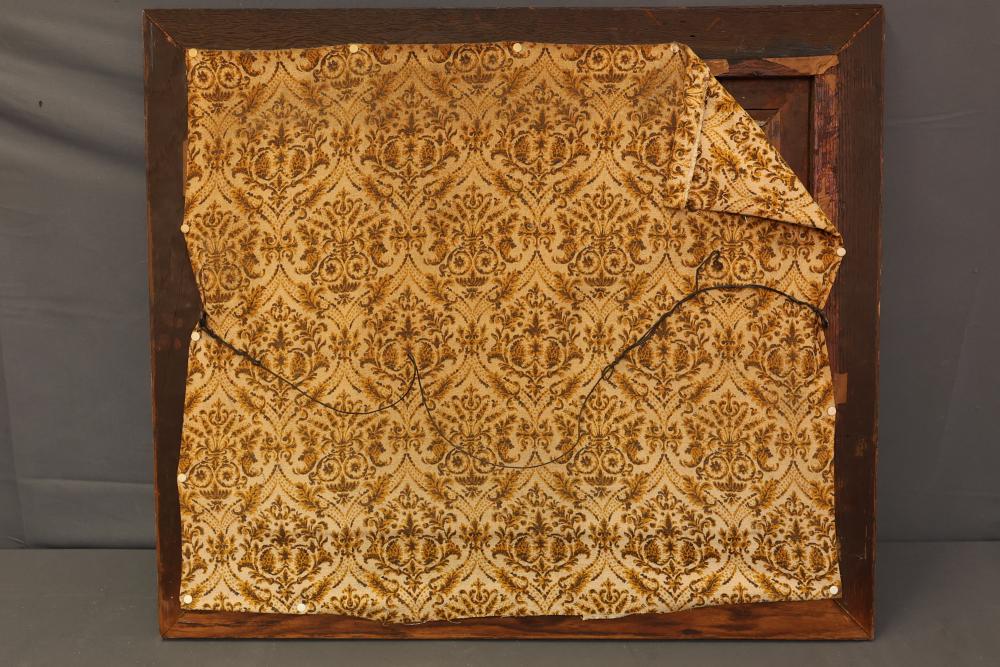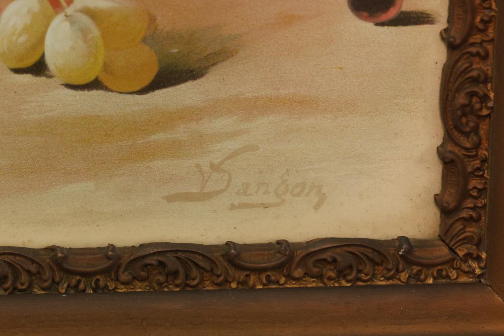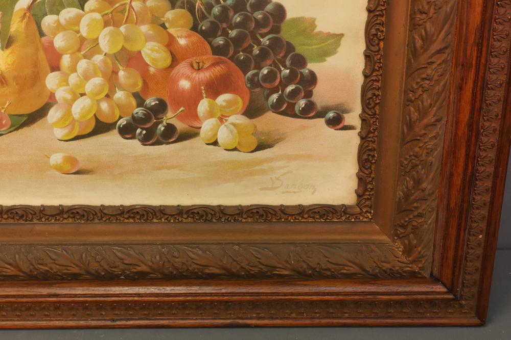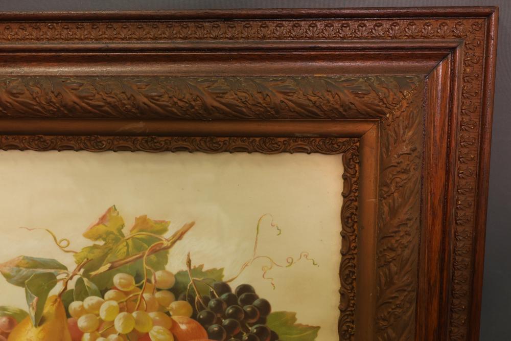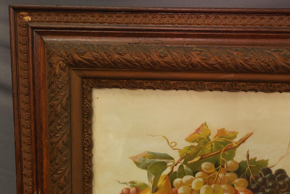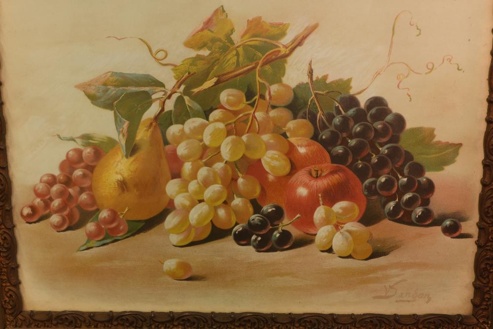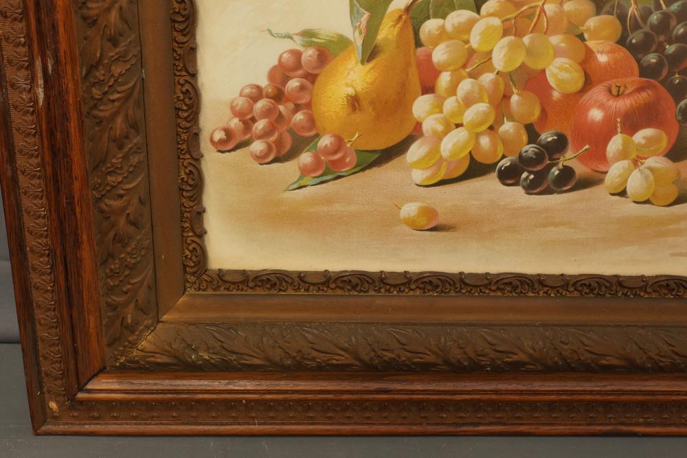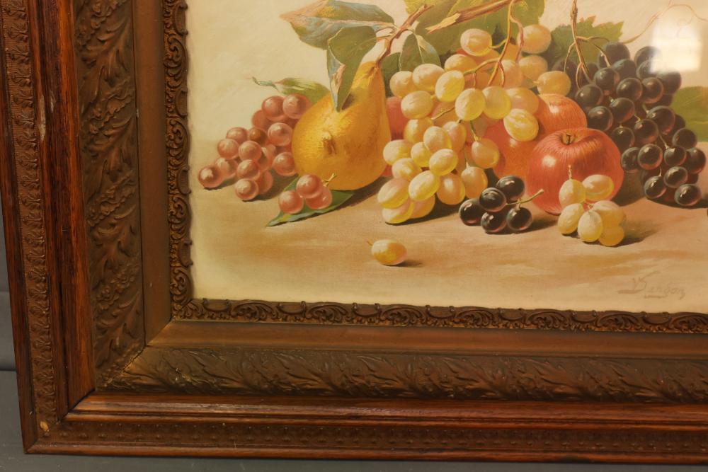 Framed still life painting of fruit signed 'Sanbon.' The central composition depicts a vibrant arrangement of grapes, apples, and a pear. The artwork is housed in a detailed wooden frame featuring carved decorative details along the edges. 32"x27.5". Pickup only.