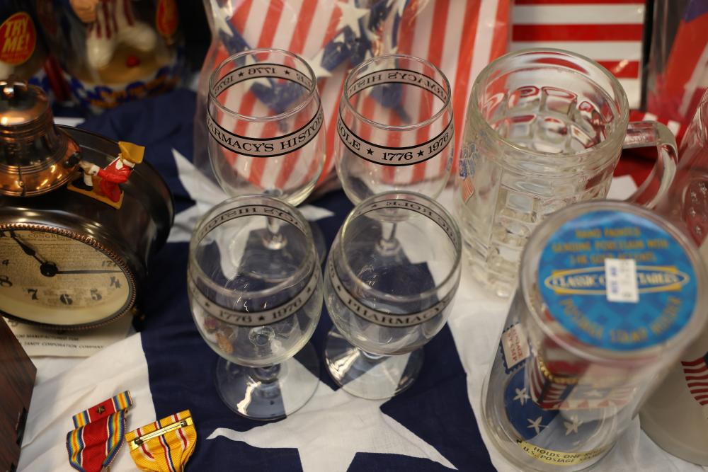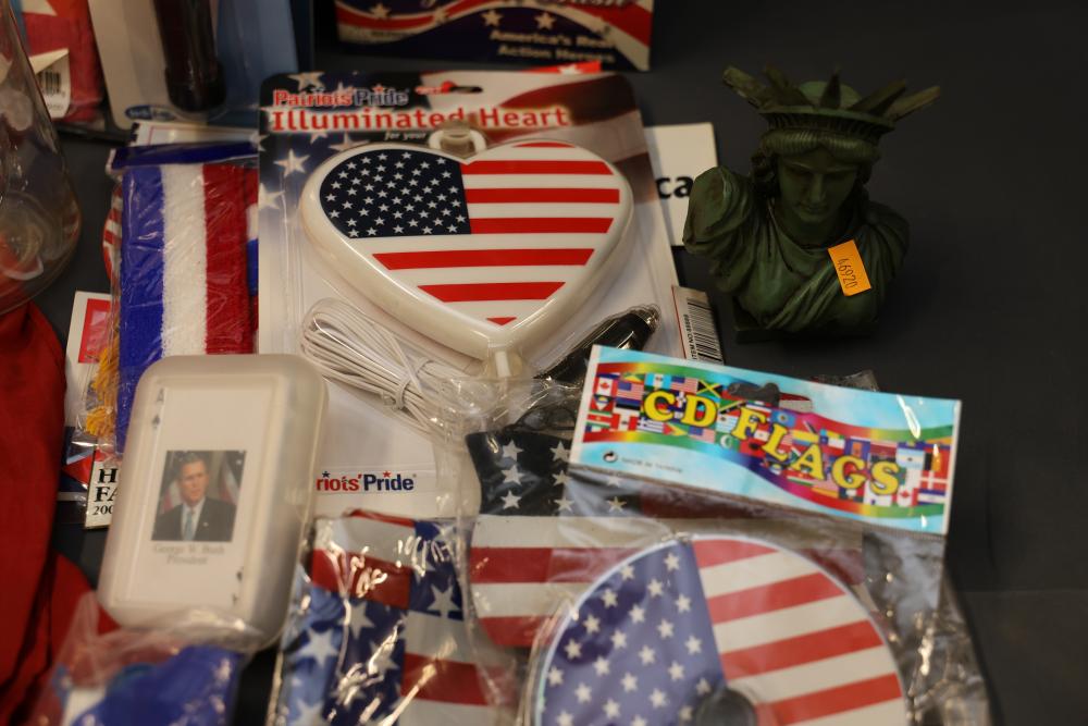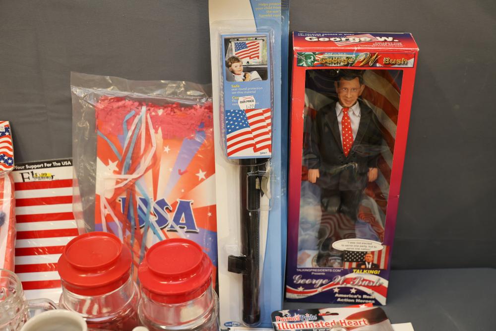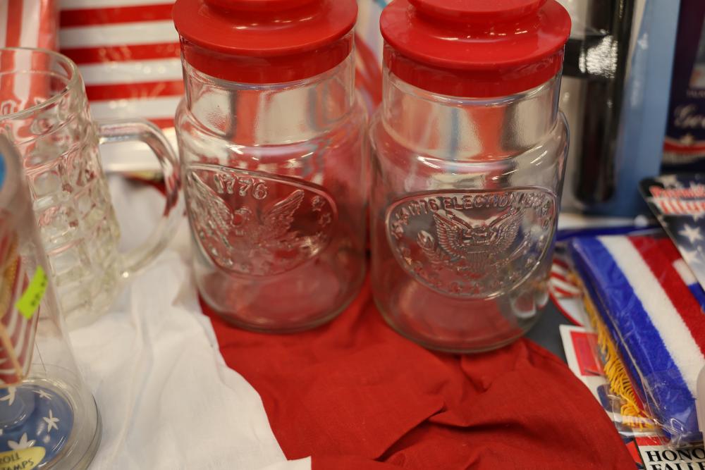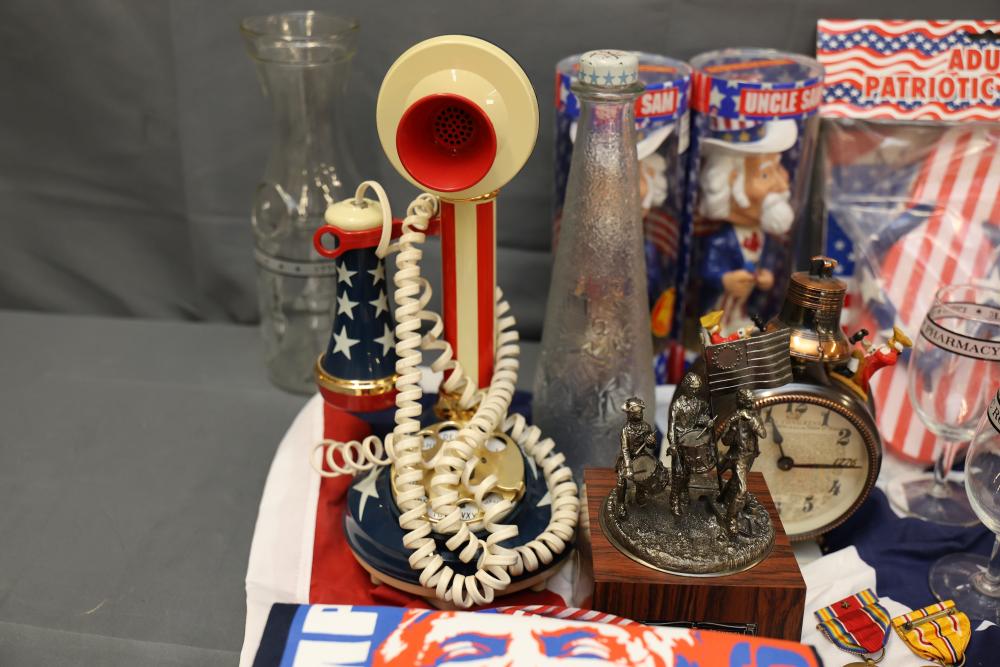 Patriotic Memorabilia Including Figurines, Glassware, and Apparel. This collection features national-themed items such as mugs, glass jars, decorative figurines, apparel, home decor items, and novelty pieces. Some items include commemorative glassware, a patriotic rotary phone replica, and souvenirs featuring U.S. presidents and symbols. Pickup only.