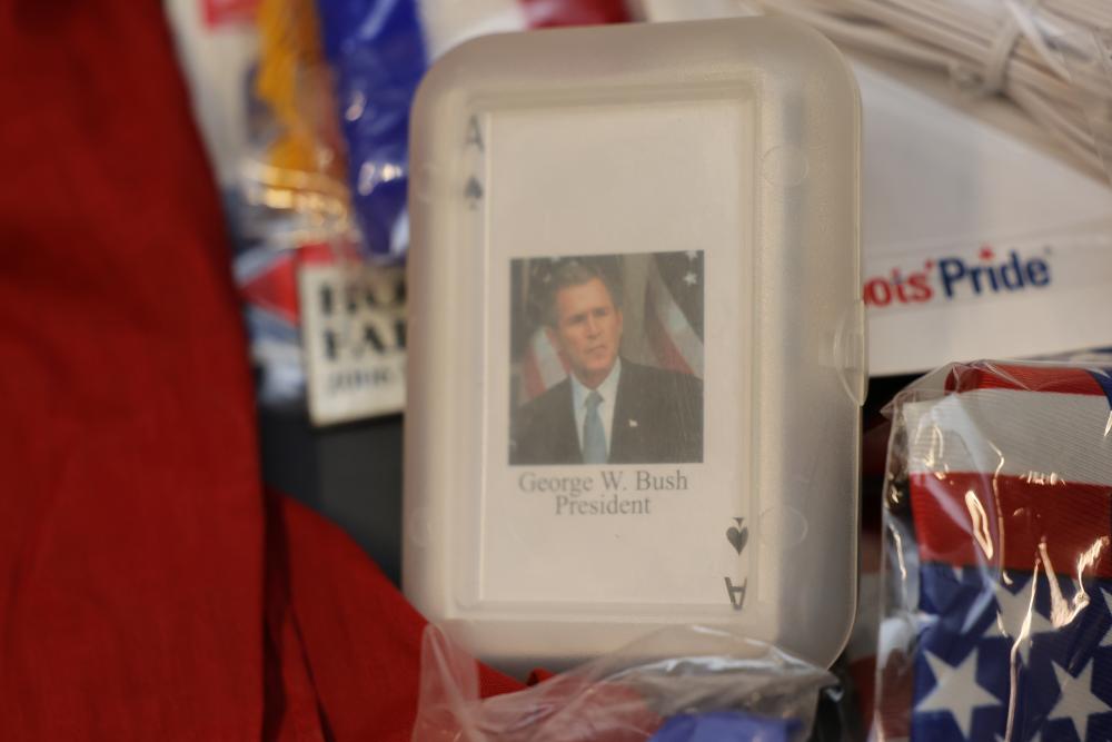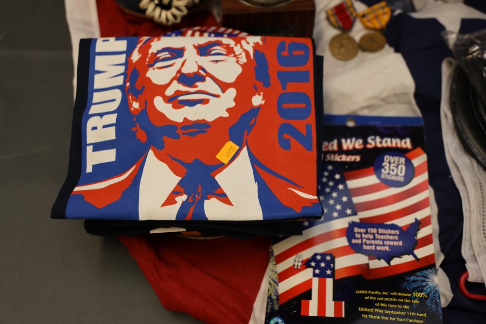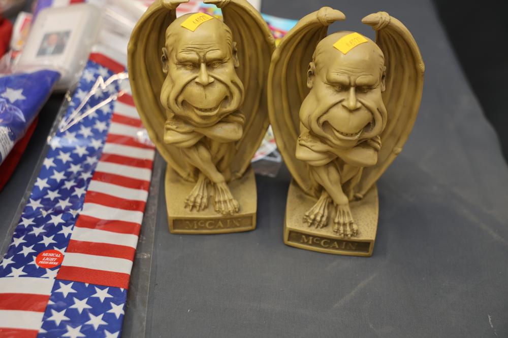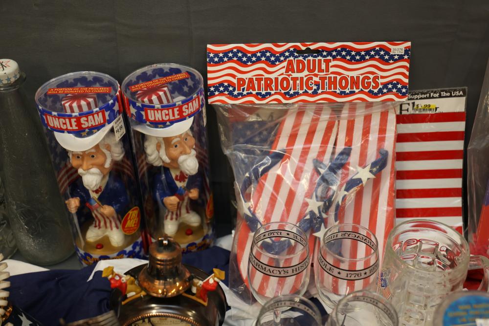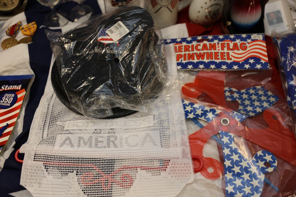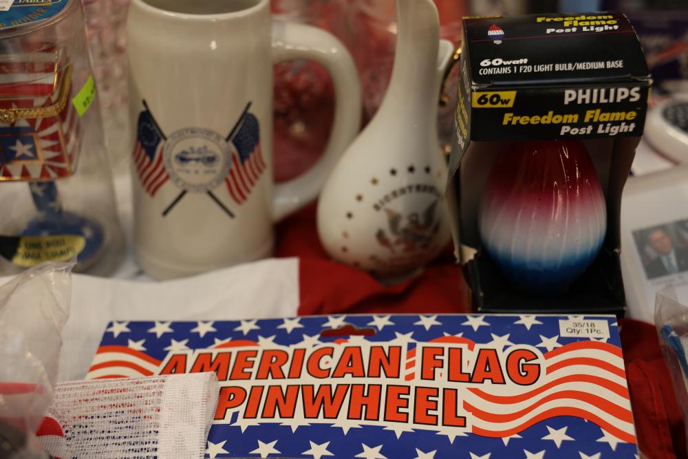 Patriotic Memorabilia Including Figurines, Glassware, and Apparel. This collection features national-themed items such as mugs, glass jars, decorative figurines, apparel, home decor items, and novelty pieces. Some items include commemorative glassware, a patriotic rotary phone replica, and souvenirs featuring U.S. presidents and symbols. Pickup only.