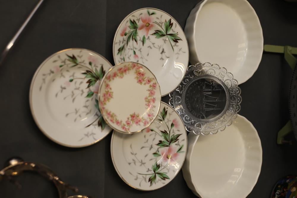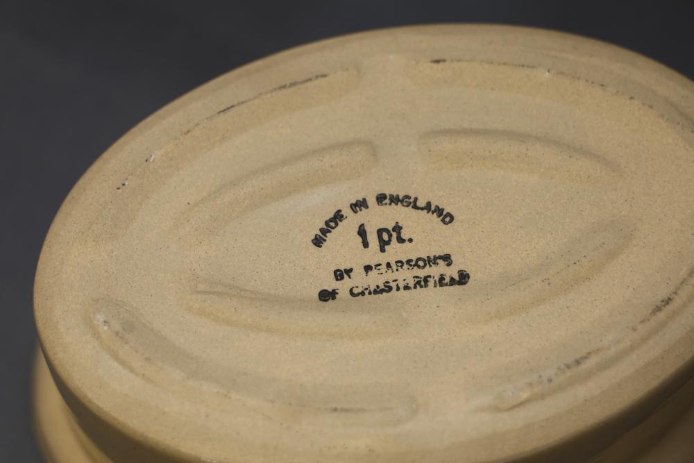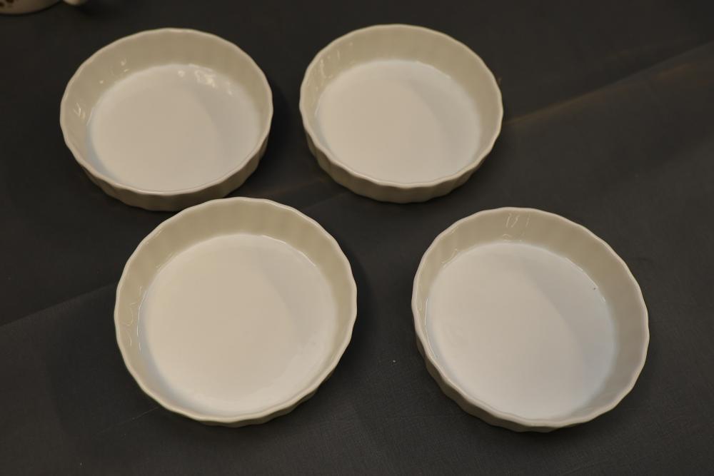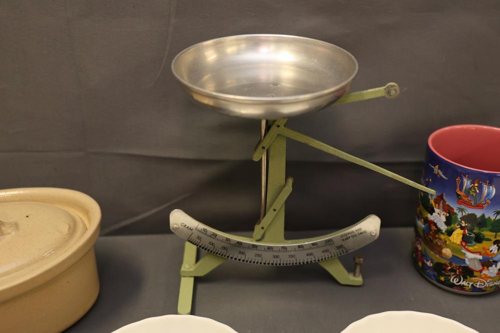 Ceramic bakeware dishes, decorative floral-pattern plates, a lidded 1-pint stoneware dish marked "Pearsons of Chesterfield," two mugs (one Disney-themed, one featuring "Willkommen" design), ornate metal serving utensils, and a vintage-style scale. Items display signs of use, and condition varies. Pickup only.