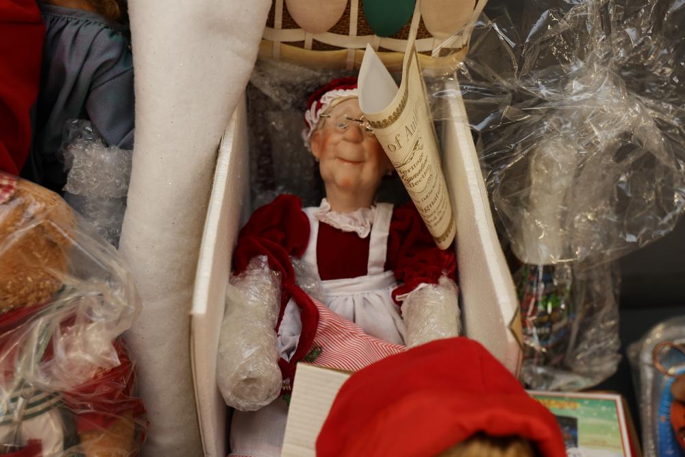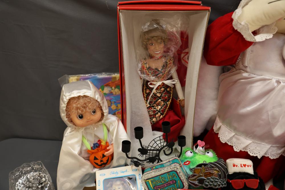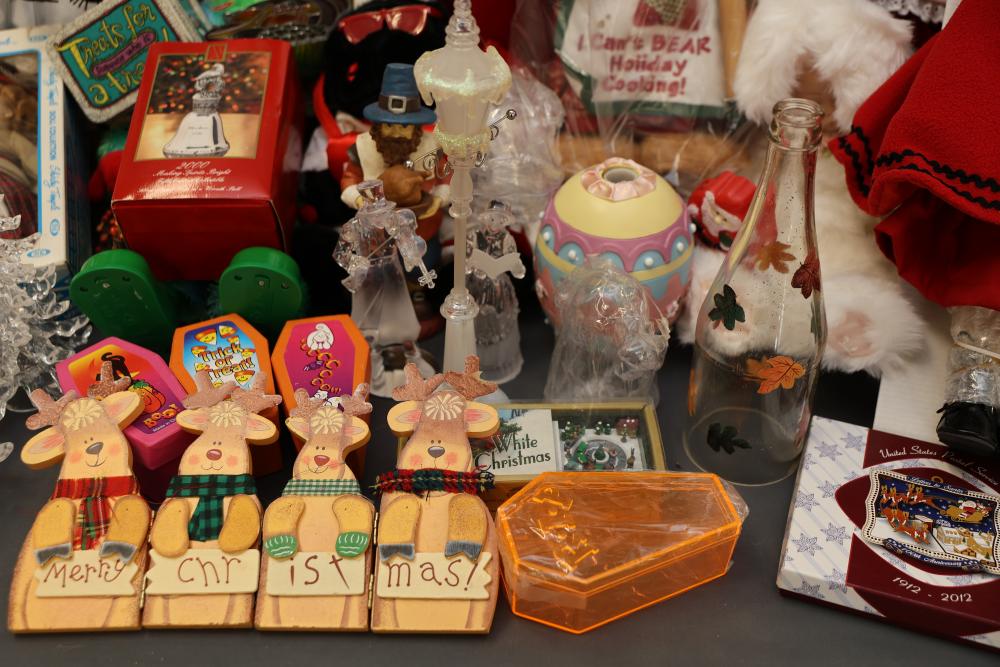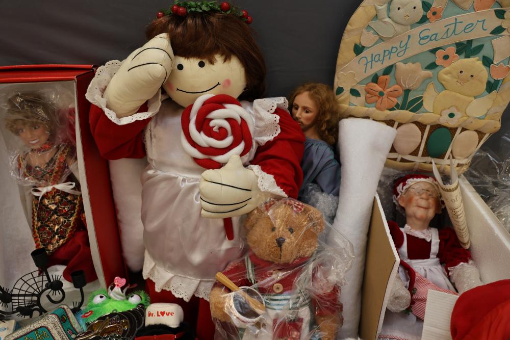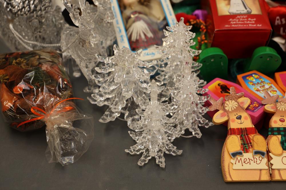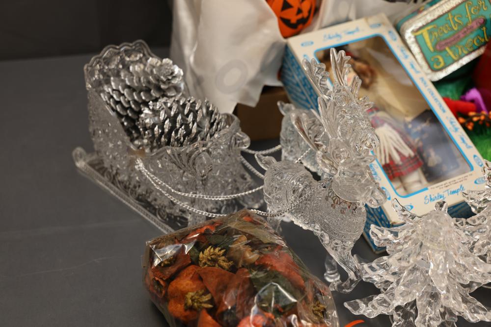 Christmas and holiday-themed decorations and dolls. Includes collectible dolls, glass figurines, holiday ornaments, plush toys, and decorative items. Some items are in original packaging. Various materials, including glass, fabric, and plastic. Pickup only.