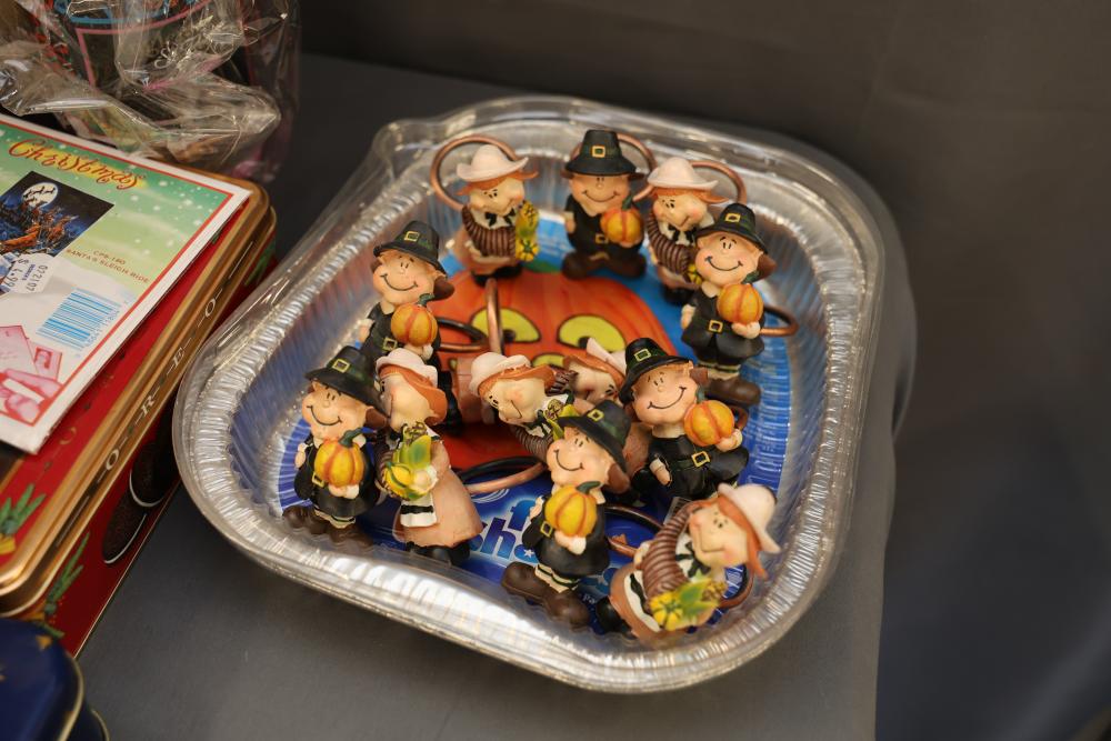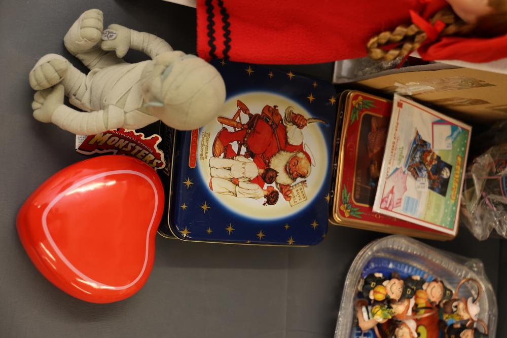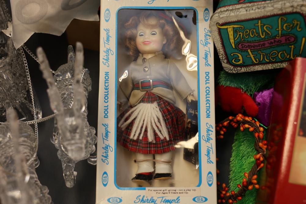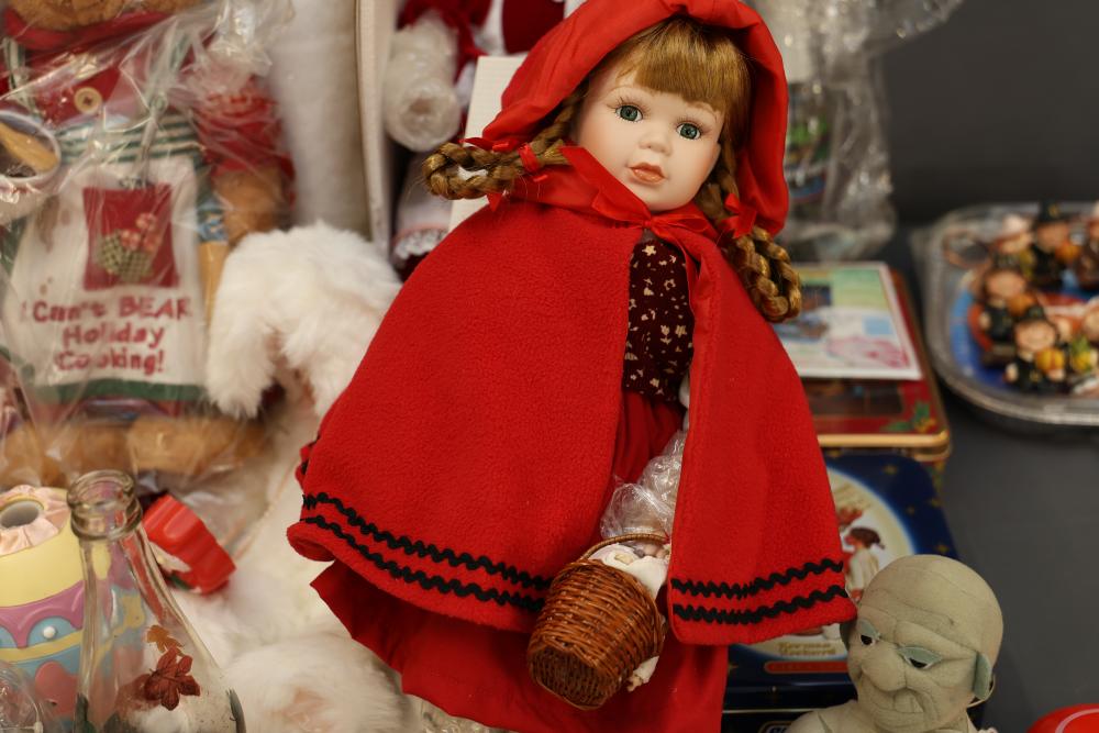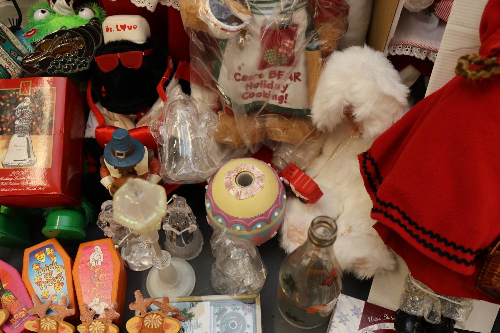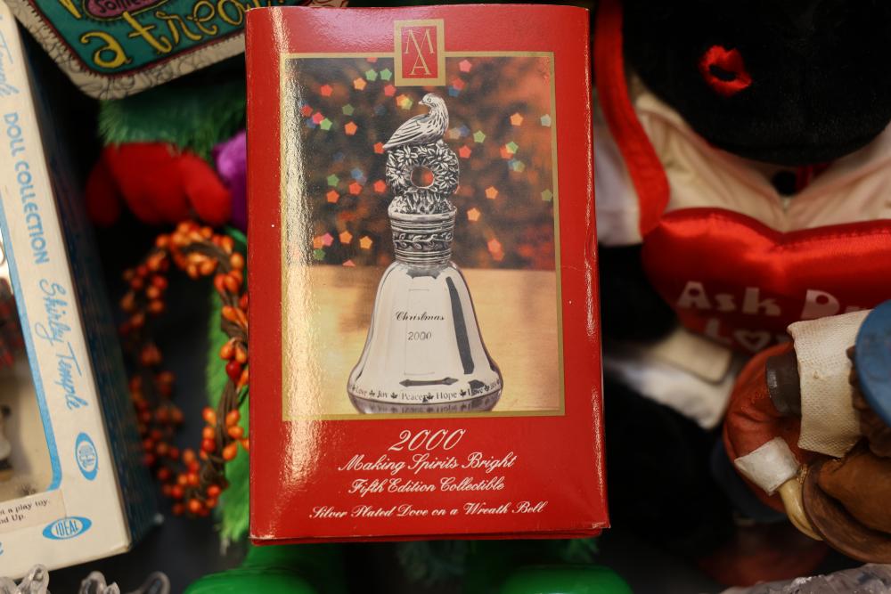 Christmas and holiday-themed decorations and dolls. Includes collectible dolls, glass figurines, holiday ornaments, plush toys, and decorative items. Some items are in original packaging. Various materials, including glass, fabric, and plastic. Pickup only.