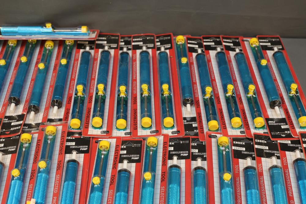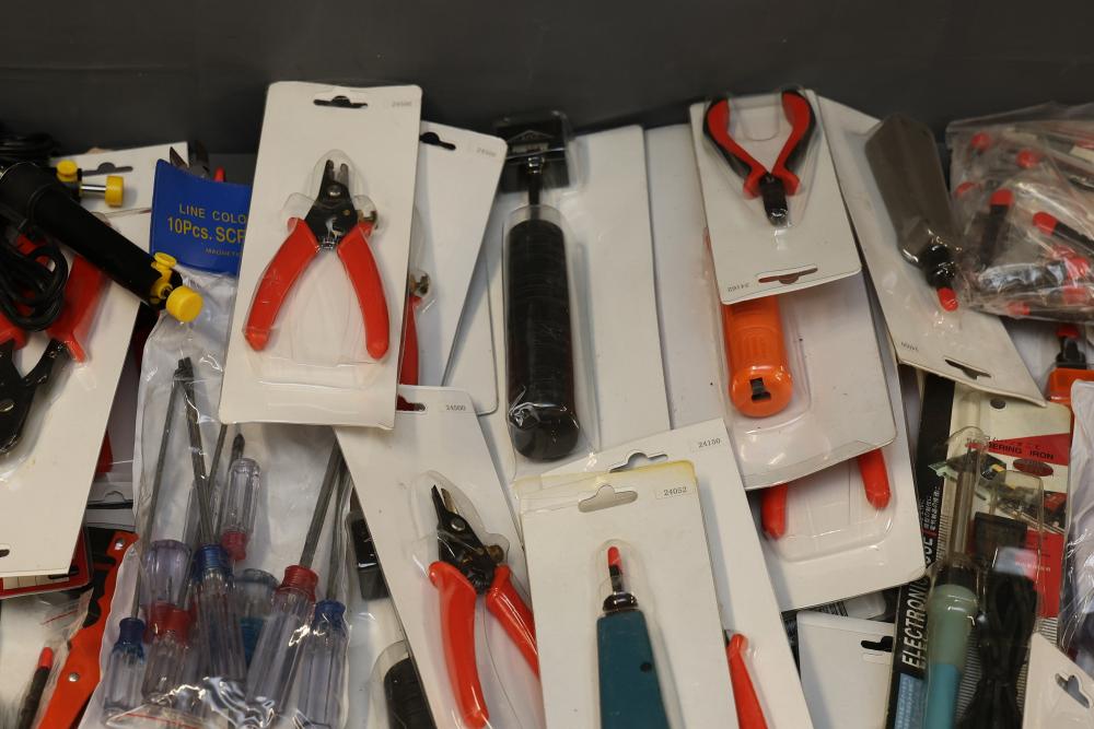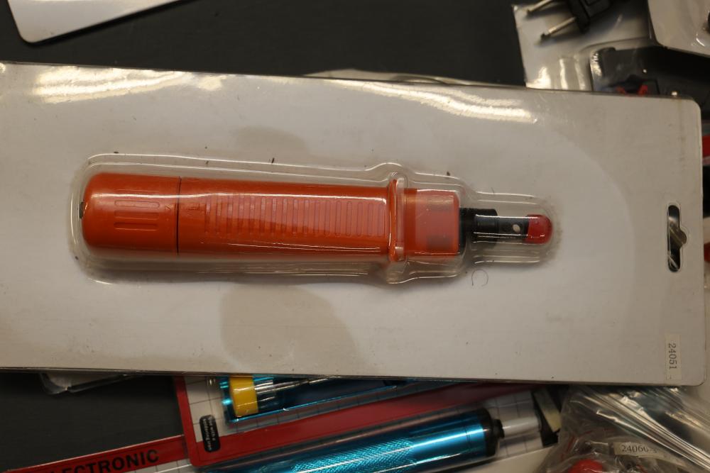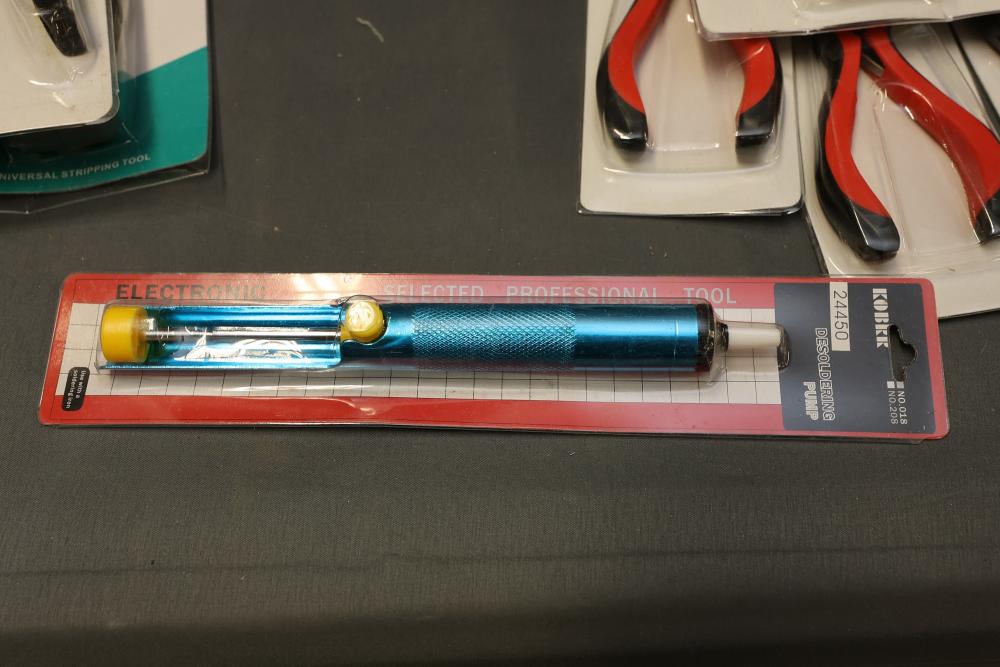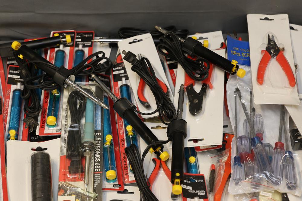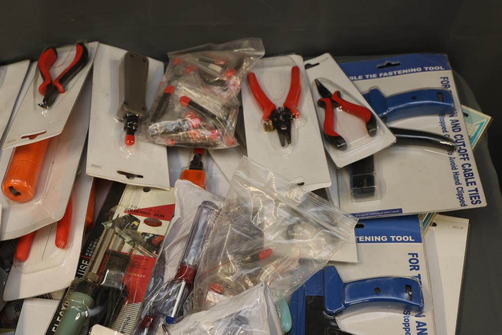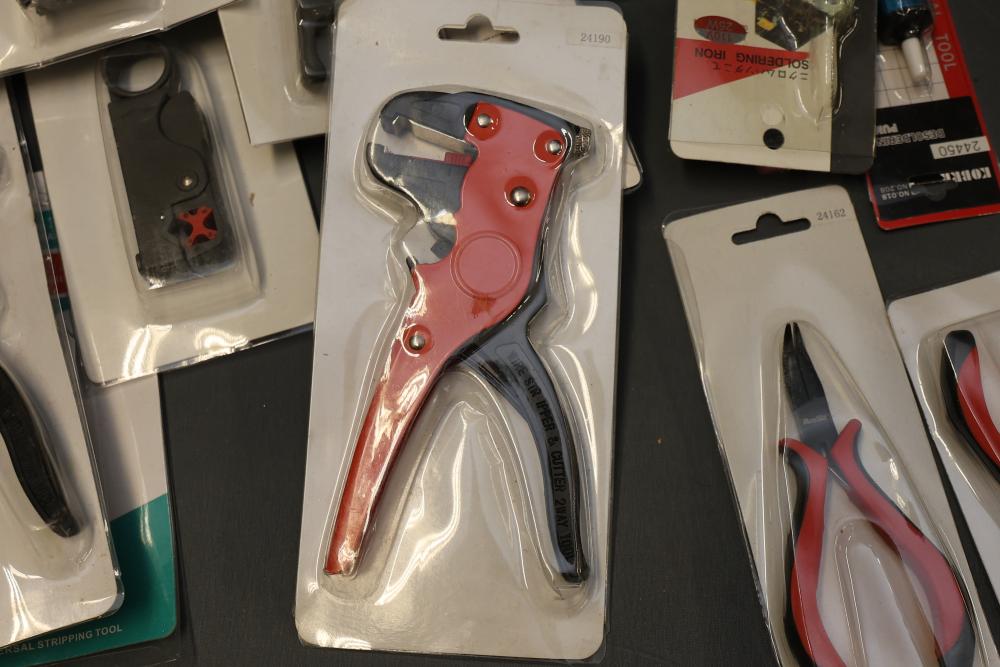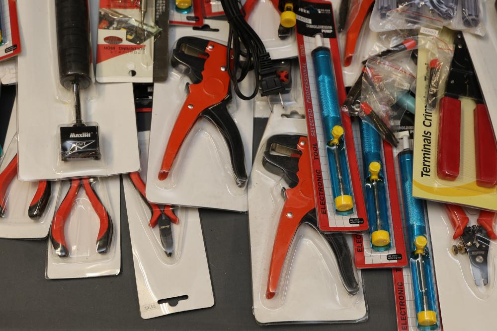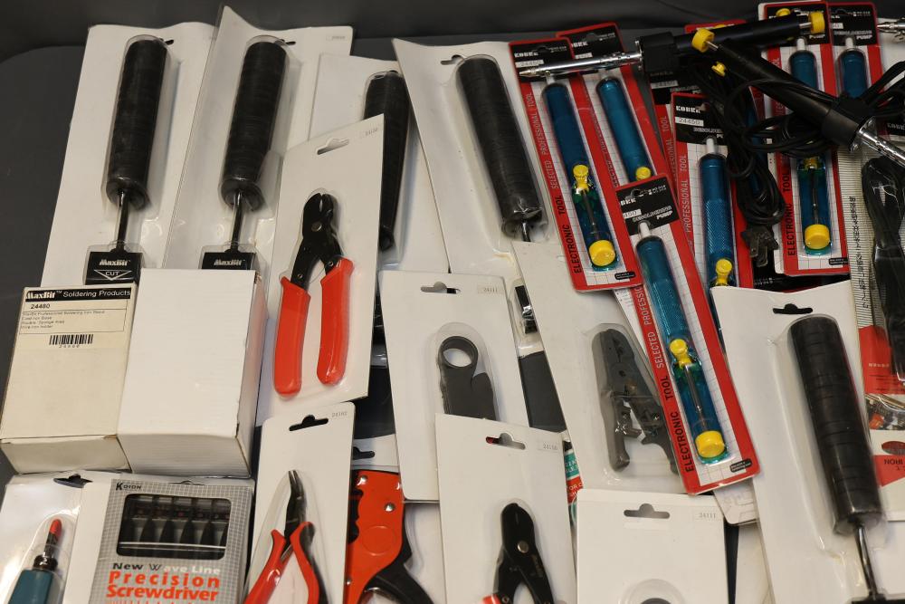 Hand tools including terminal crimping tools, soldering irons, cable tie fastening tools, precision screwdrivers, desoldering pumps, wire strippers, and pliers. Items are blister-packed and suited for electronics or general tool applications. Pickup only.
