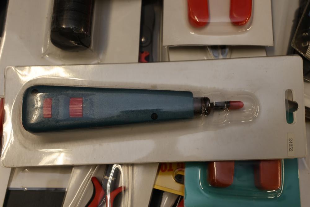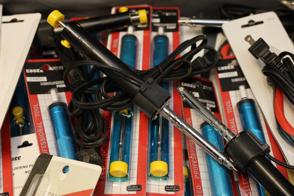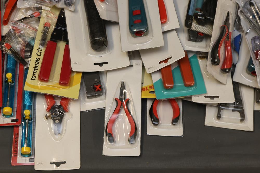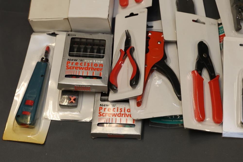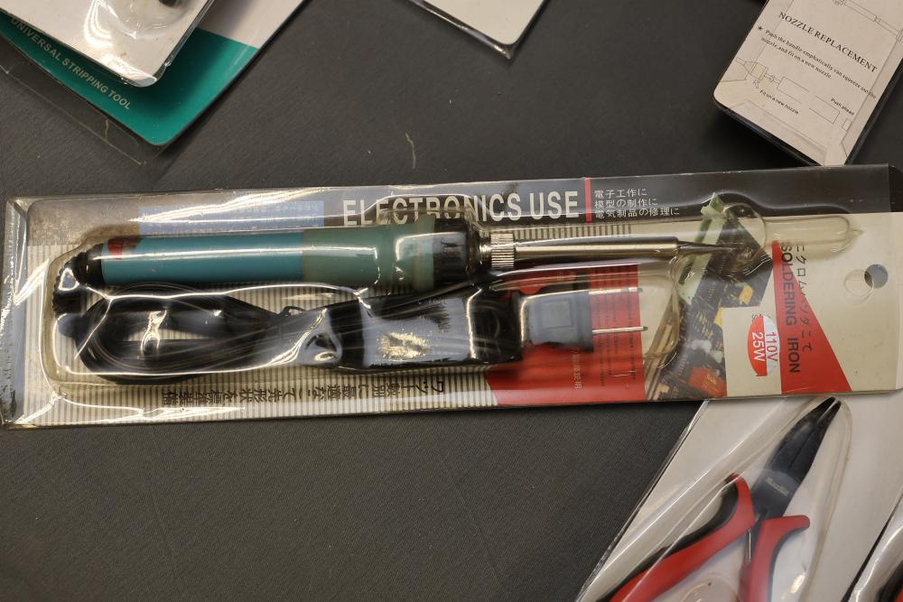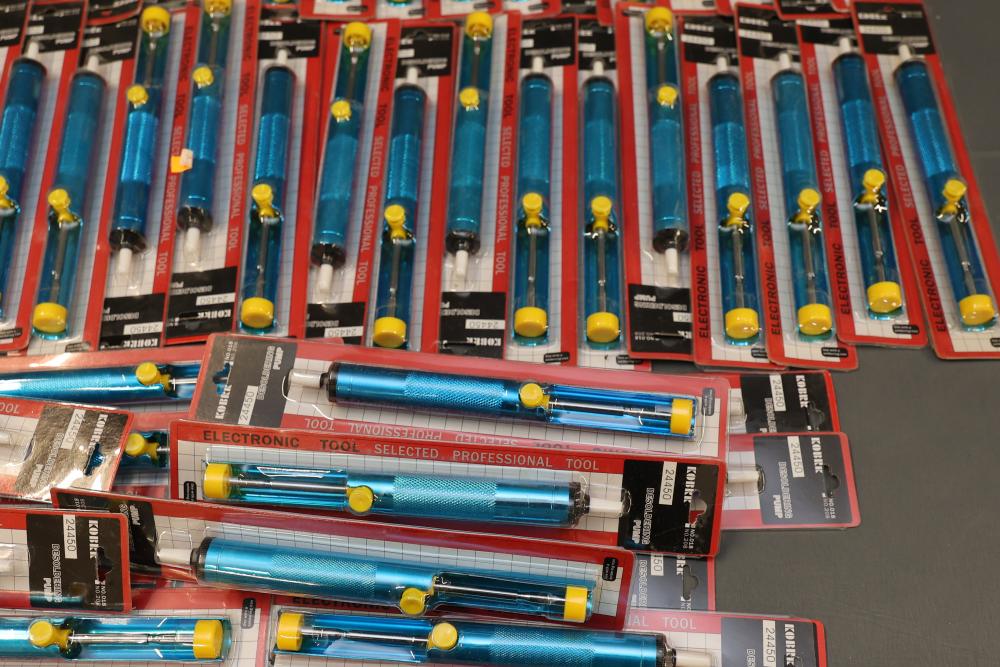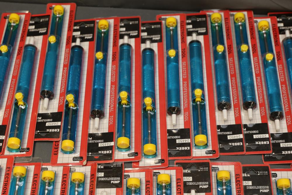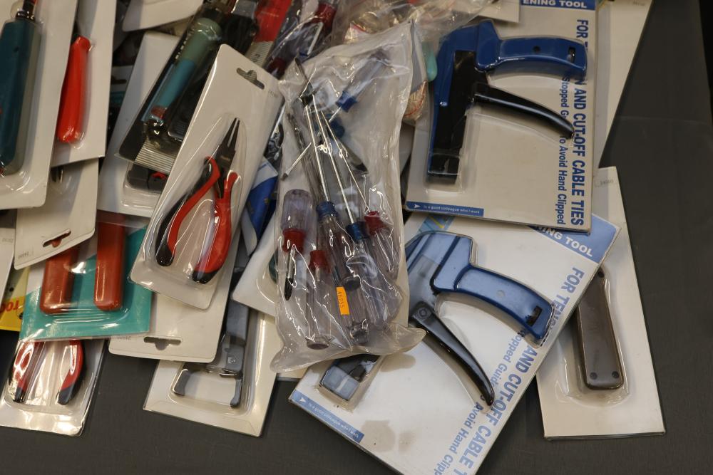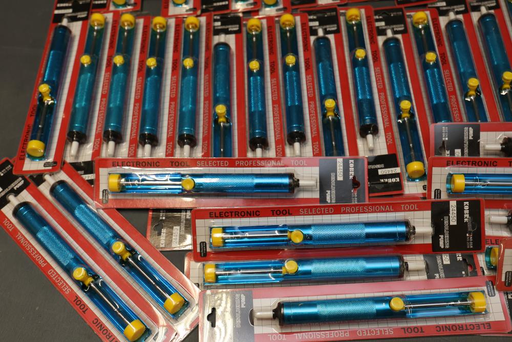 Hand tools including terminal crimping tools, soldering irons, cable tie fastening tools, precision screwdrivers, desoldering pumps, wire strippers, and pliers. Items are blister-packed and suited for electronics or general tool applications. Pickup only.