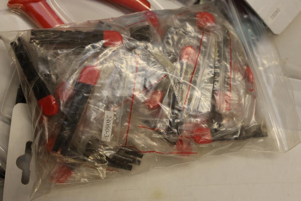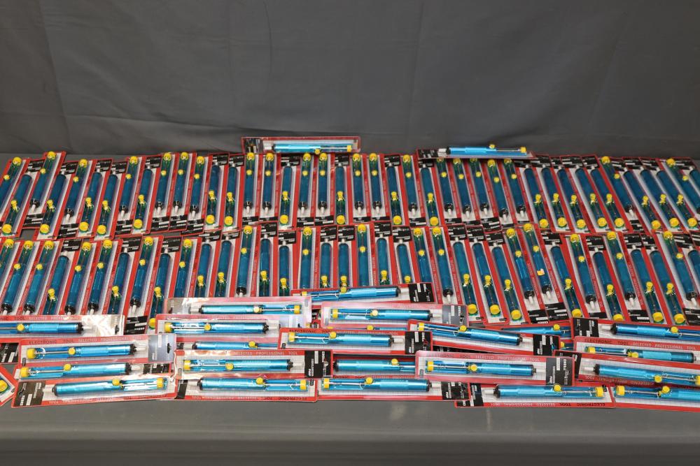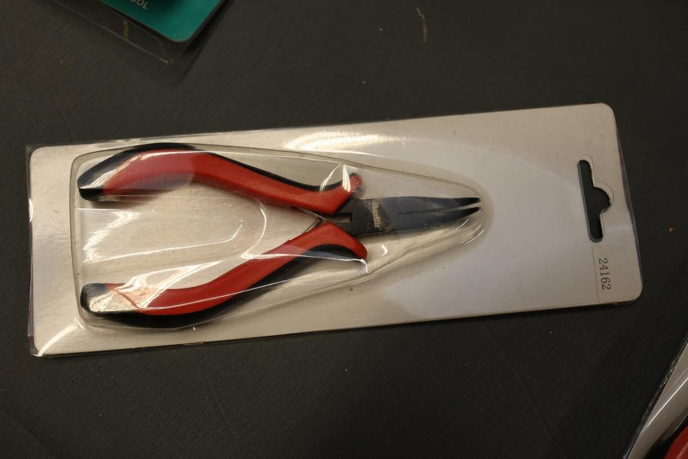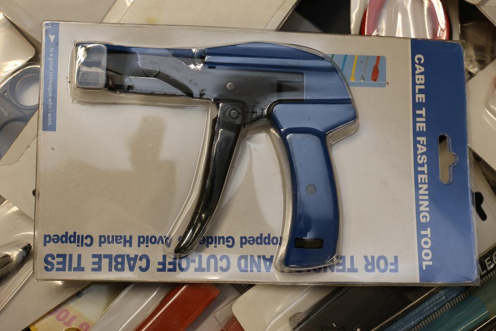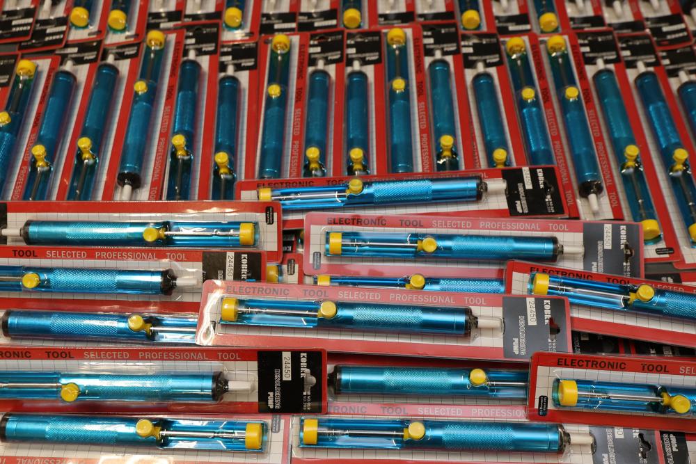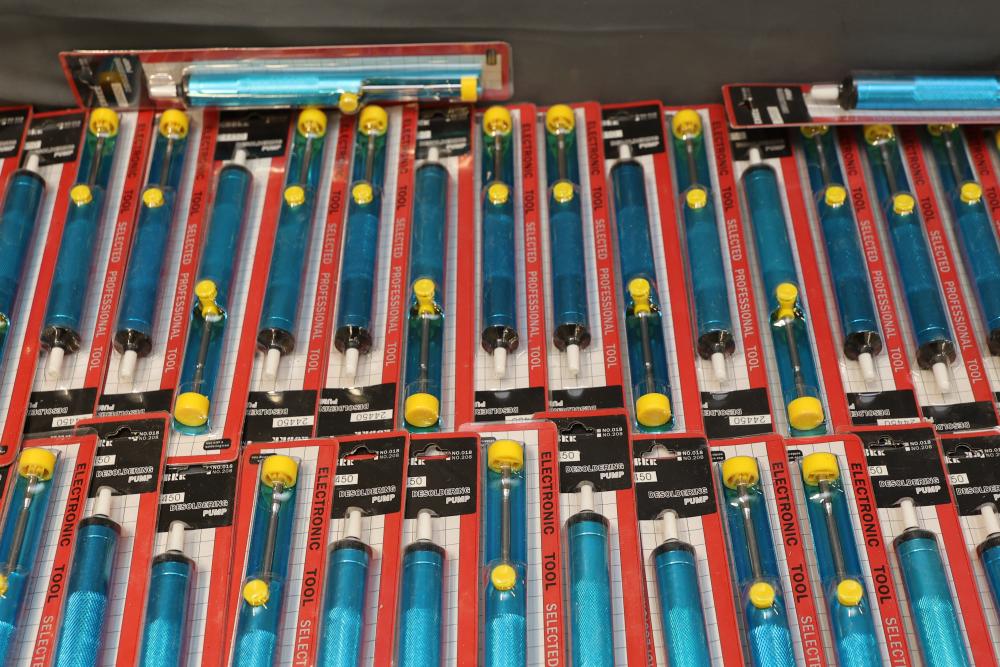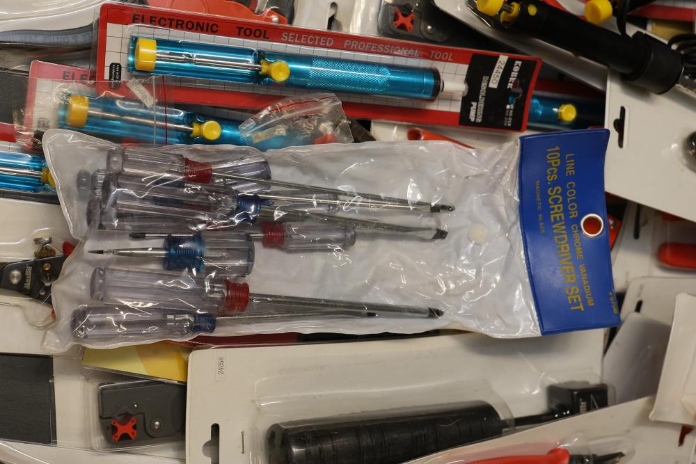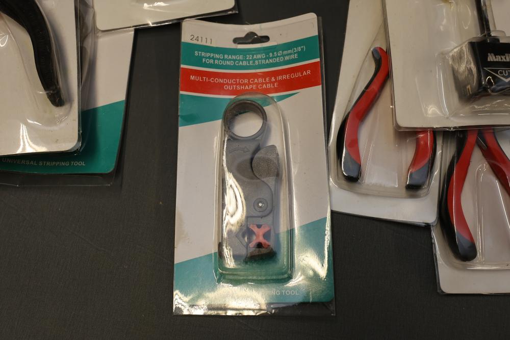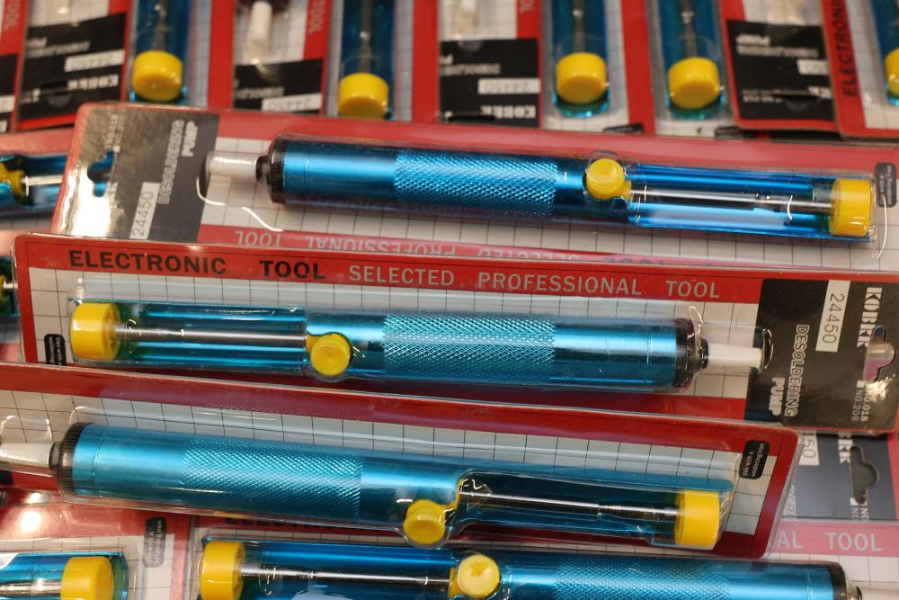 Hand tools including terminal crimping tools, soldering irons, cable tie fastening tools, precision screwdrivers, desoldering pumps, wire strippers, and pliers. Items are blister-packed and suited for electronics or general tool applications. Pickup only.