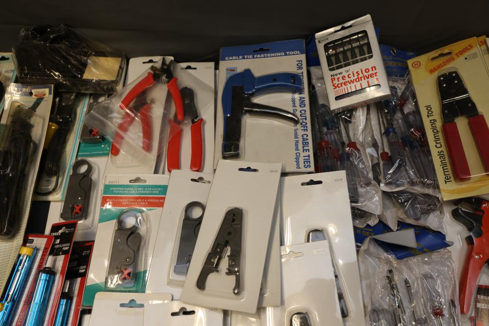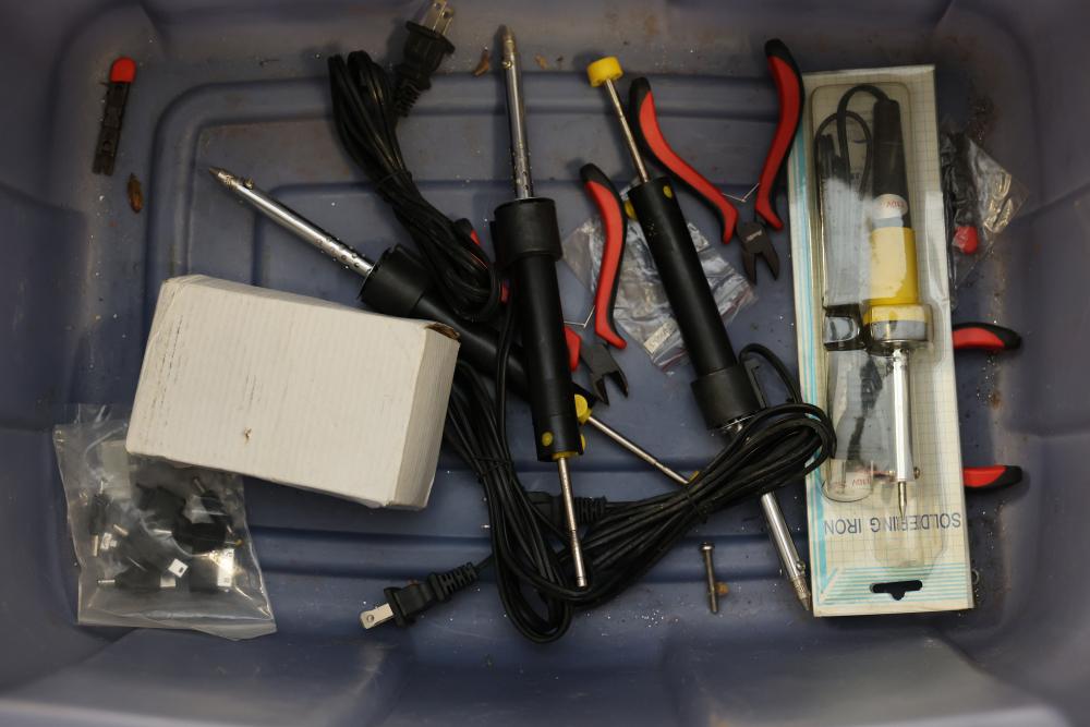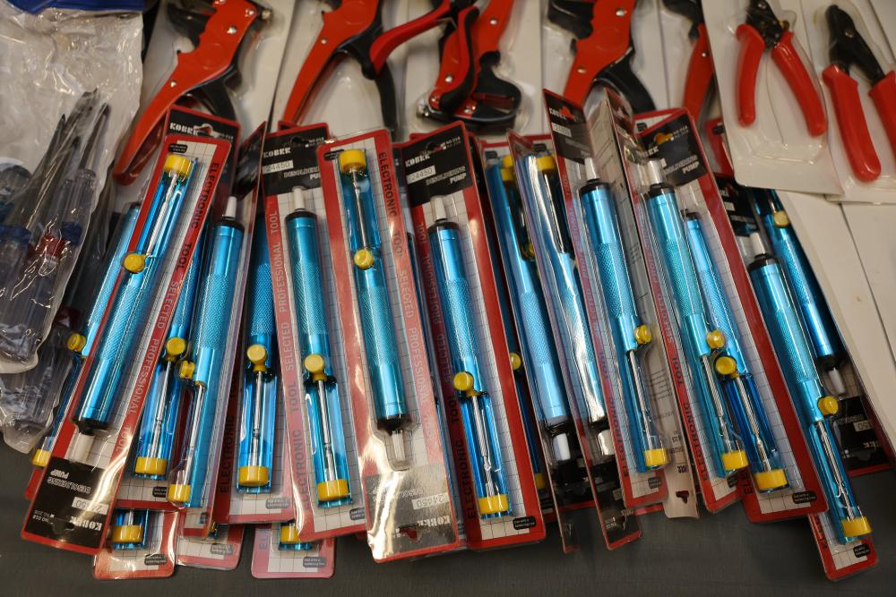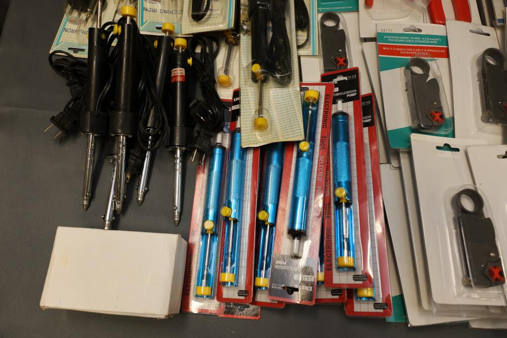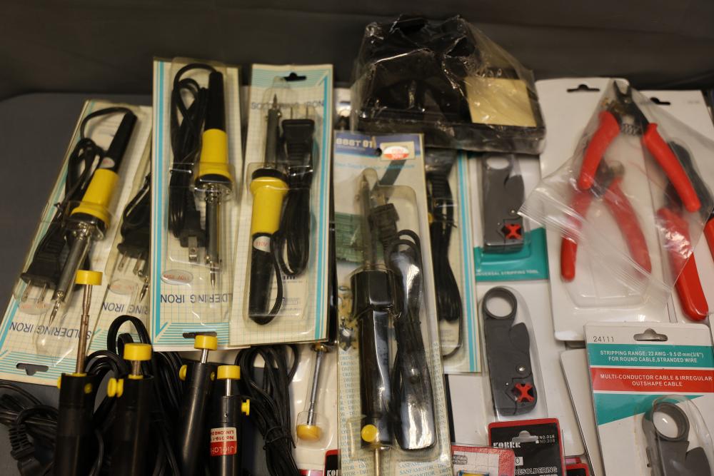 Tools Including Soldering Irons, Pliers, and Screwdrivers. Includes various soldering irons, wire strippers, precision screwdrivers, crimping tools, and other hand tools. Items are both packaged and loose, with a variety of sizes and styles. Pickup only.