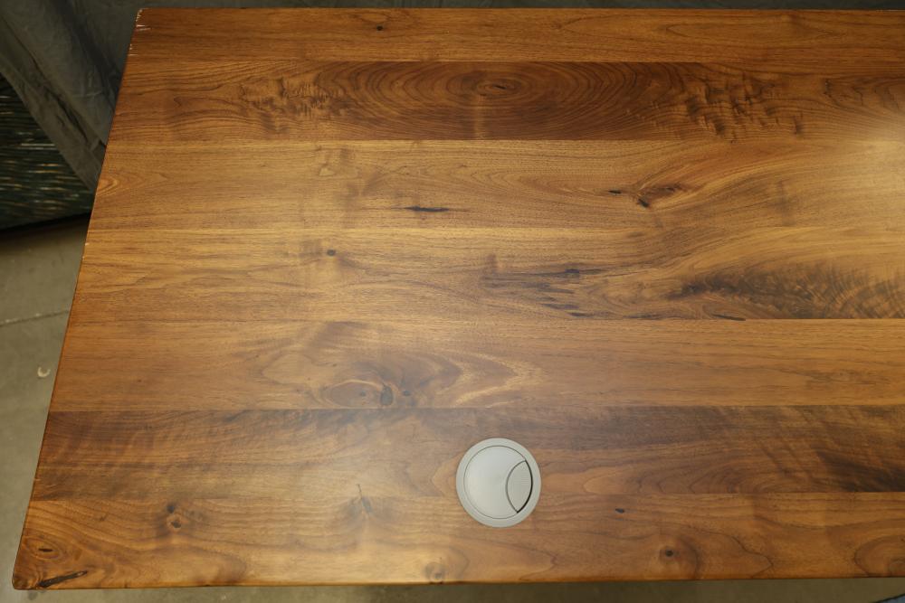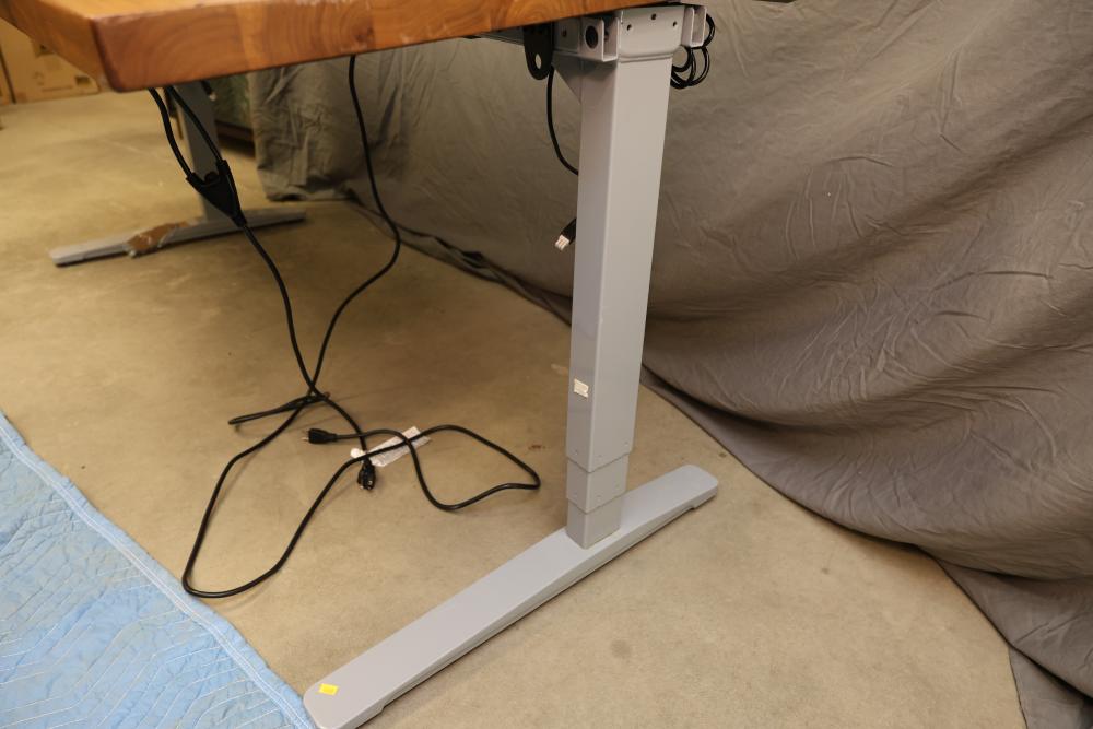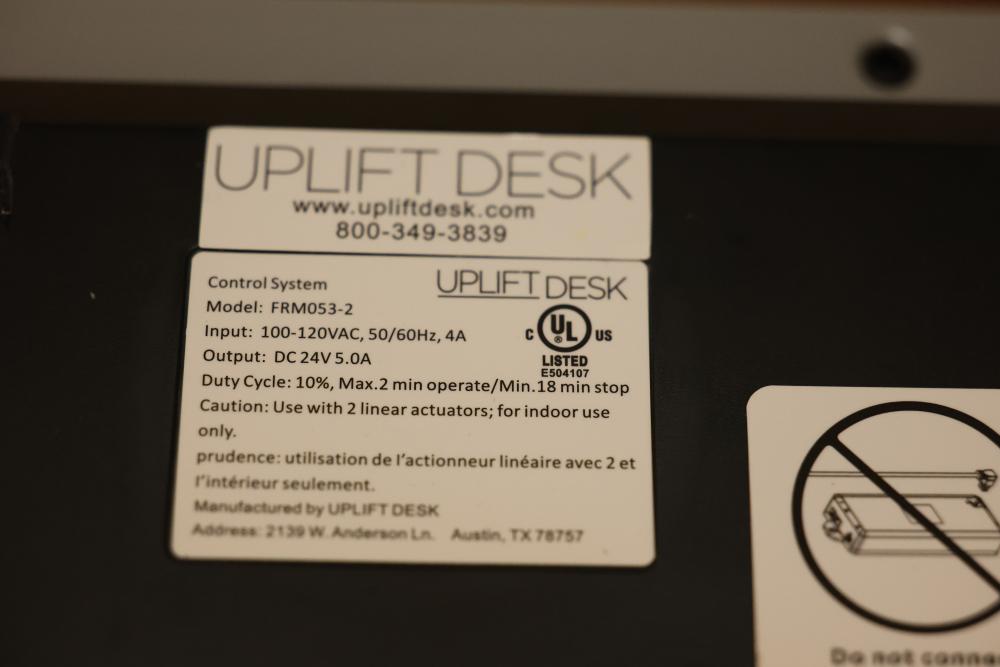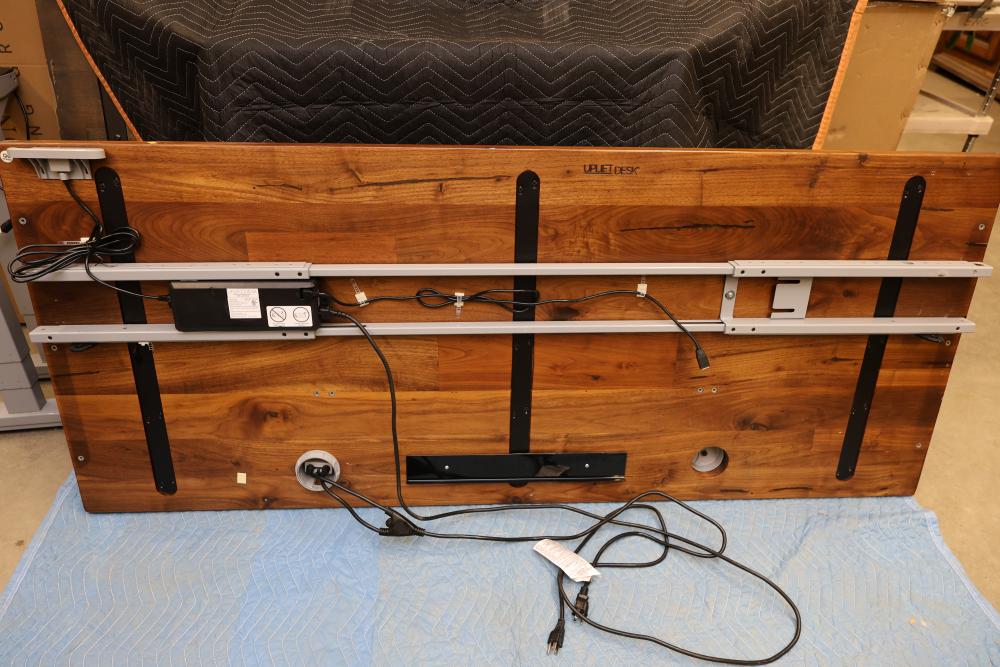 Uplift Desk Adjustable Standing Desk With Wood Top and Power Outlets. Features a natural wood top with integrated power outlets and cable cutouts, supported by an adjustable-height mechanism. Includes control panel with memory presets, attached cables, and electronics for motorized height adjustment. Pickup only.