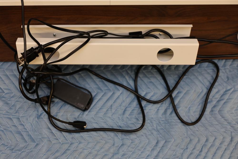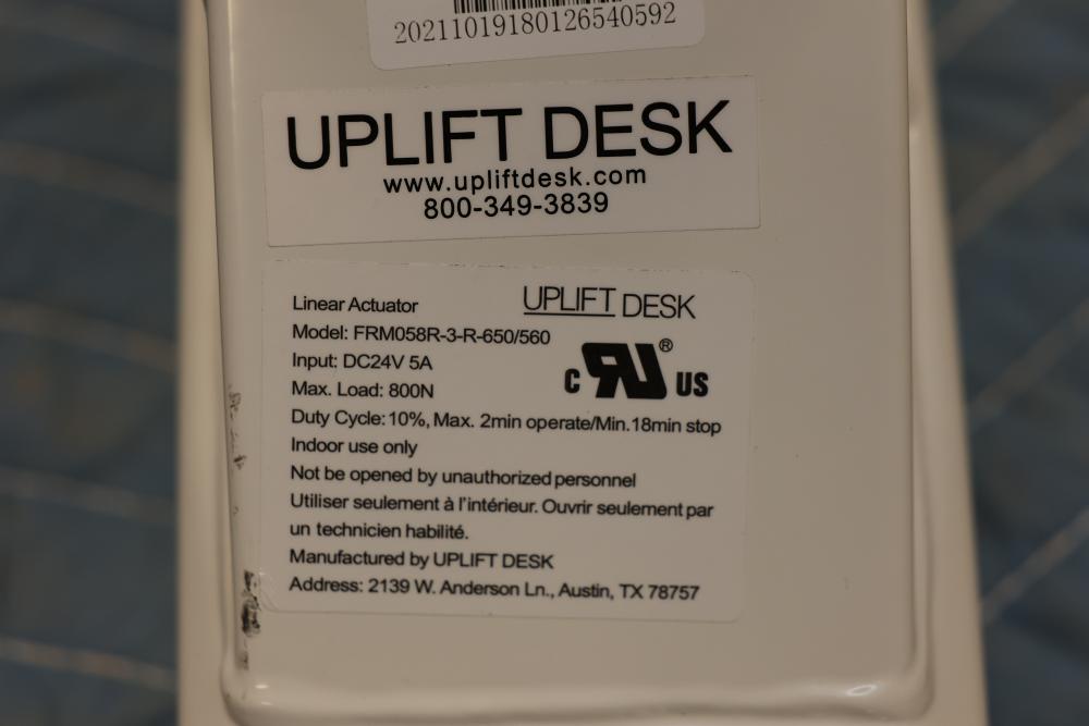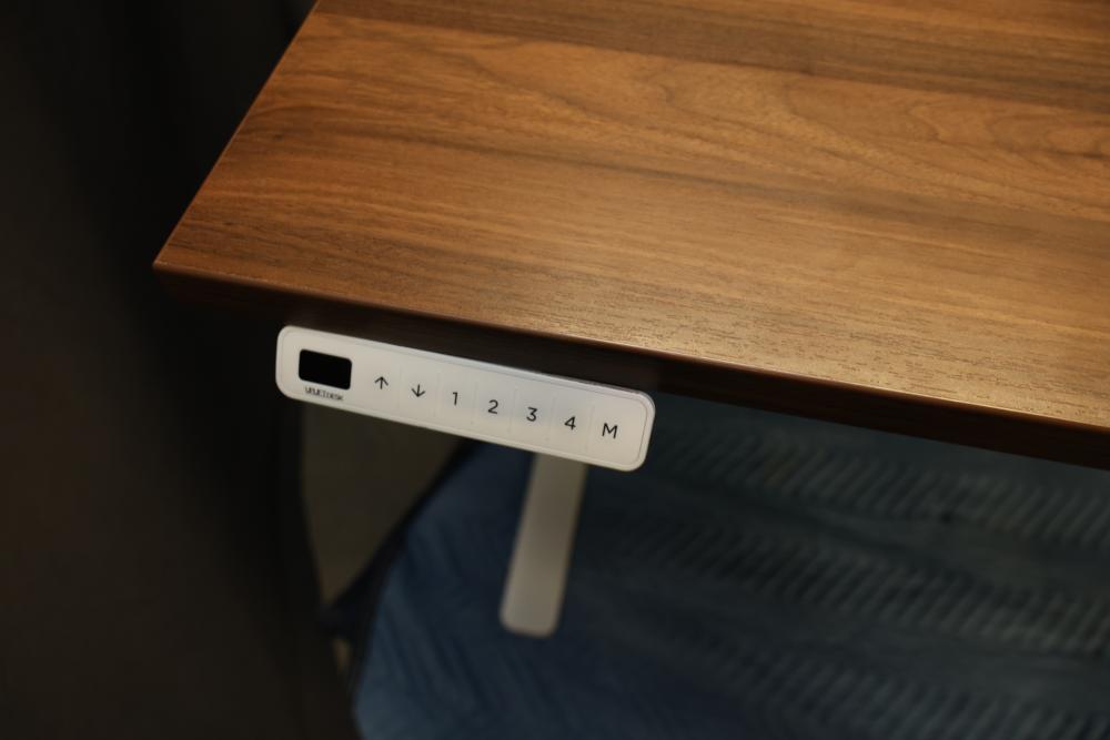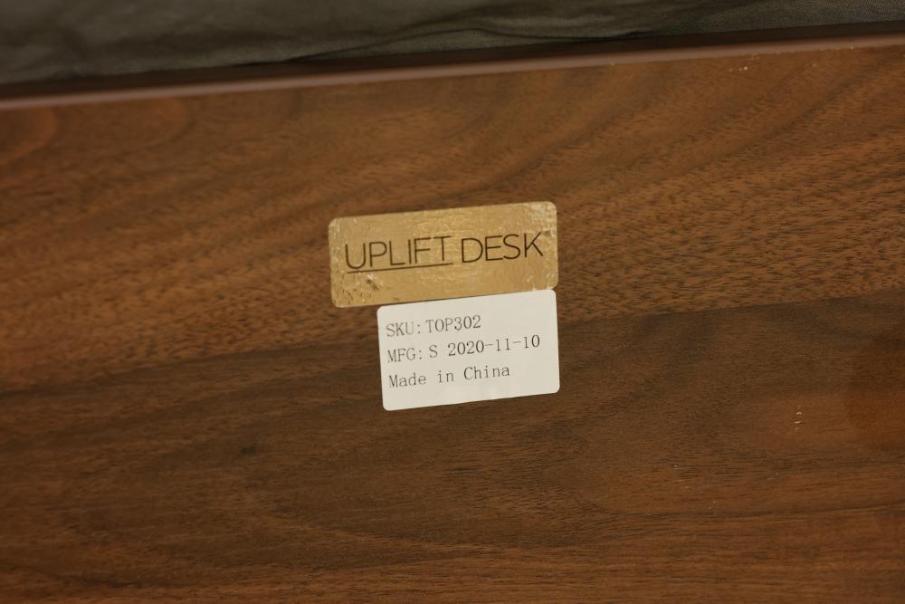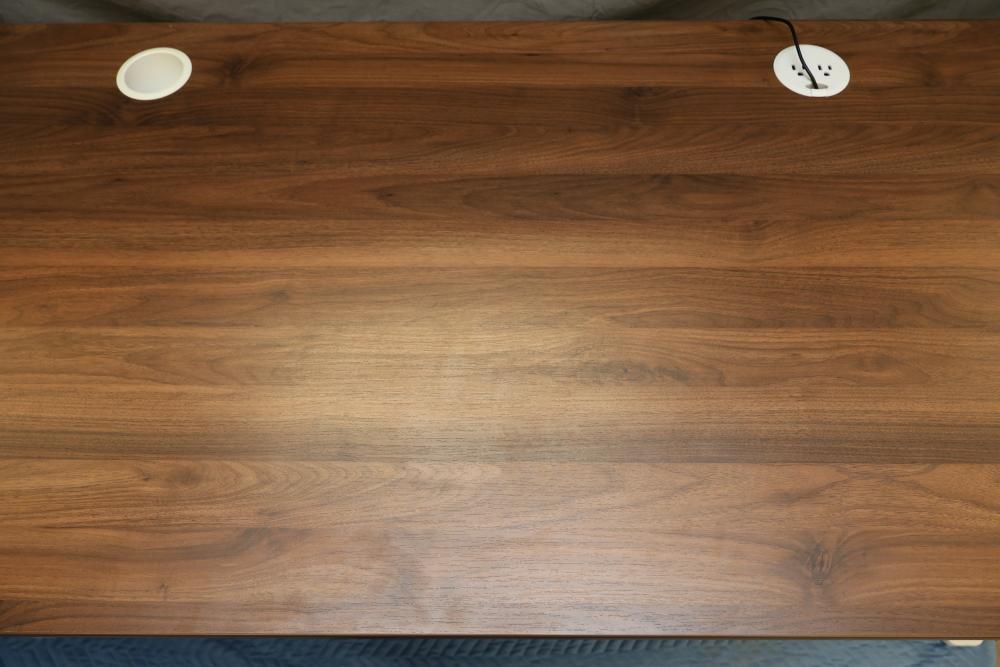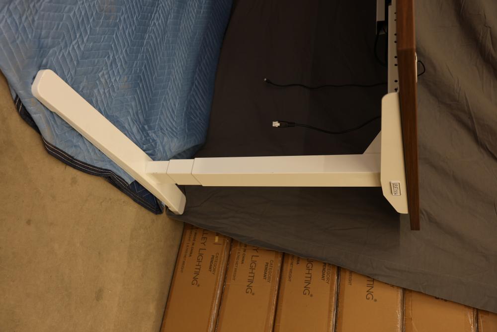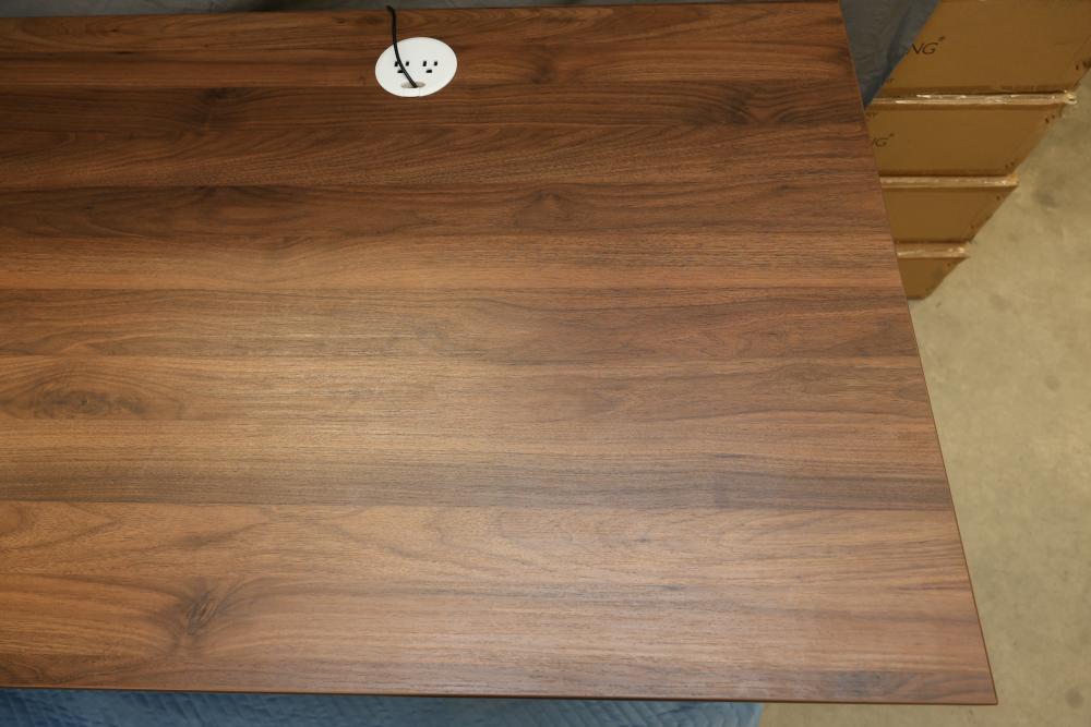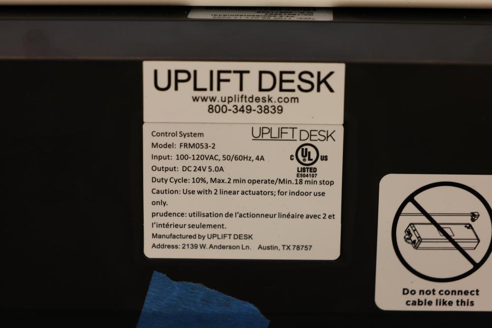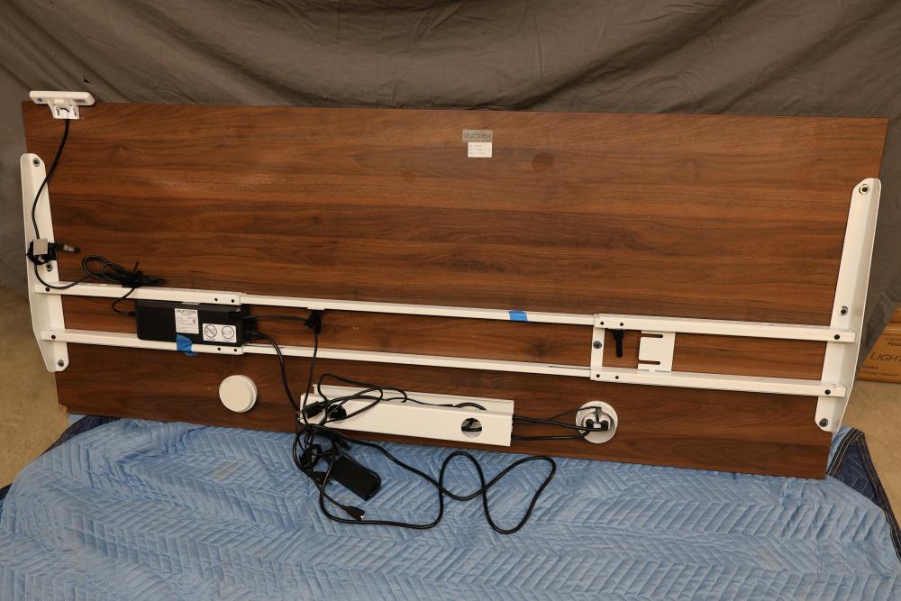 Uplift Desk with Walnut Finish and Electric Height Adjustment. Features a walnut veneer top with integrated cable management ports and white frame legs. Electric height adjustment mechanism includes a digital control panel with memory settings. The underside houses a linear actuator system and cable tray for organized power management. Dimensions not specified. Pickup only.
