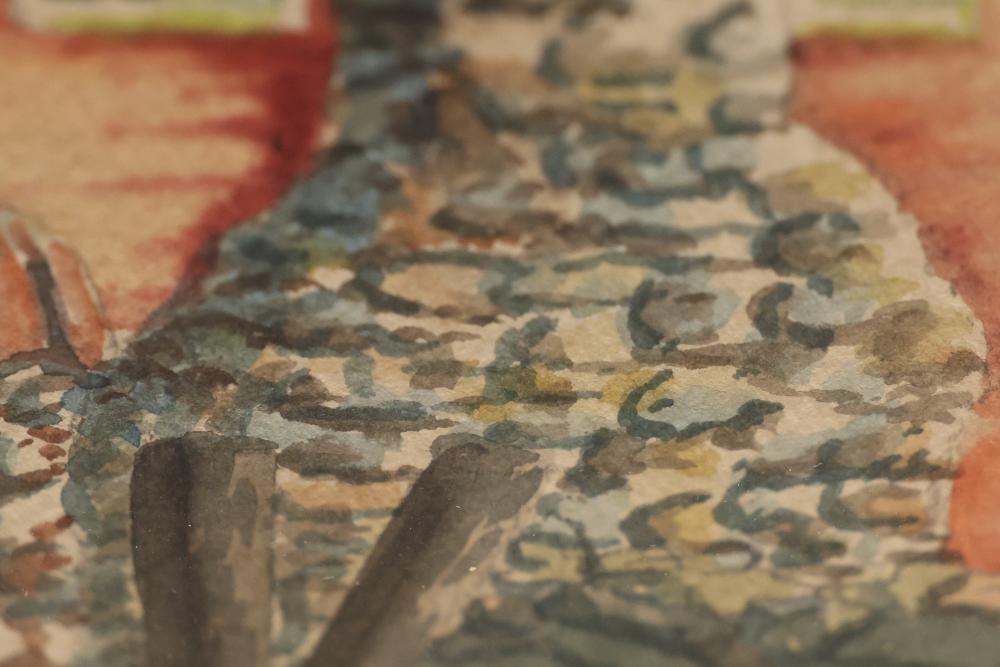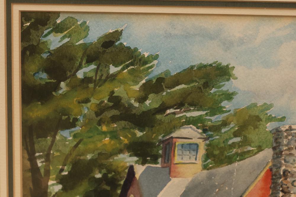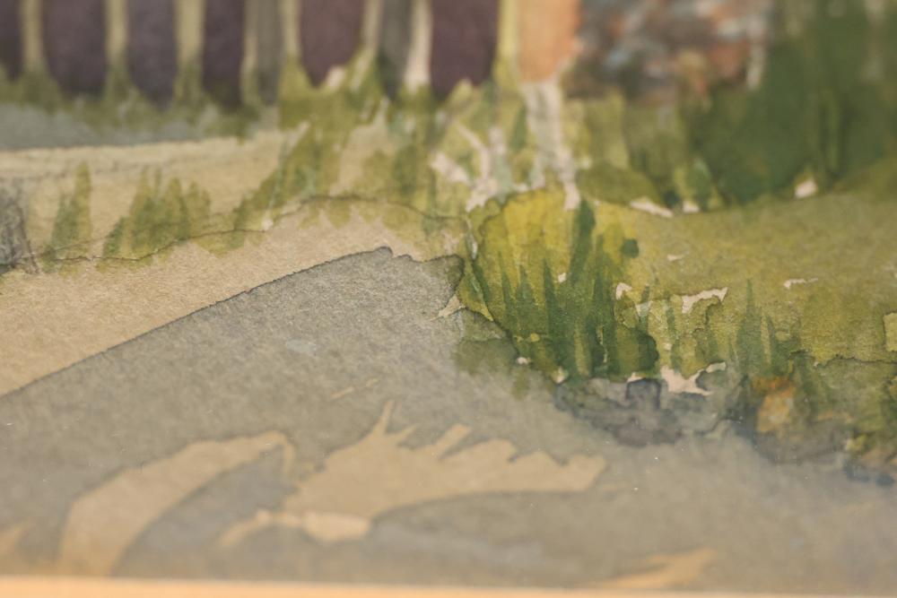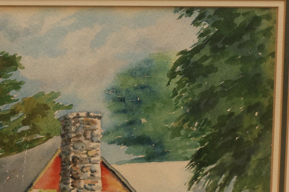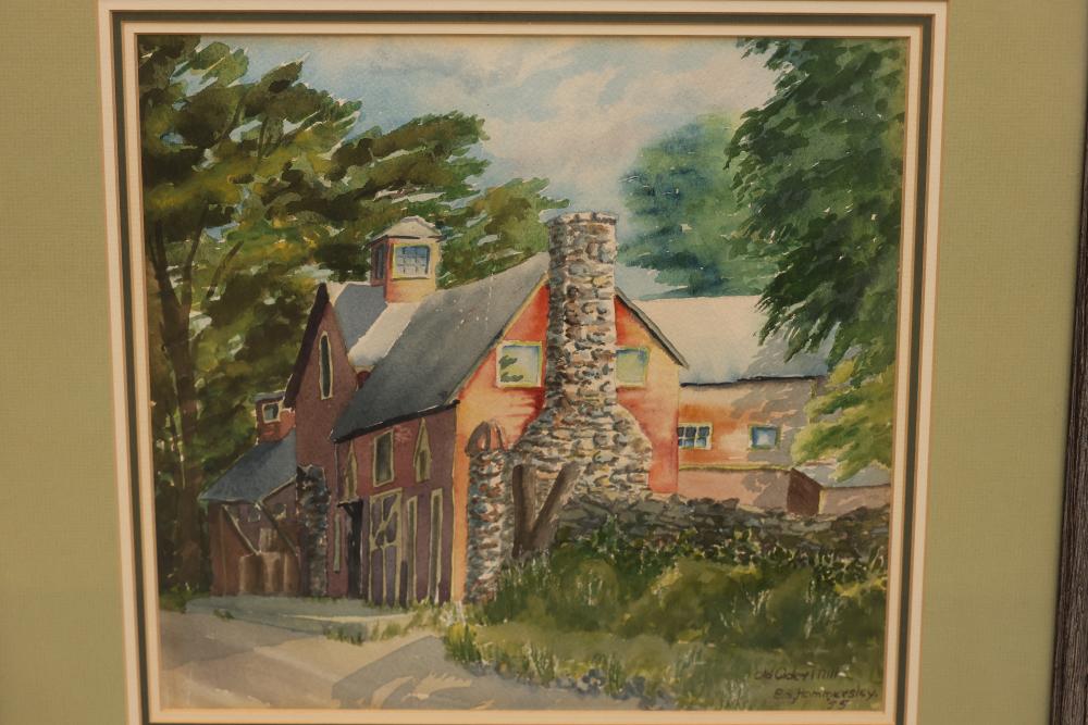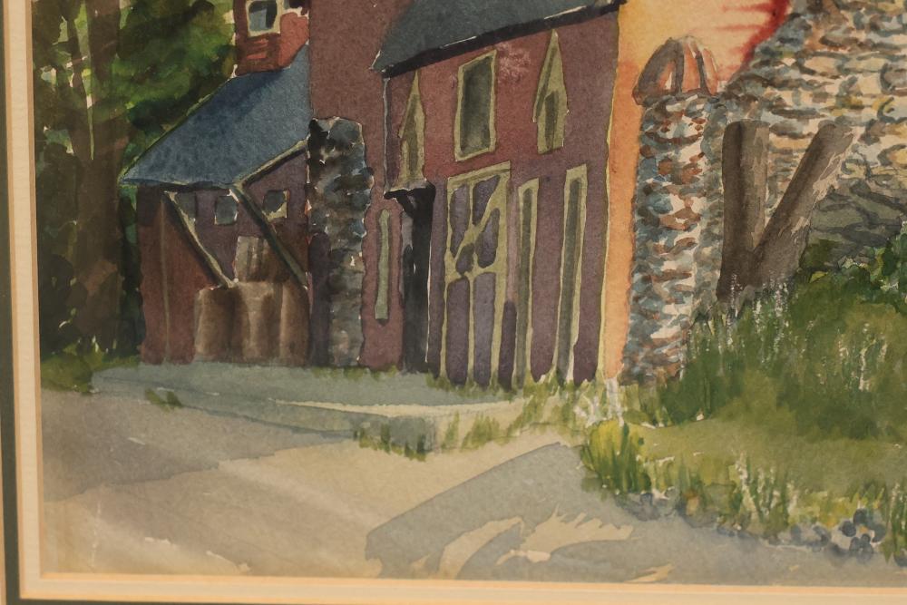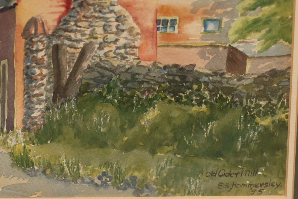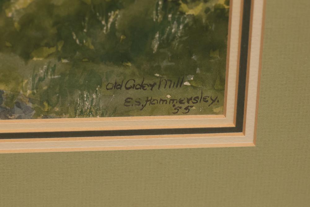 Framed watercolor painting titled 'Old Cider Mill' by E.S. Hammersley, signed and dated 1955 in the lower right corner. Depicts a detailed scene of a mill surrounded by greenery, with a stone chimney and other architectural elements. Professionally matted and framed with a wire hanger on the back. Pickup only.