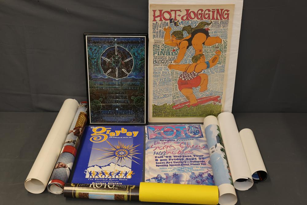 Signed and limited edition music, event, and art posters, including autographed promotional posters and limited edition prints. Highlights include Bob Dylan and band event posters, signed String Cheese Incident posters from Fall '98 Harvest Tour, a Ben Harper poster numbered 32/100, and various KOTO FM and event prints. Pickup only.