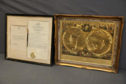 Framed nautical 17th-century world map featuring an early cartographic style with detailed decorative elements, accompanied by a separate framed display containing a 1975 New York State Executive Chamber document with an official seal and pen. Both items are displayed in wooden frames showcasing vintage designs. Some signs of aging and wear are present on the frames and backing materials. Pickup only.