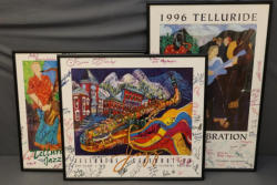 Framed Telluride event posters featuring designs for Bluegrass Festivals (1990, 1994) and the Brewer"s Festival (1994), with other concert art. Includes illustrations of mountain scenes, instruments, and event dates. Pickup only.