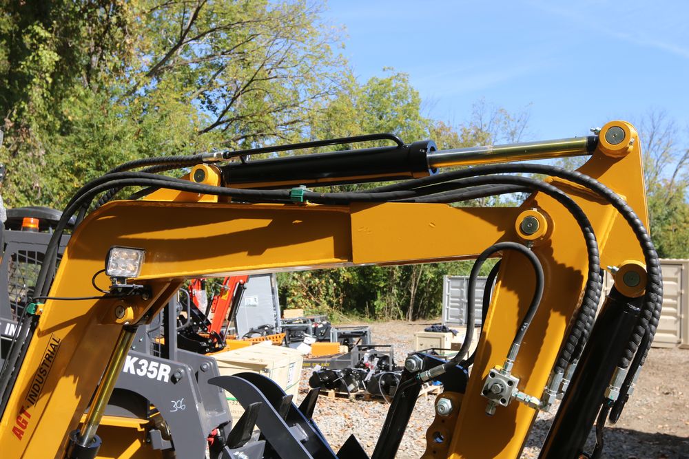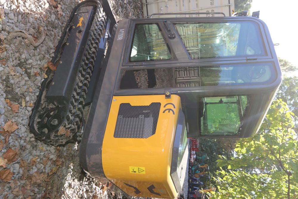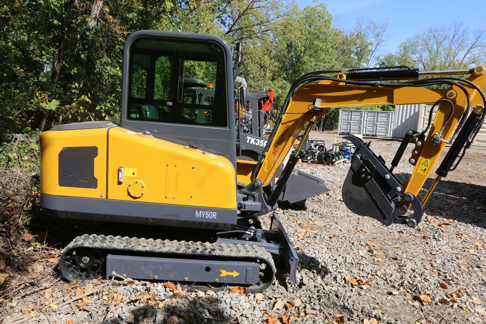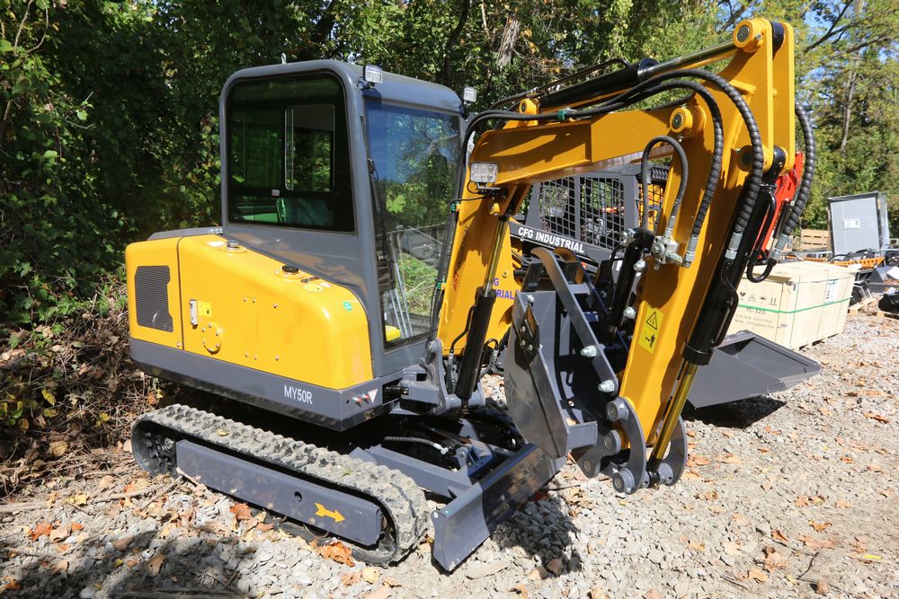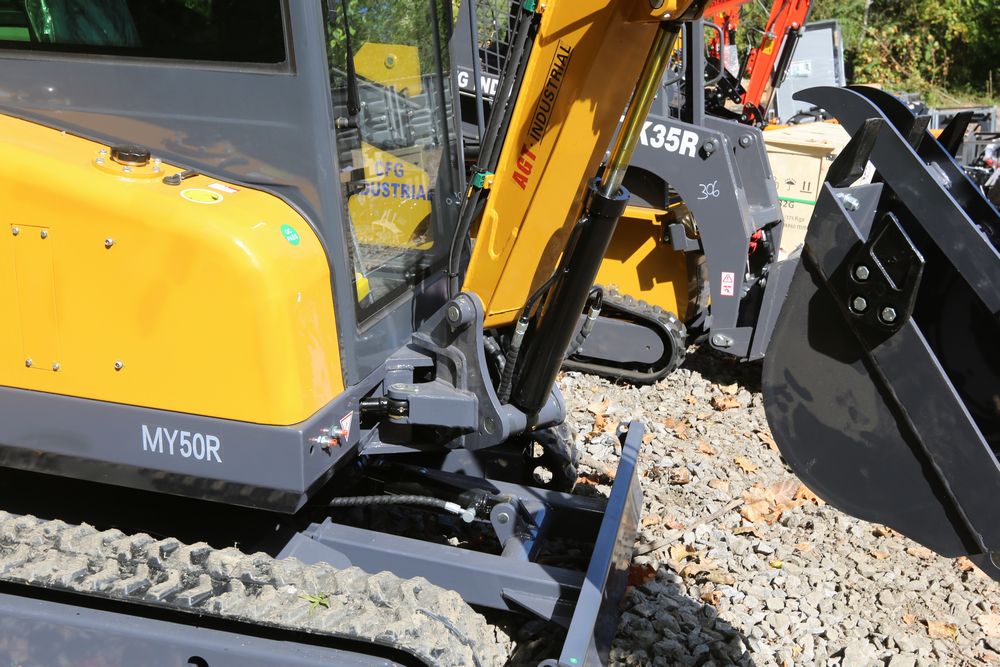 ATG Industrial MY50R mini excavator with a 1900 kg load. Features include a R825 engine model, enclosed cab, a hydraulic thumb, and off-road undercarriage expansion. Includes a dozer blade, tracked base, and ergonomic operator seat. Less than 1 hour of use.