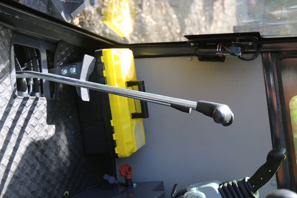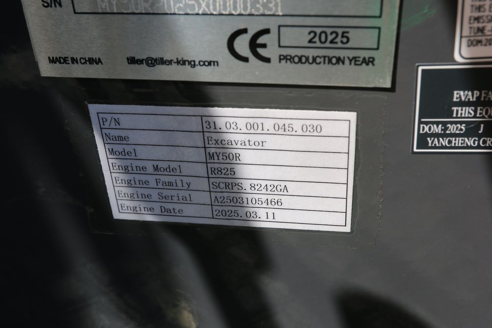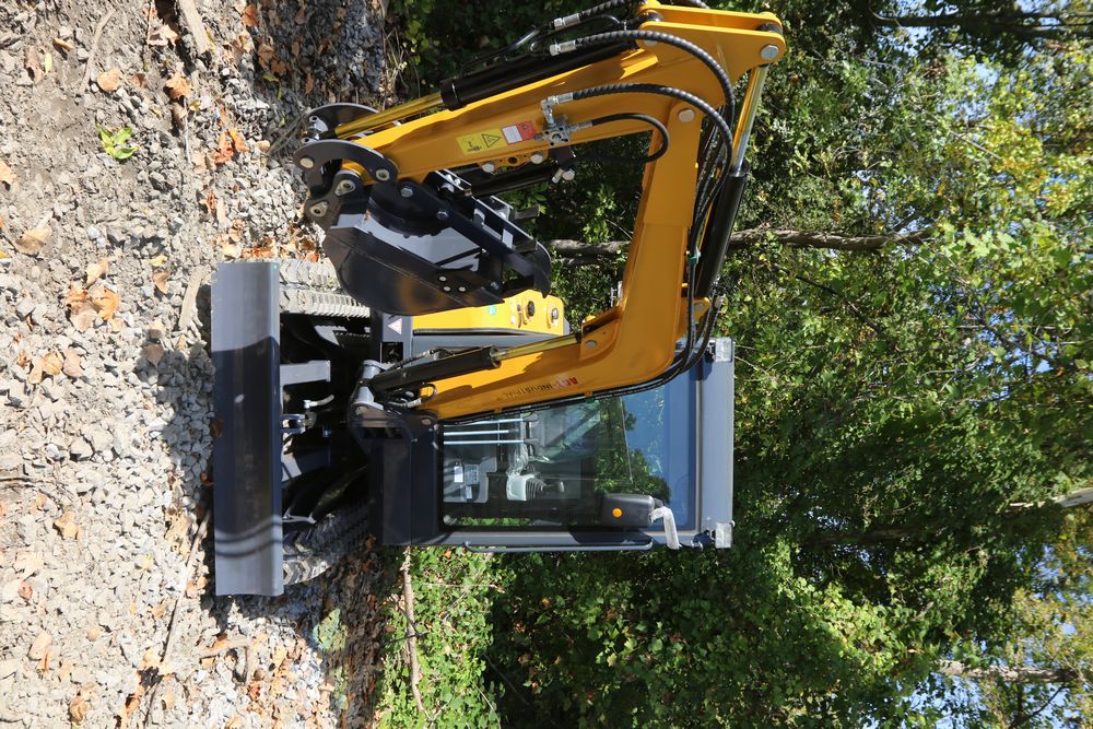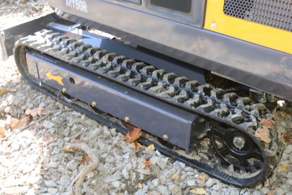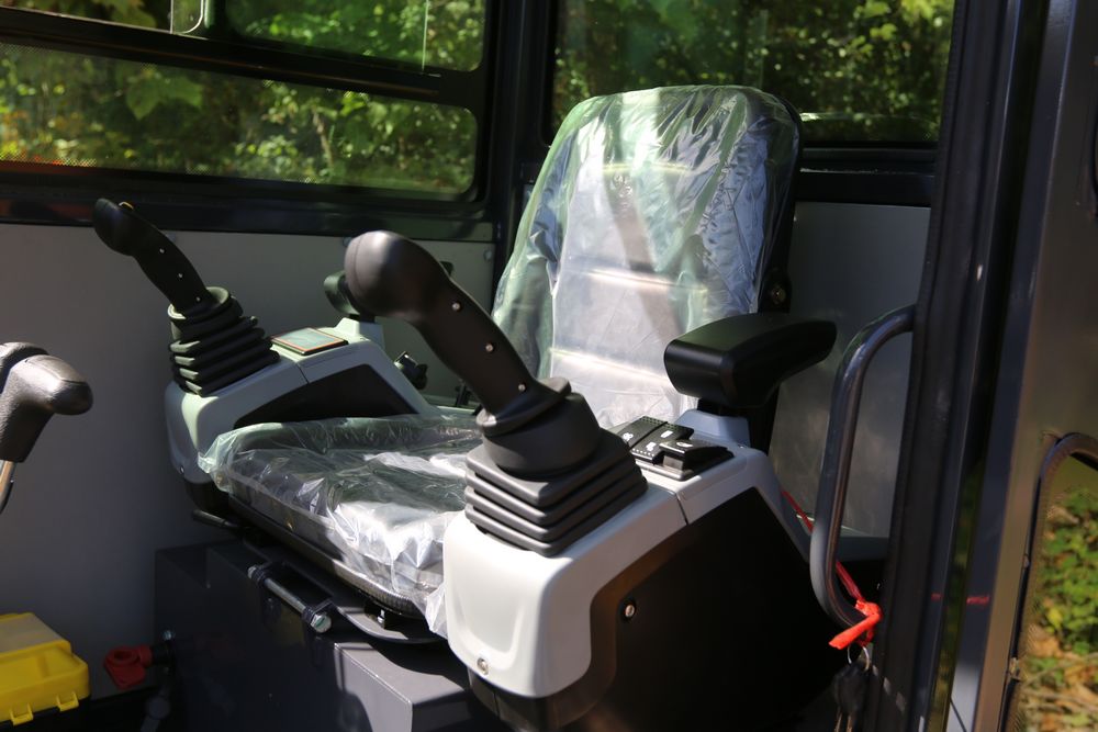 ATG Industrial MY50R mini excavator with a 1900 kg load. Features include a R825 engine model, enclosed cab, a hydraulic thumb, and off-road undercarriage expansion. Includes a dozer blade, tracked base, and ergonomic operator seat. Less than 1 hour of use.