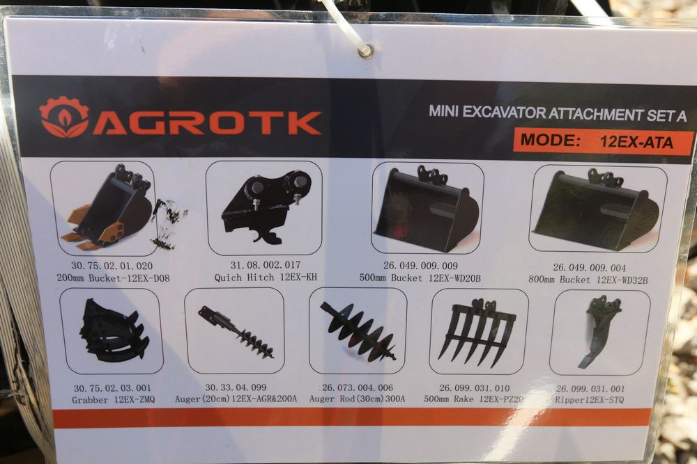 AGT Mini Excavator Attachment Set A Model: 12EX-ATA including 200mm bucket, quich hitch, 500mm bucket, 800mm bucket, grabber, 20cm auger, 30cm auger, 500mm rake, and ripper.