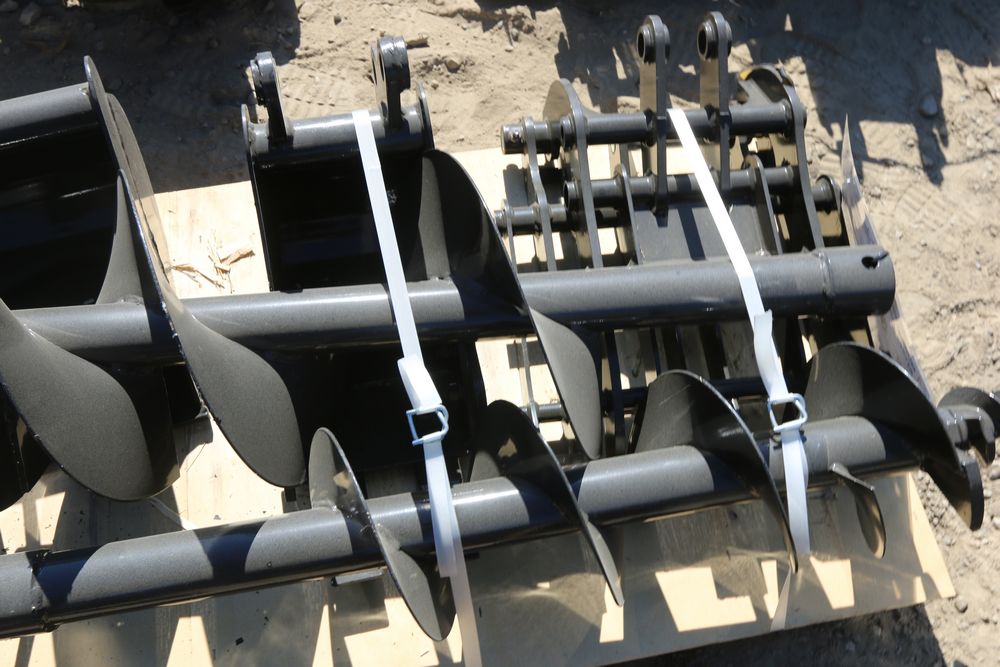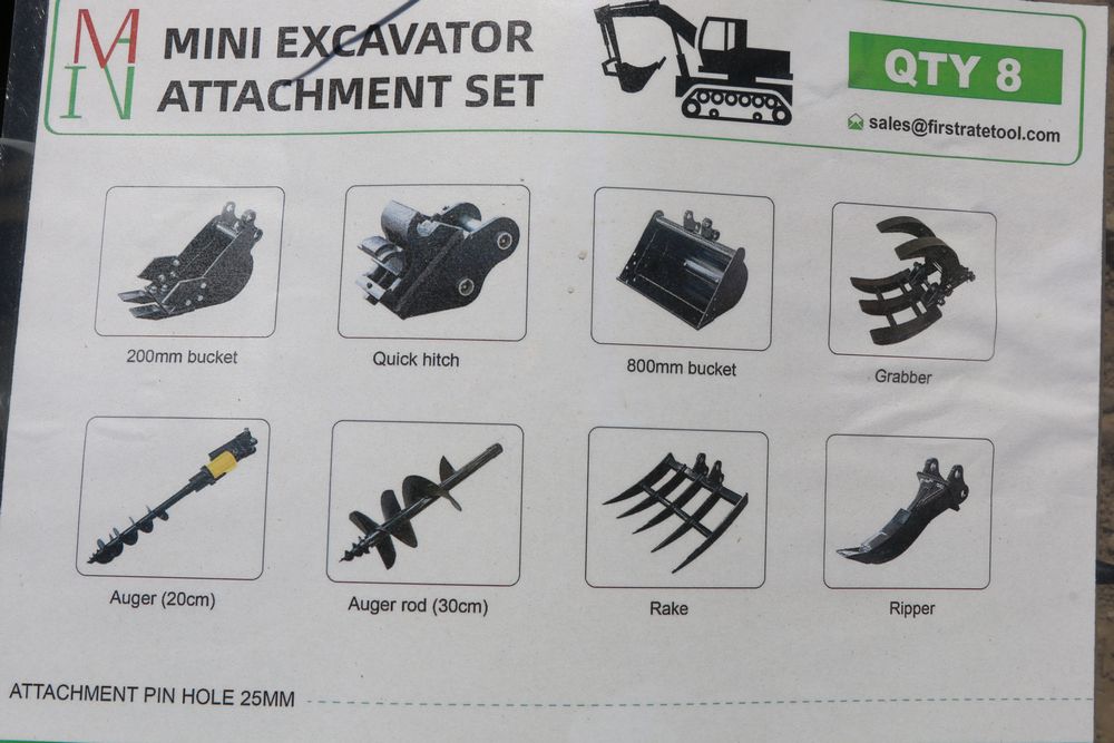 MIVA attachment set including rake, ripper, grabber, 12inch auger, 16 inch auger, 8 inch narrow bucket, 24 inch bucket, 32 inch bucket.
