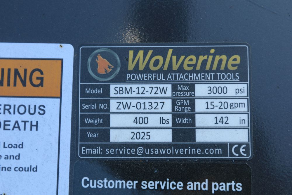 Wolverine Skid steer sickle bar mower attachment, model SBM-12-72W, 1" cutting capacity, 72" cutting length, blade swing of +90 degrees -30 degrees.