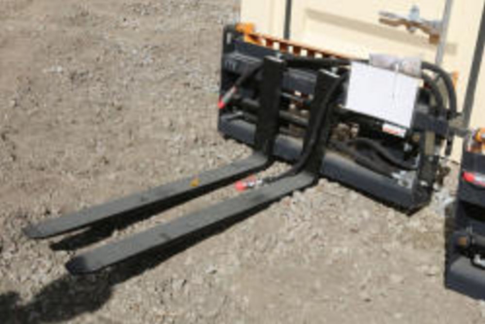 Wolverine skid steer pallet fork attachment hydraulic adjustment, model PFA-11-3300G, 48" fork adjustment.