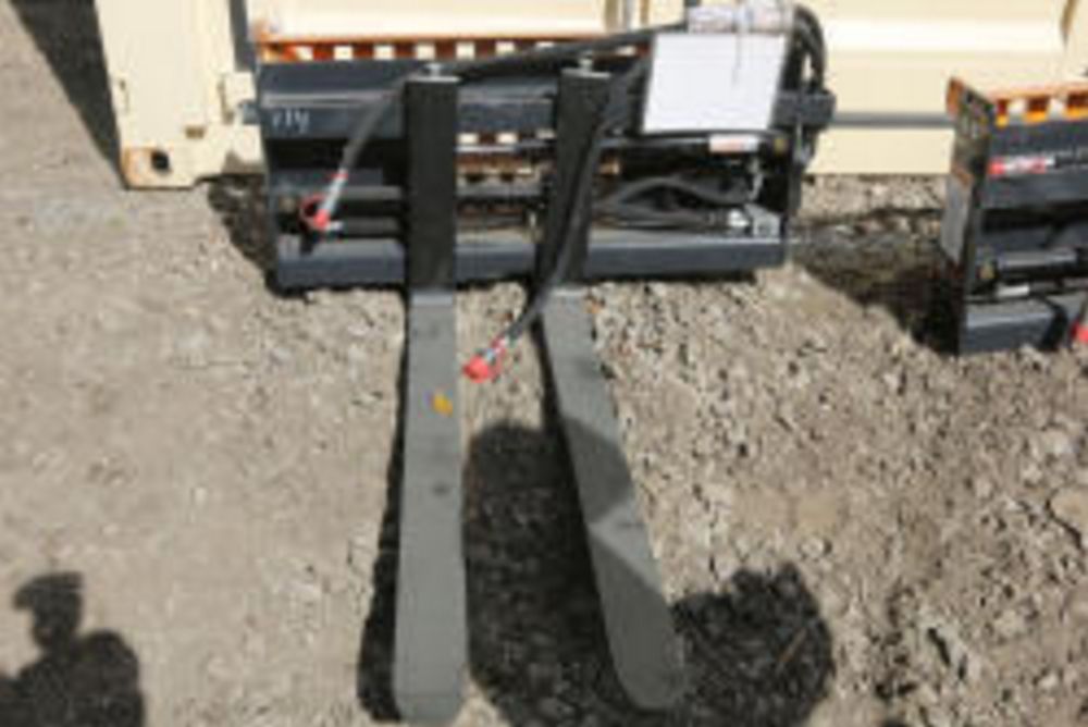 Wolverine skid steer pallet fork attachment hydraulic adjustment, model PFA-11-3300G, 48" fork adjustment.