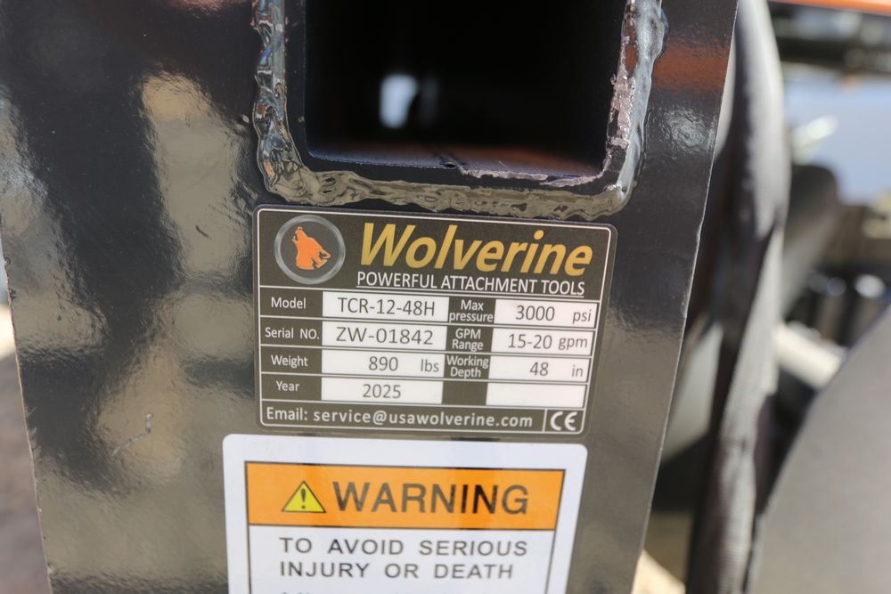 Wolverine Skid Steer Trencher attachment, model TCR-12-48H, trenching width 8", depth 48", clearing auger dia 15"