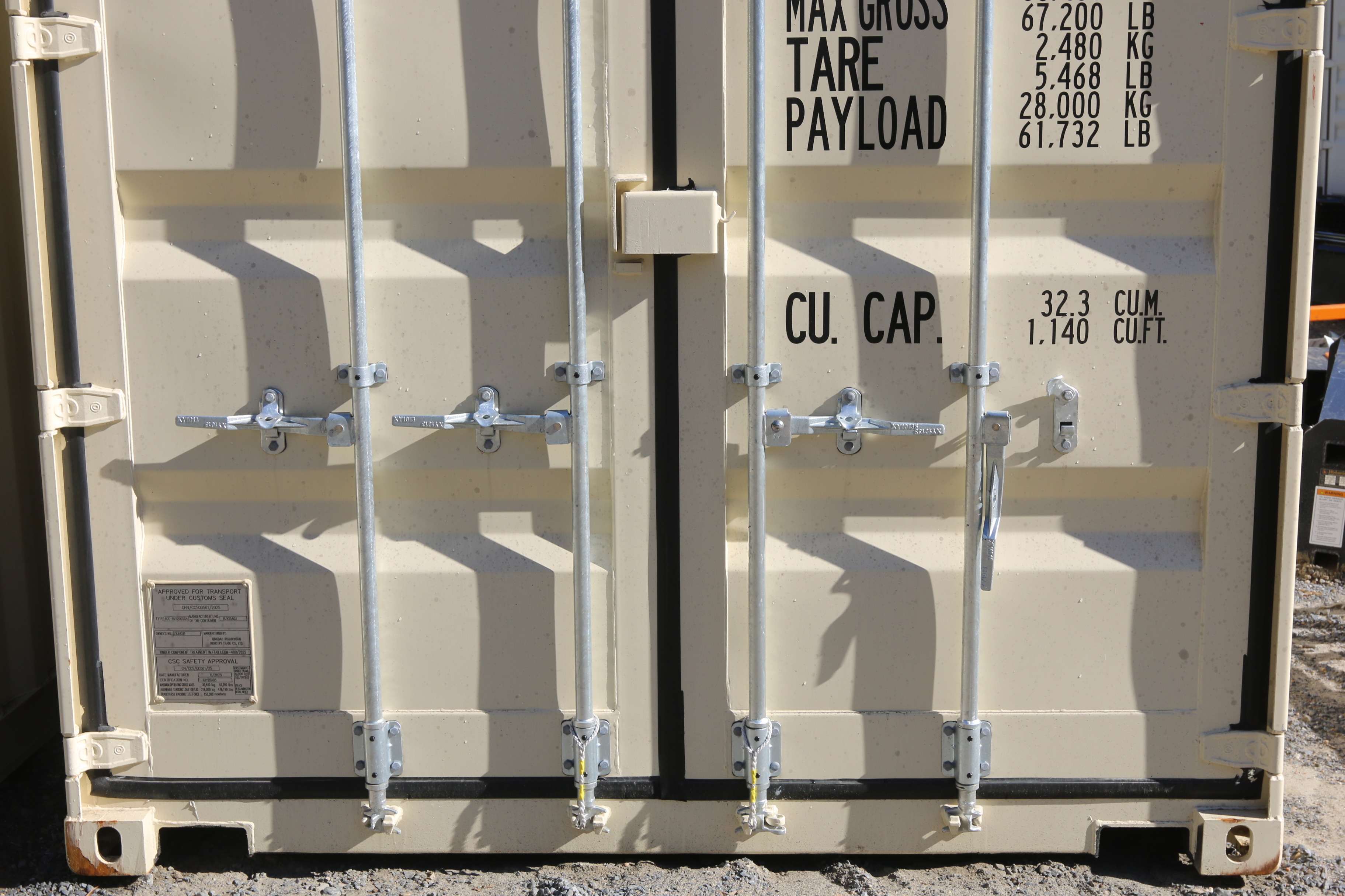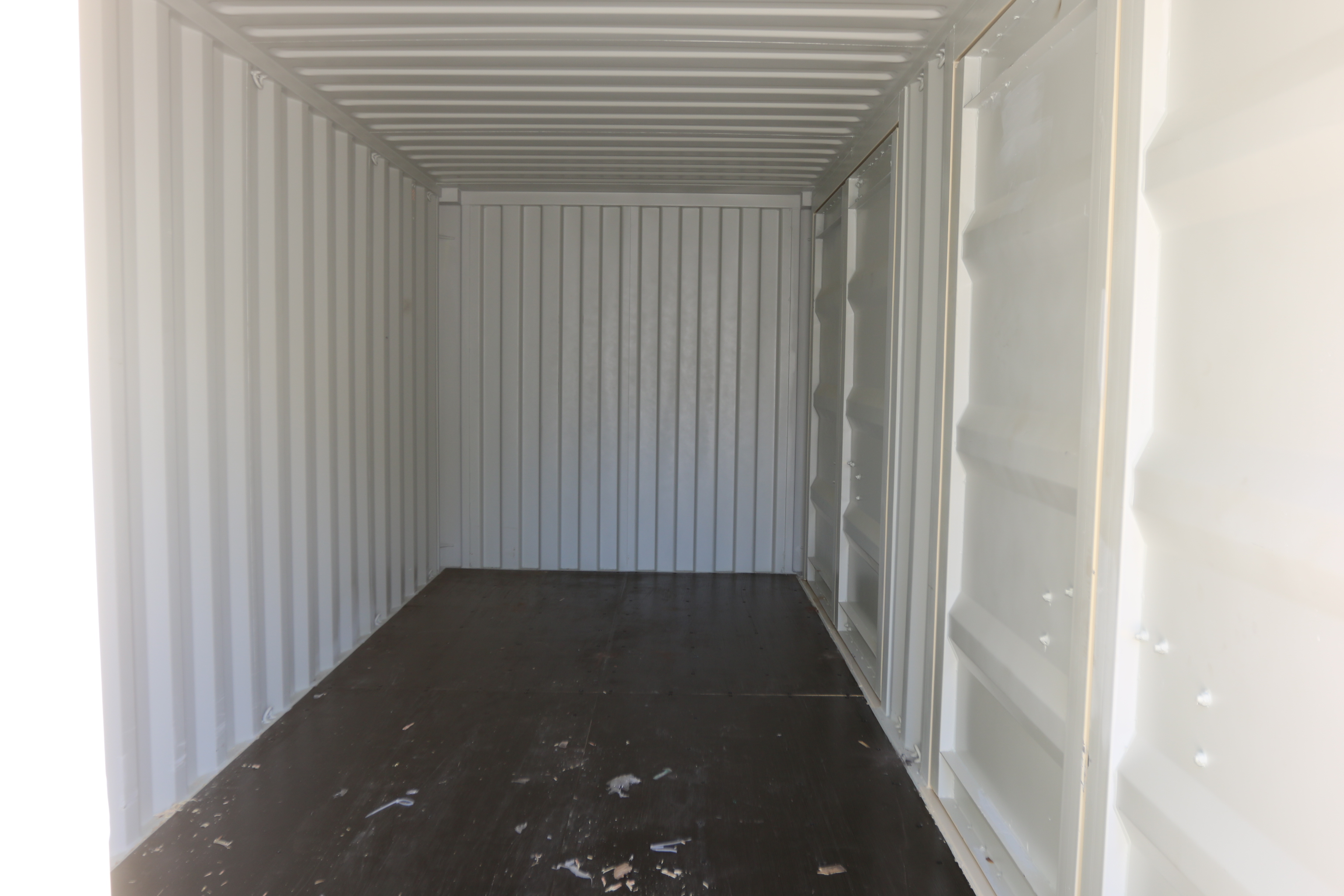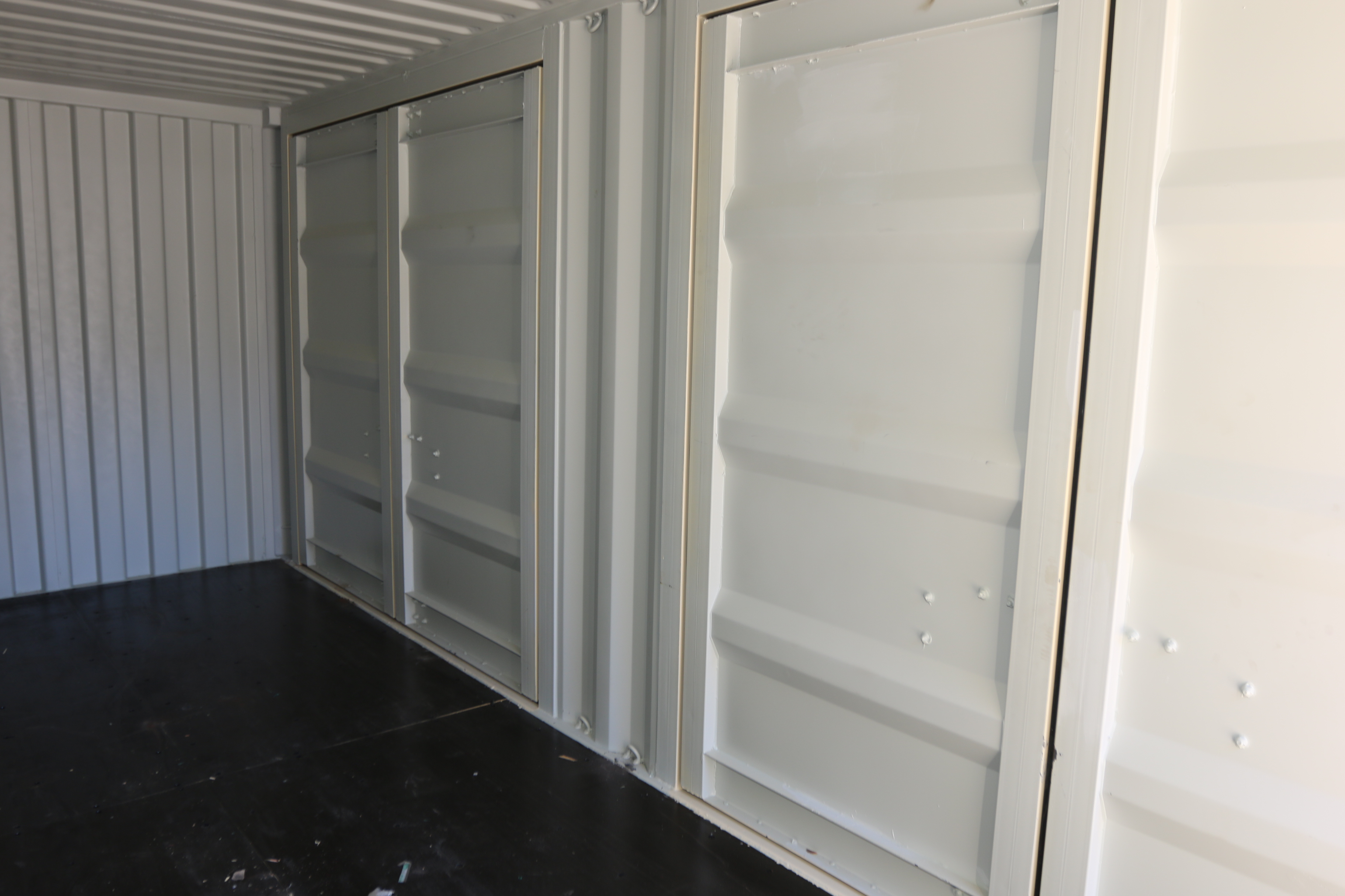New 2025 20' multi-door container, two side doors, one end door, side forklift pockets.