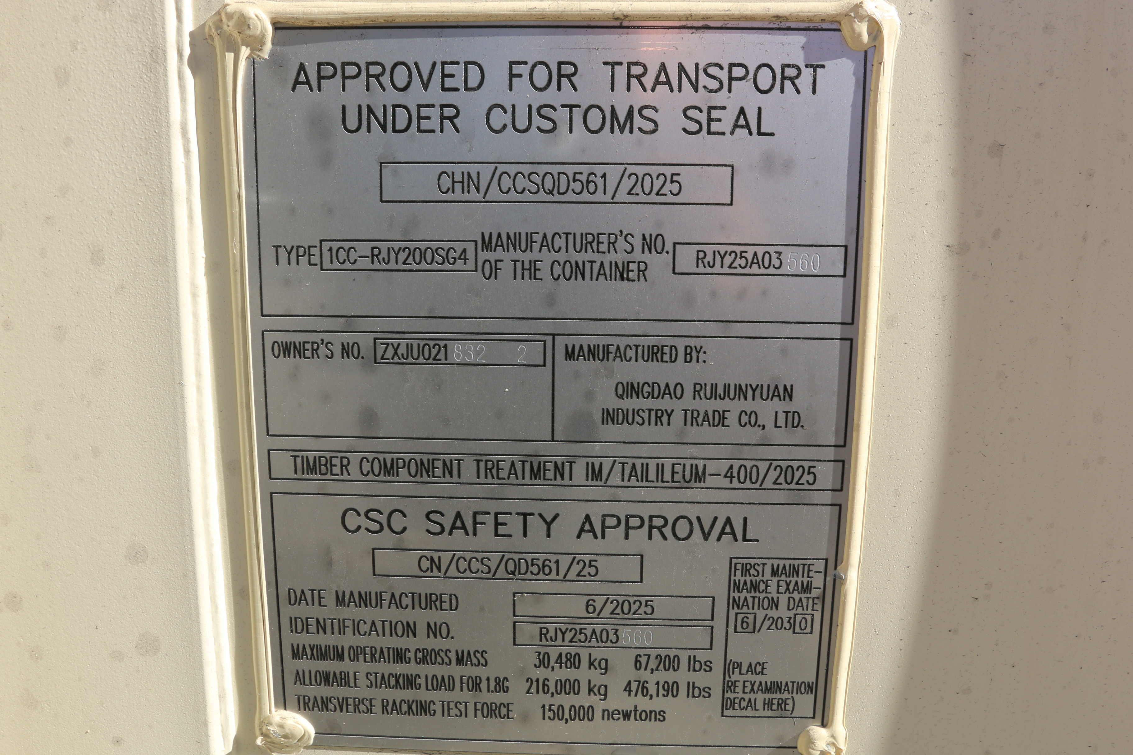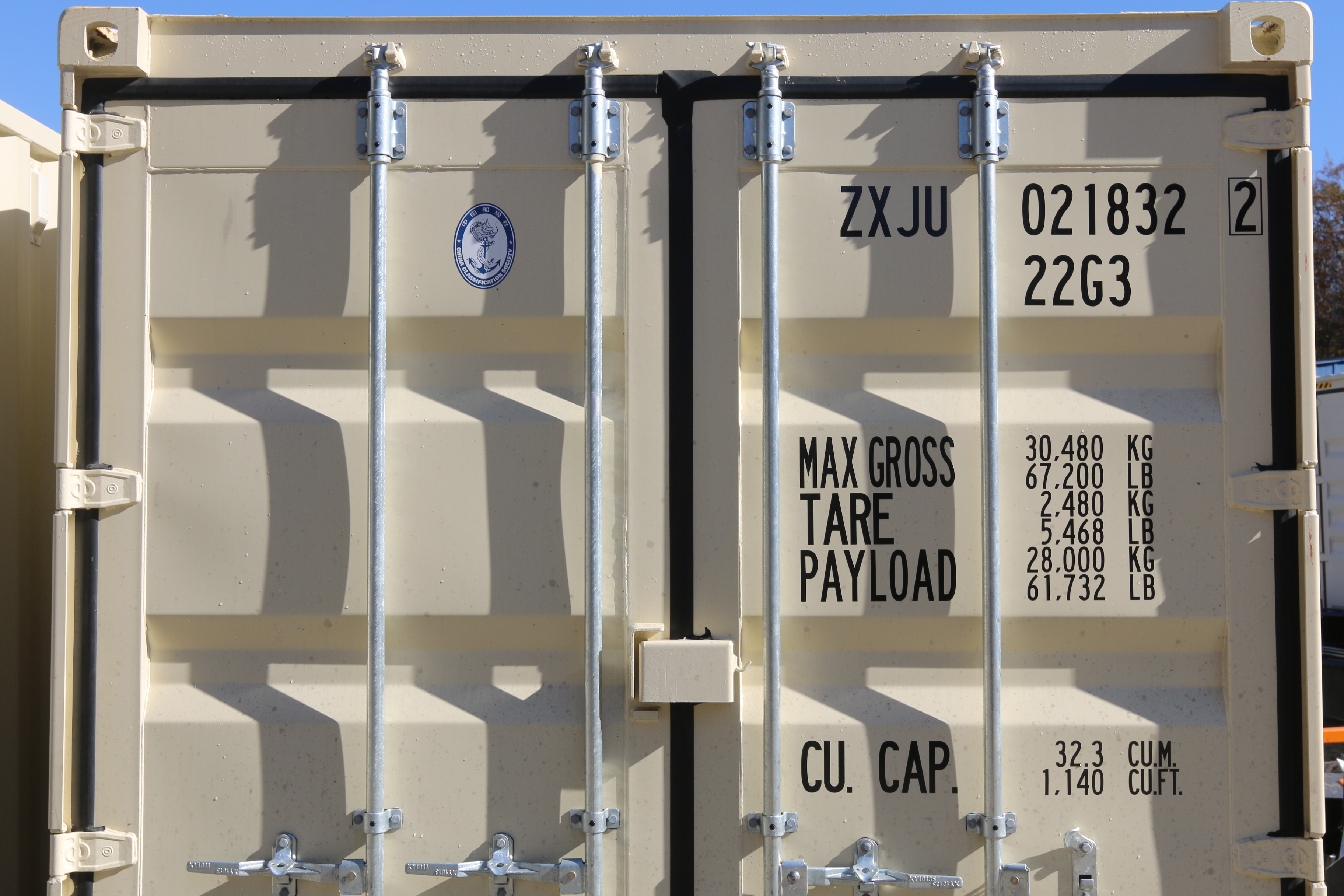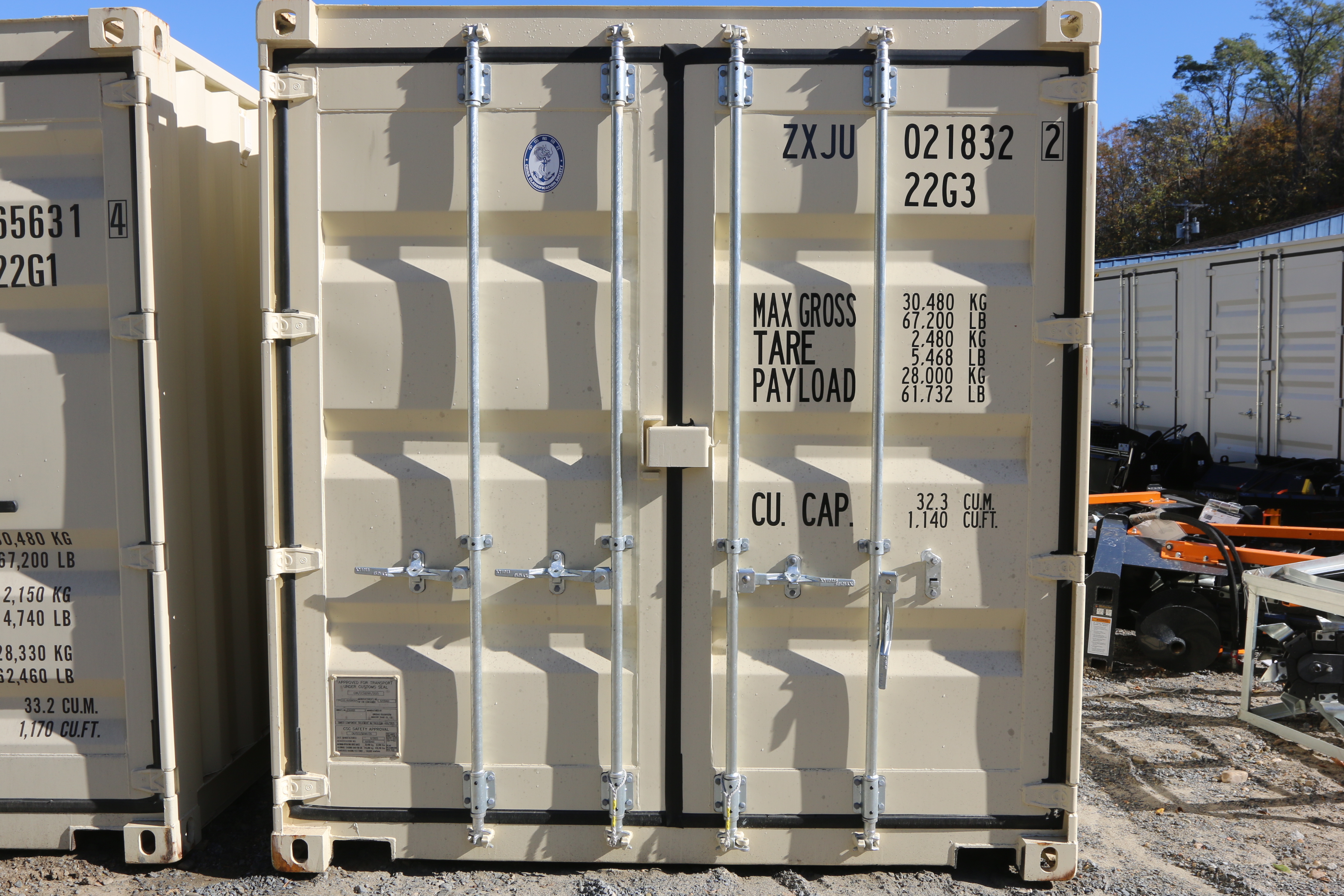 New 2025 20' multi-door container, two side doors, one end door, side forklift pockets.