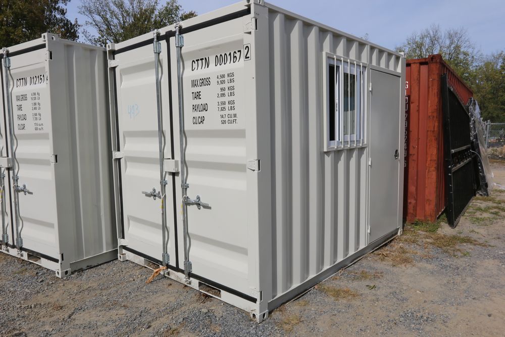 12' standard storage container with window and side door. Left side end door has trouble opening and closing.