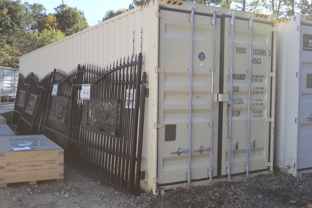 40' High cube multi-door container, four side doors, one end door, side forklift pockets.