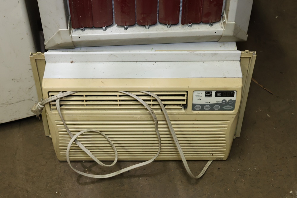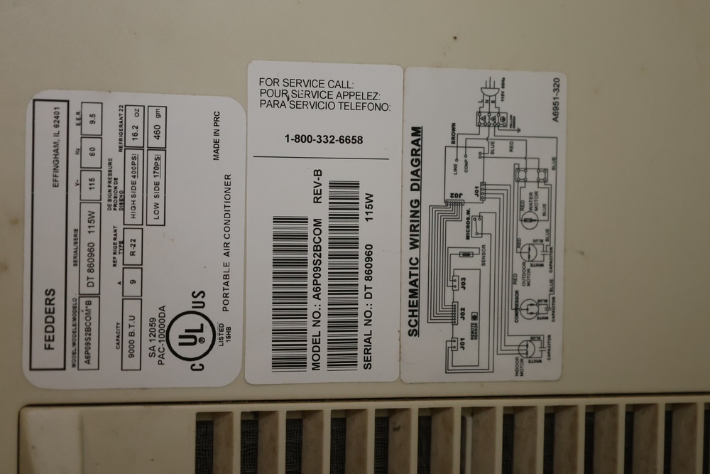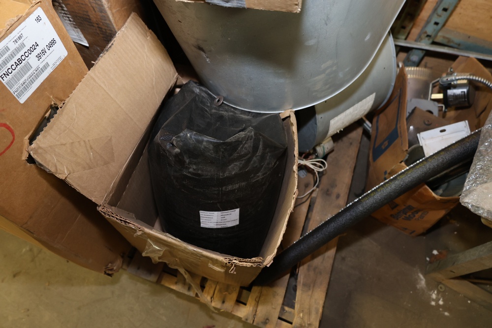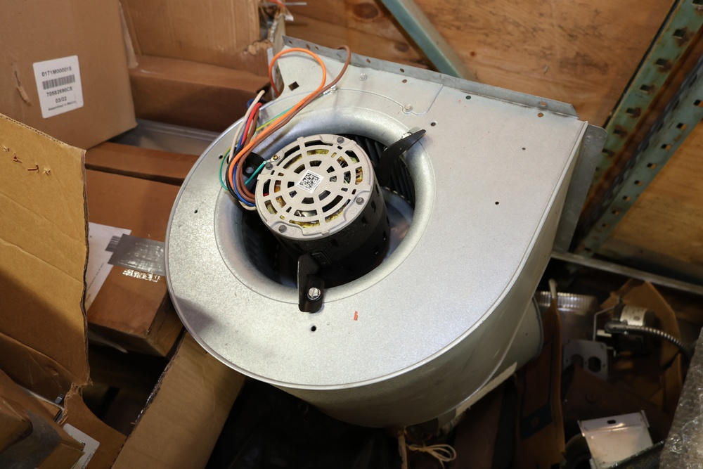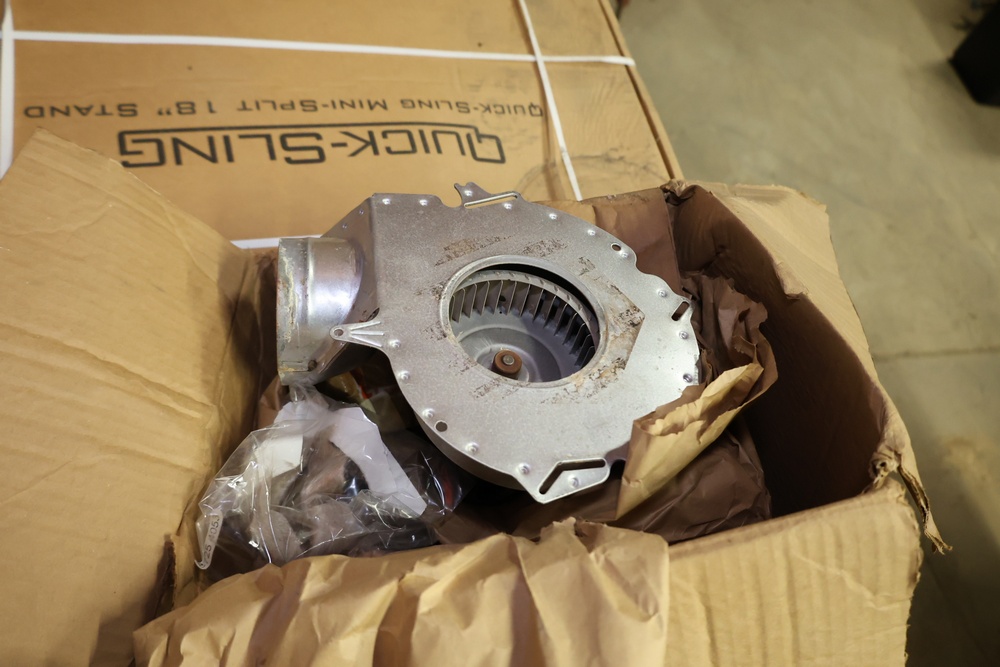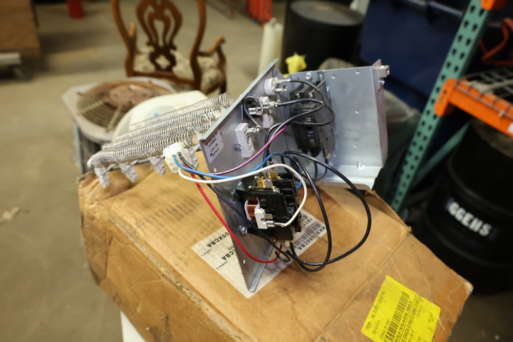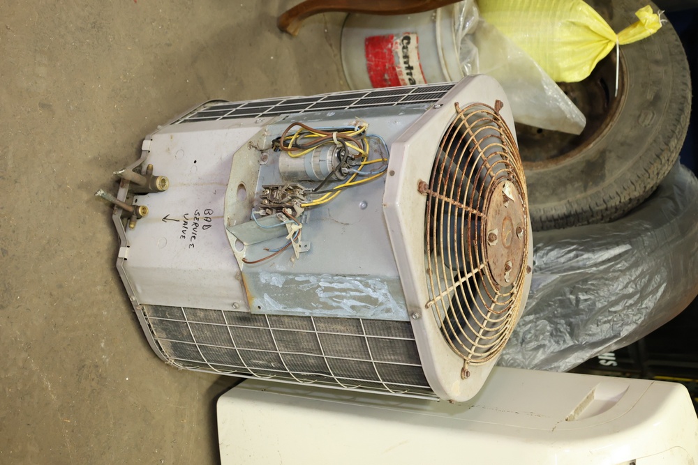 HVAC components and portable air conditioning units. Notable items include a Fedders portable air conditioner, model AP09S2BCOM, rated at 9,000 BTU with 115V input, serial number DT860960. Also included is a Reznor hydronic unit heater, a window-mount air conditioner, and an open boxed heating element assembly labeled model HKSC05XCBA with visible wiring and coil elements. Additional components include a FIR S.p.A. AC motor, model WSE0/85, rated at 0.248 HP, 115V, 1050/1600 RPM, and a centrifugal blower fan in open packaging. Buyer must take all.