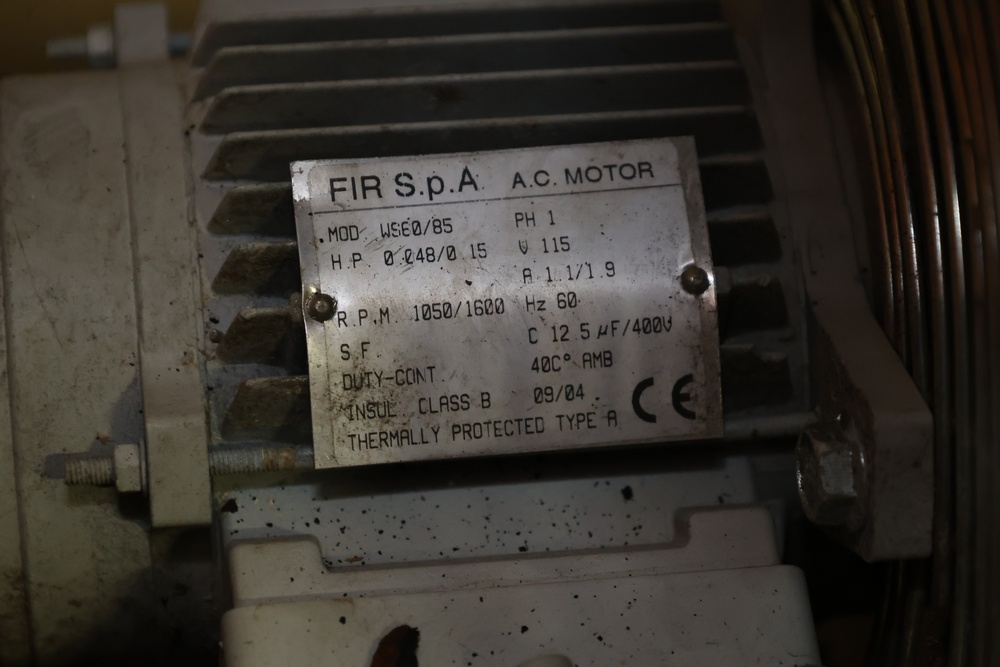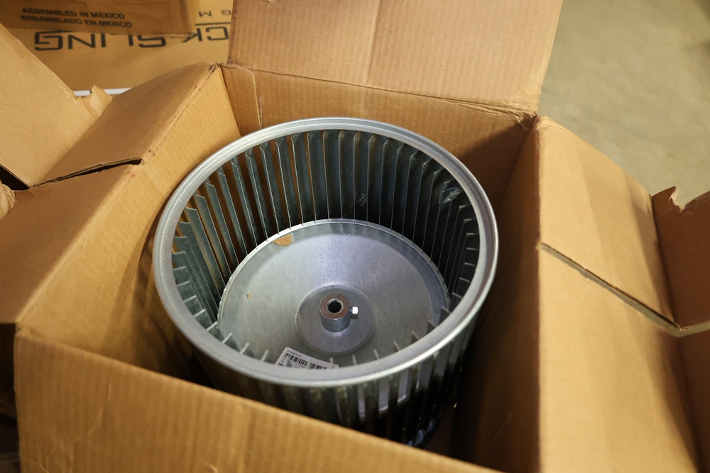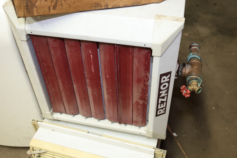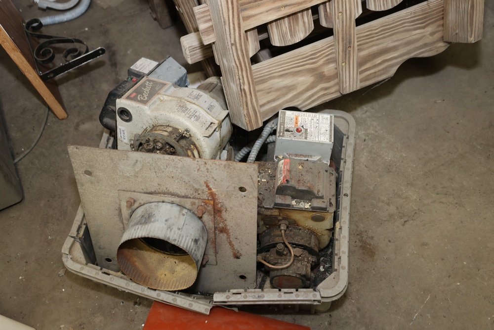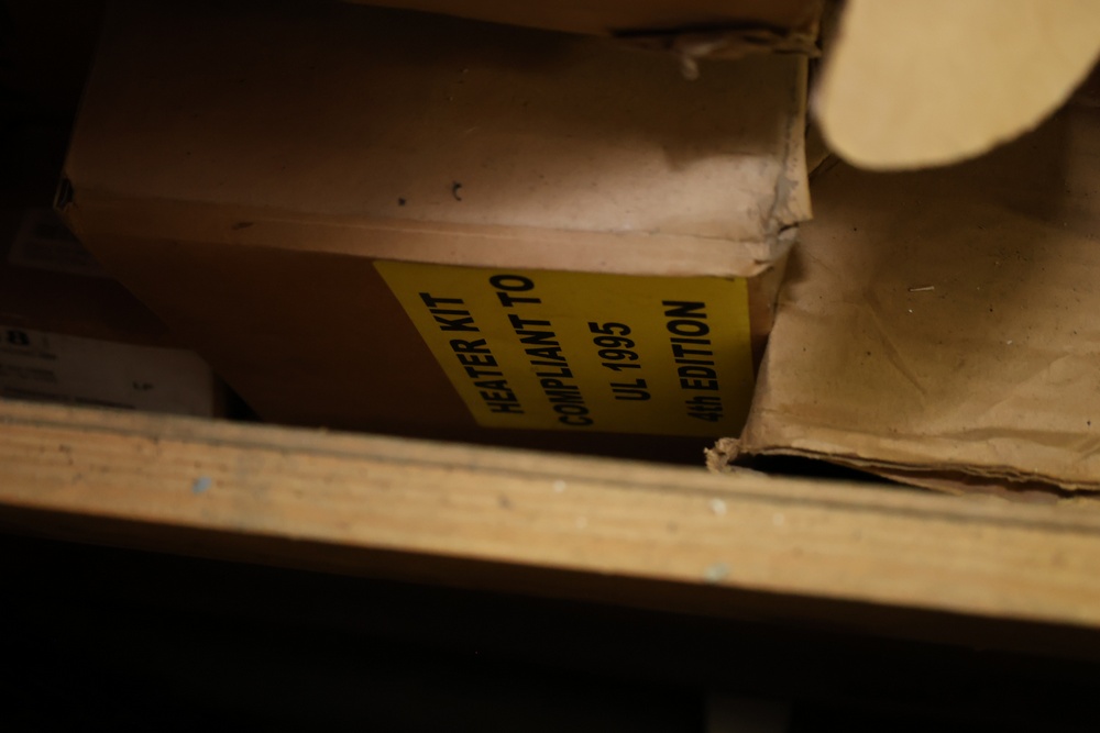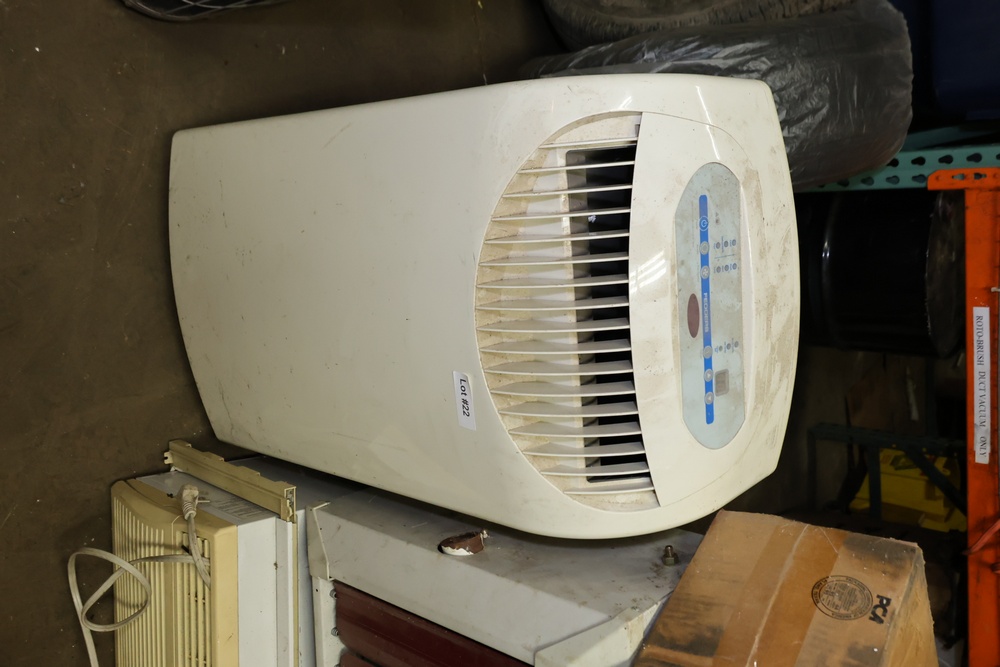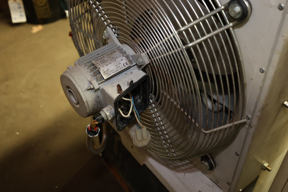HVAC components and portable air conditioning units. Notable items include a Fedders portable air conditioner, model AP09S2BCOM, rated at 9,000 BTU with 115V input, serial number DT860960. Also included is a Reznor hydronic unit heater, a window-mount air conditioner, and an open boxed heating element assembly labeled model HKSC05XCBA with visible wiring and coil elements. Additional components include a FIR S.p.A. AC motor, model WSE0/85, rated at 0.248 HP, 115V, 1050/1600 RPM, and a centrifugal blower fan in open packaging. Buyer must take all.