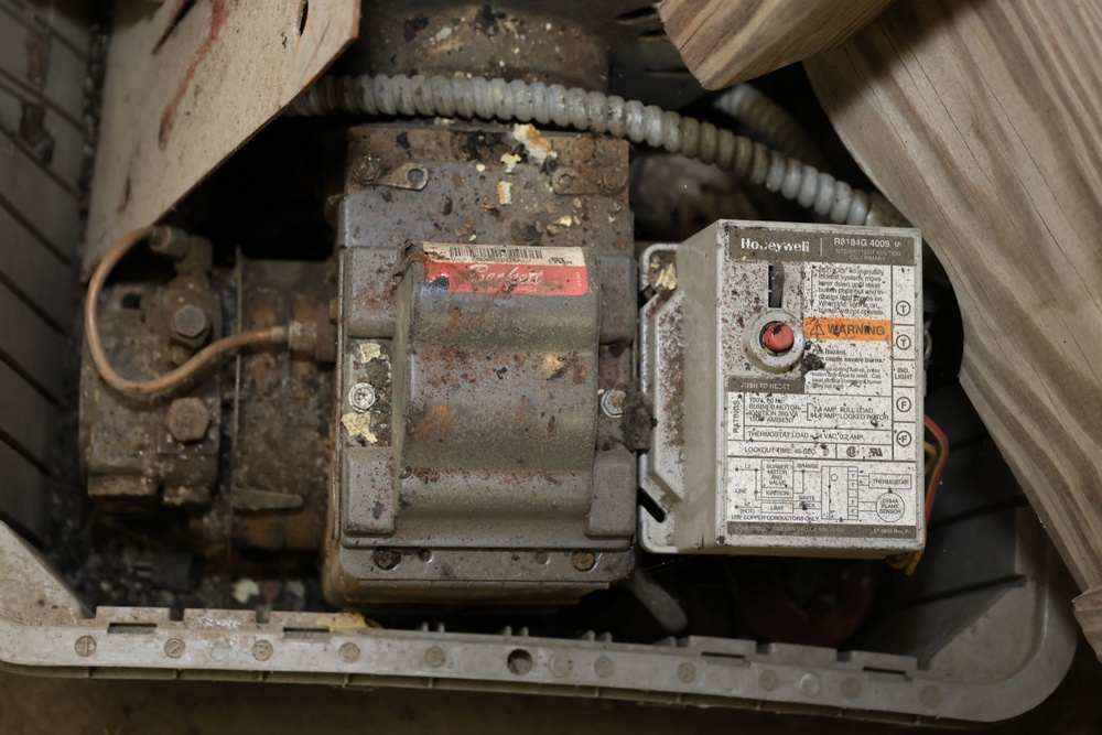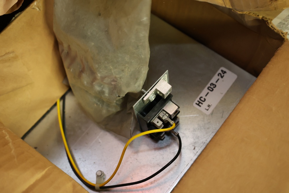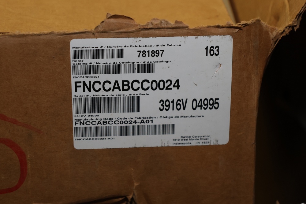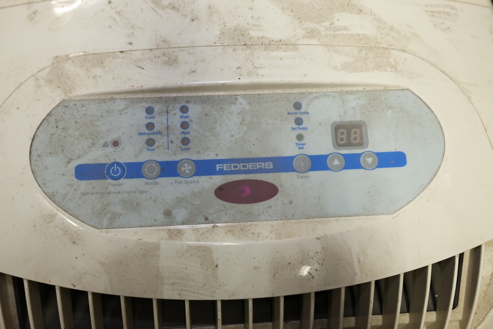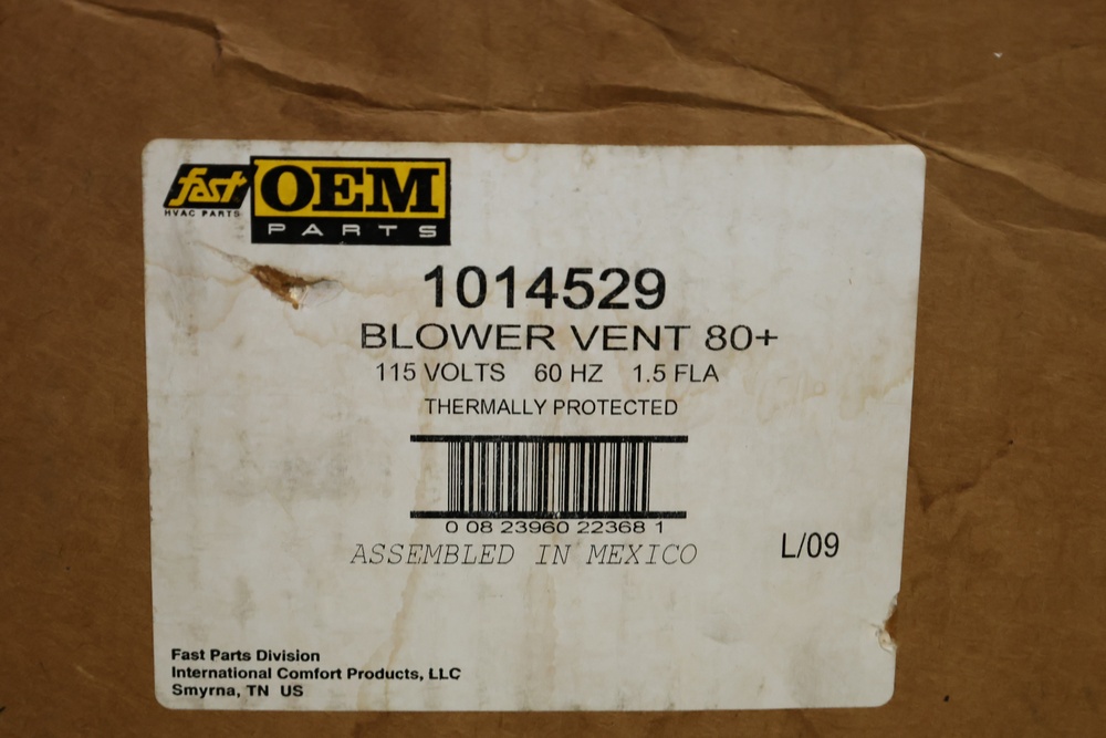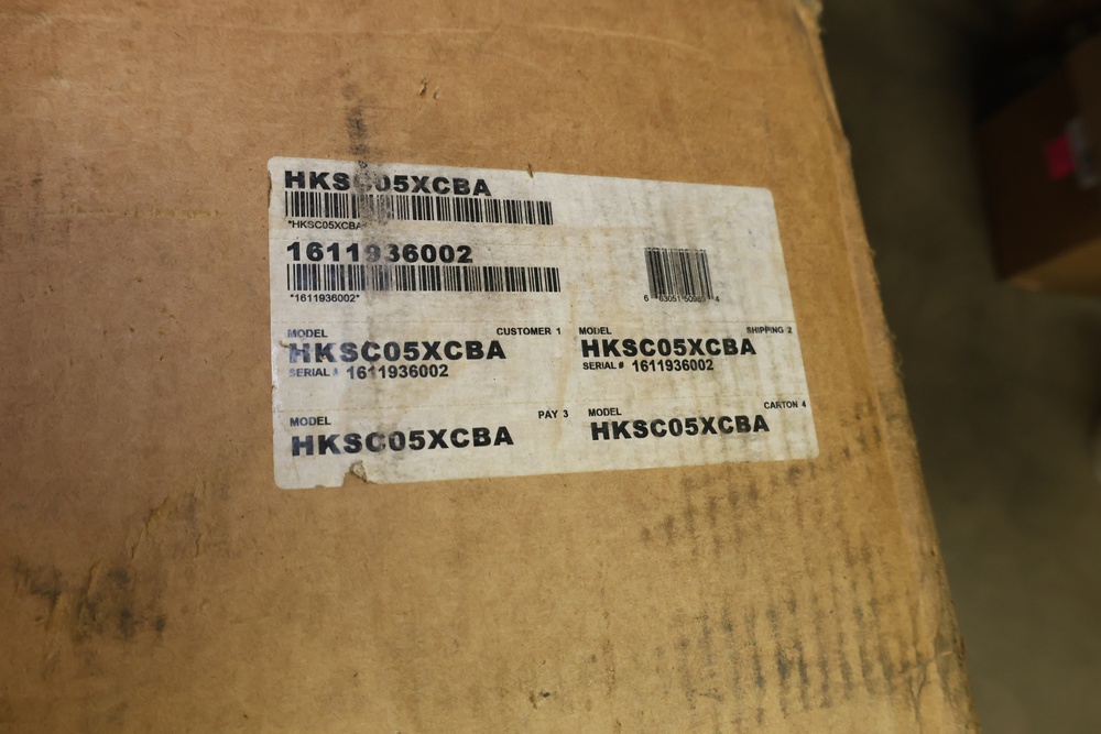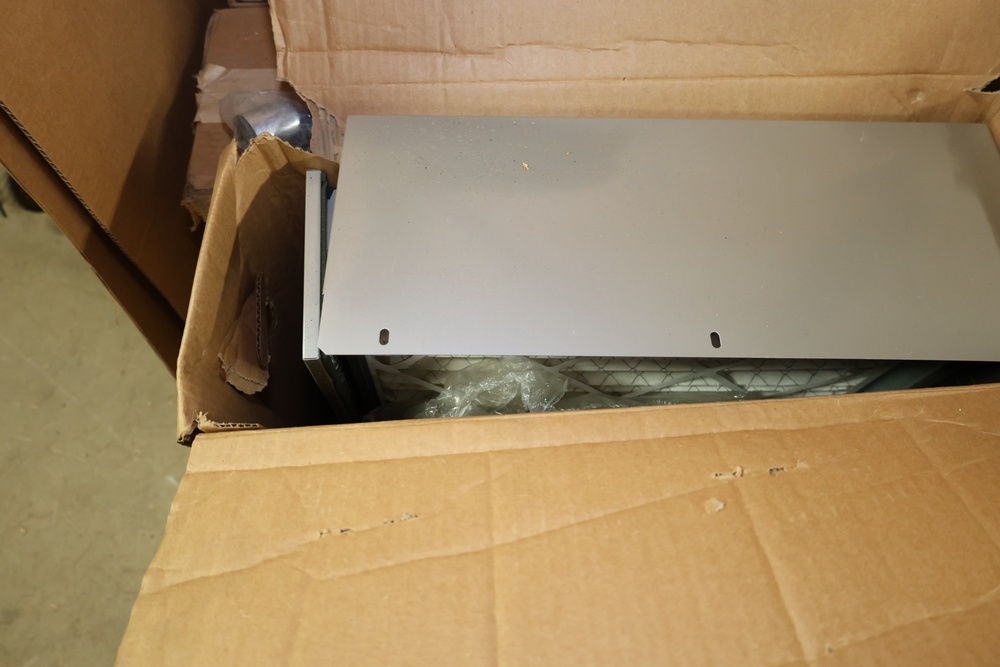 HVAC components and portable air conditioning units. Notable items include a Fedders portable air conditioner, model AP09S2BCOM, rated at 9,000 BTU with 115V input, serial number DT860960. Also included is a Reznor hydronic unit heater, a window-mount air conditioner, and an open boxed heating element assembly labeled model HKSC05XCBA with visible wiring and coil elements. Additional components include a FIR S.p.A. AC motor, model WSE0/85, rated at 0.248 HP, 115V, 1050/1600 RPM, and a centrifugal blower fan in open packaging. Buyer must take all.
