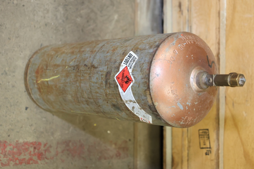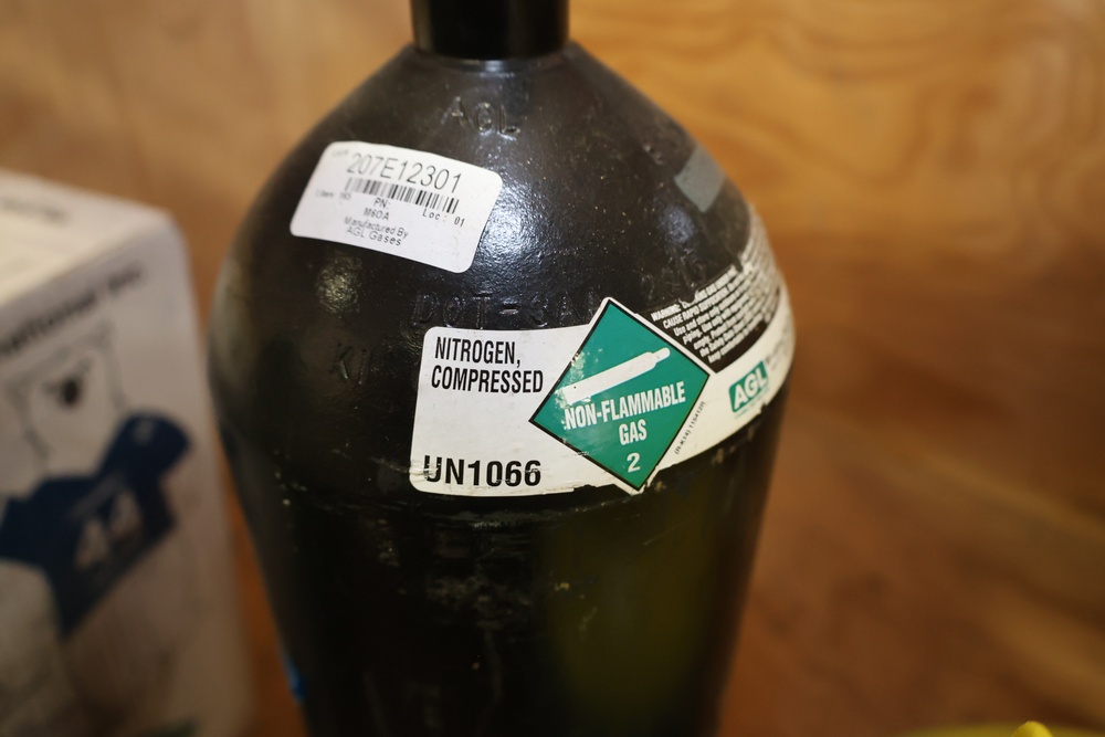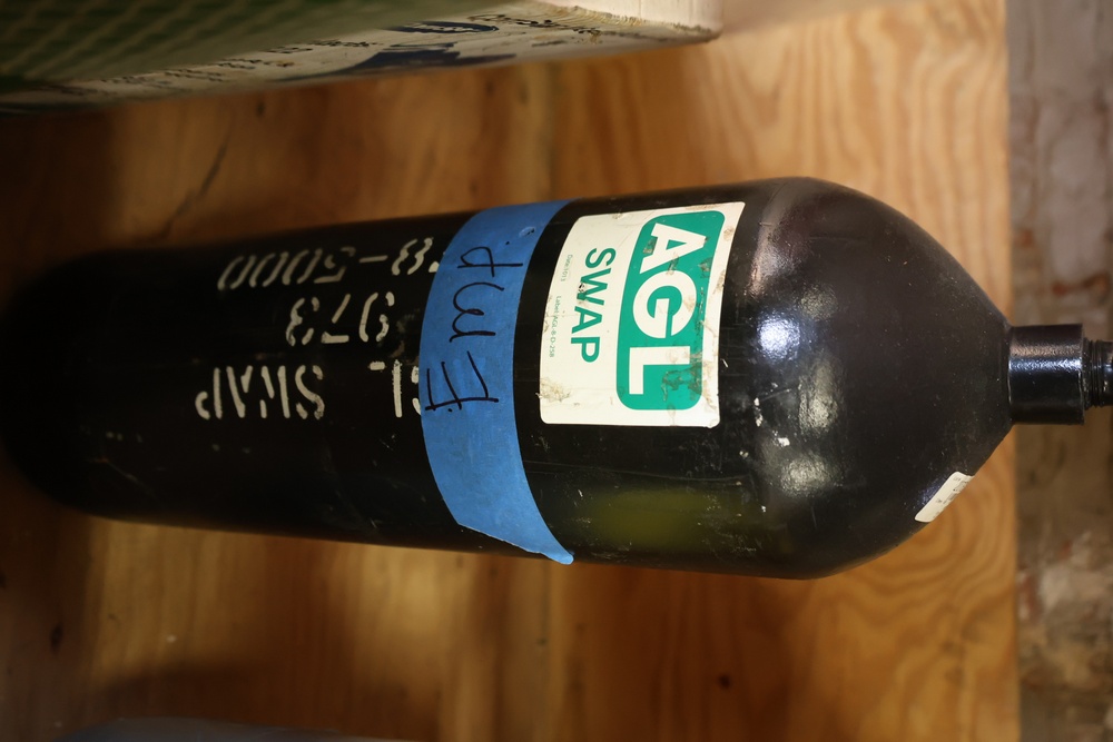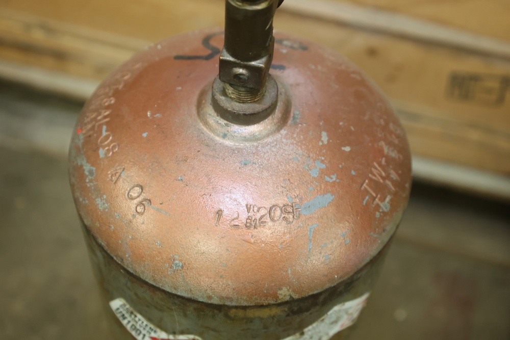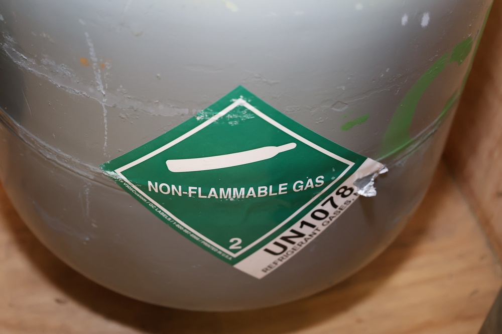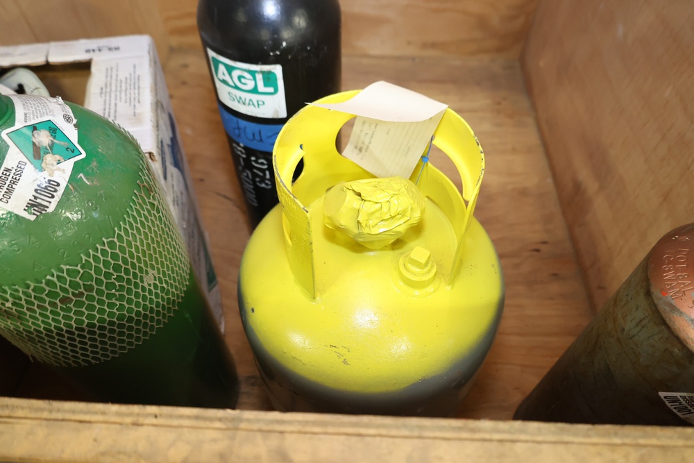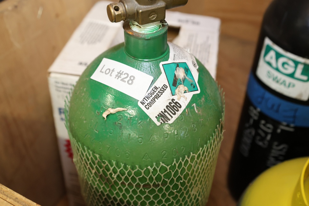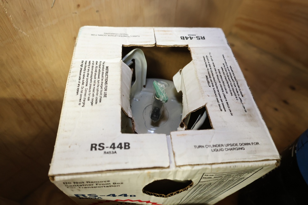 Assortment of refrigerant and compressed gas cylinders including RS-44B (R453A), nitrogen, and other cylinders. Seller states these are owned (not rented) and empty. Includes a total of six cylinders in various sizes and colors.
