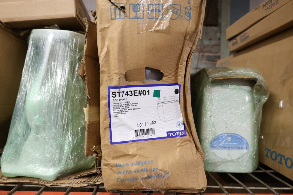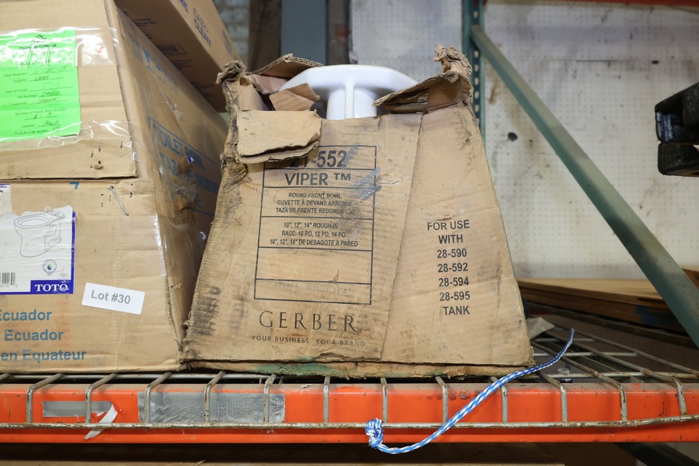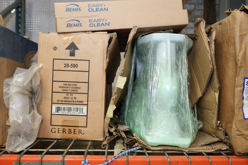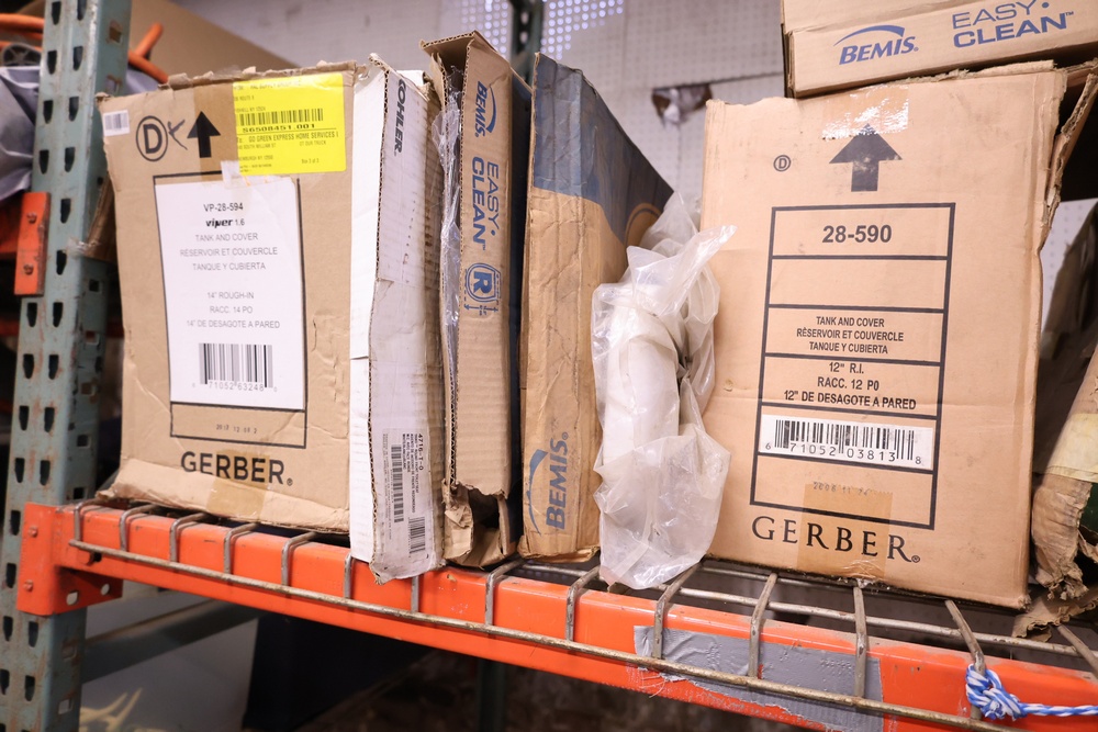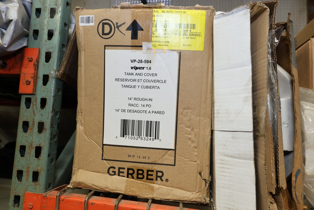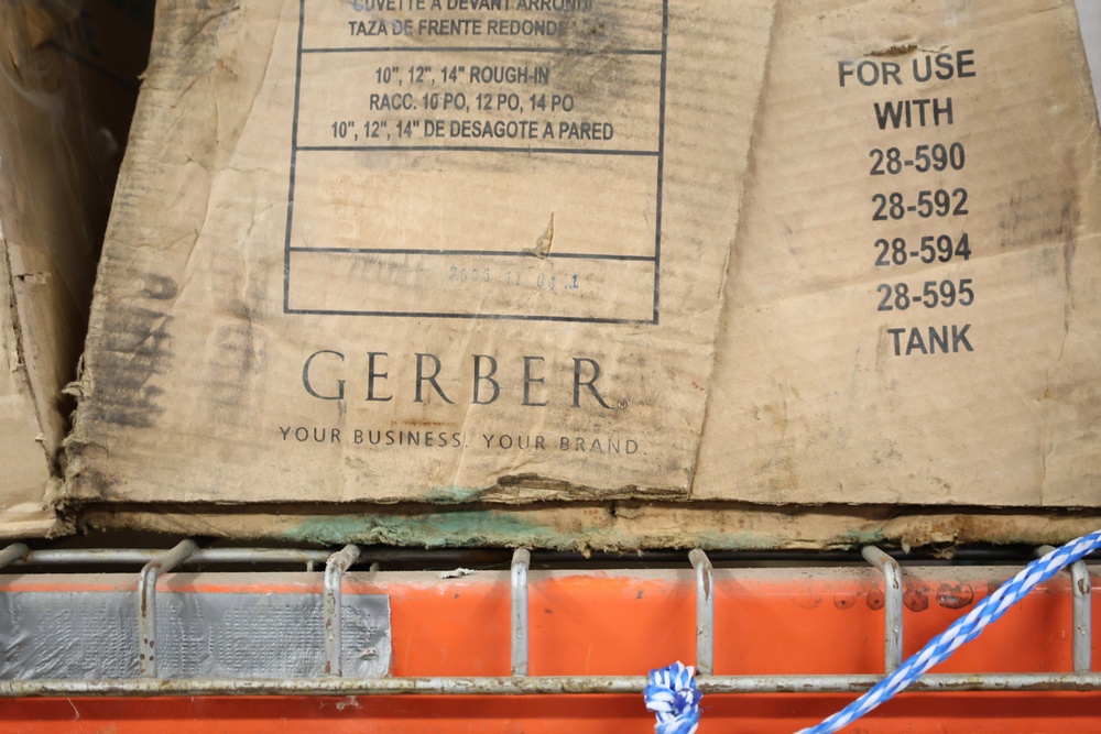 Gerber toilet tank assemblies including model VP-28-594 Viper 1.6 and model 28-590, both with tank and cover. The VP-28-594 features a 14" rough-in, and the 28-590 is labeled with a 12" rough-in. Additional components include a Toto ST743E#01 Eco Drake tank in color #01 Cotton, rated at 1.28 GPF / 4.8 LPF with chrome trip lever, and Bemis Easy Clean model 500EC 000 molded wood toilet seats in white. Units appear packed on a shelf with other associated parts, bases, and packaging materials. Buyer must take all.