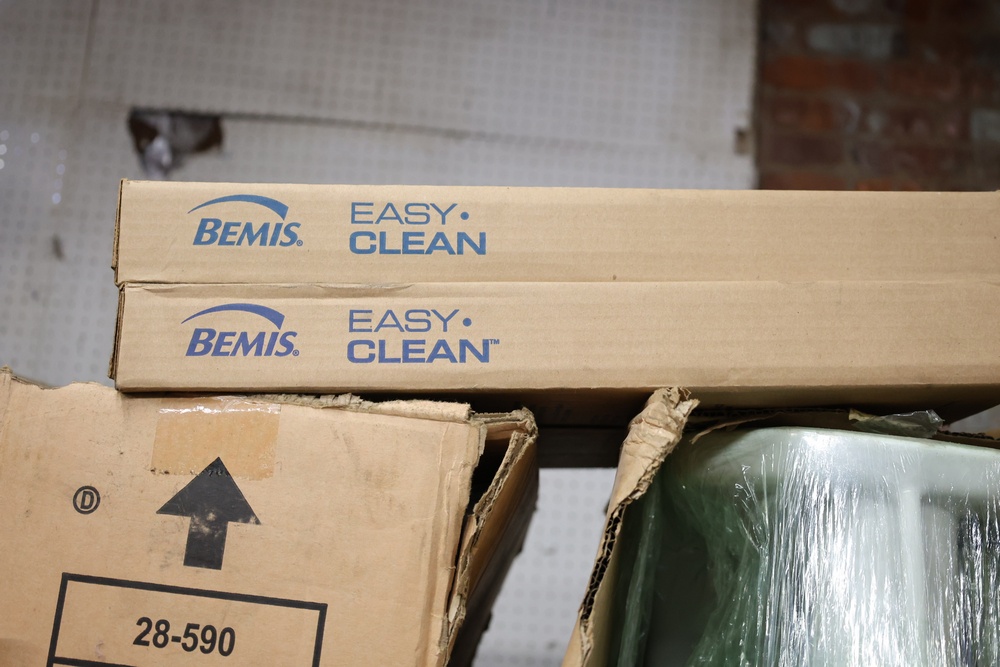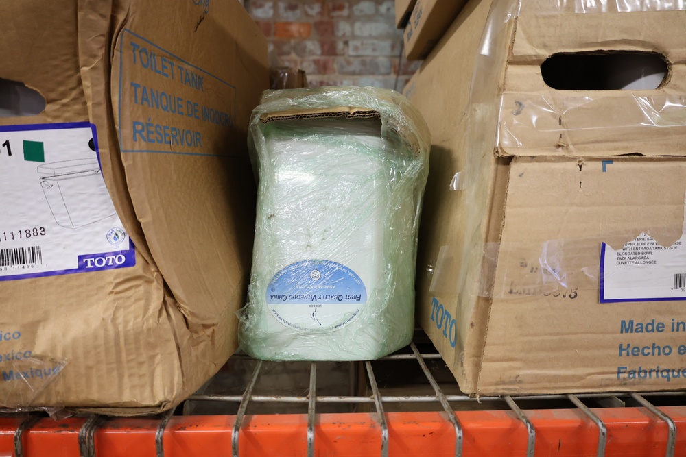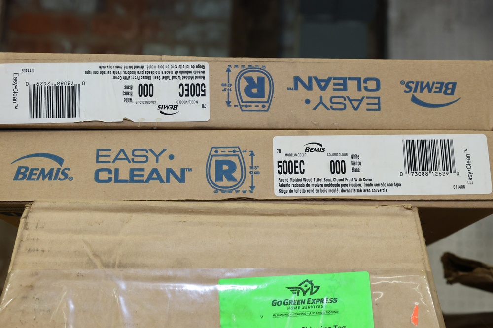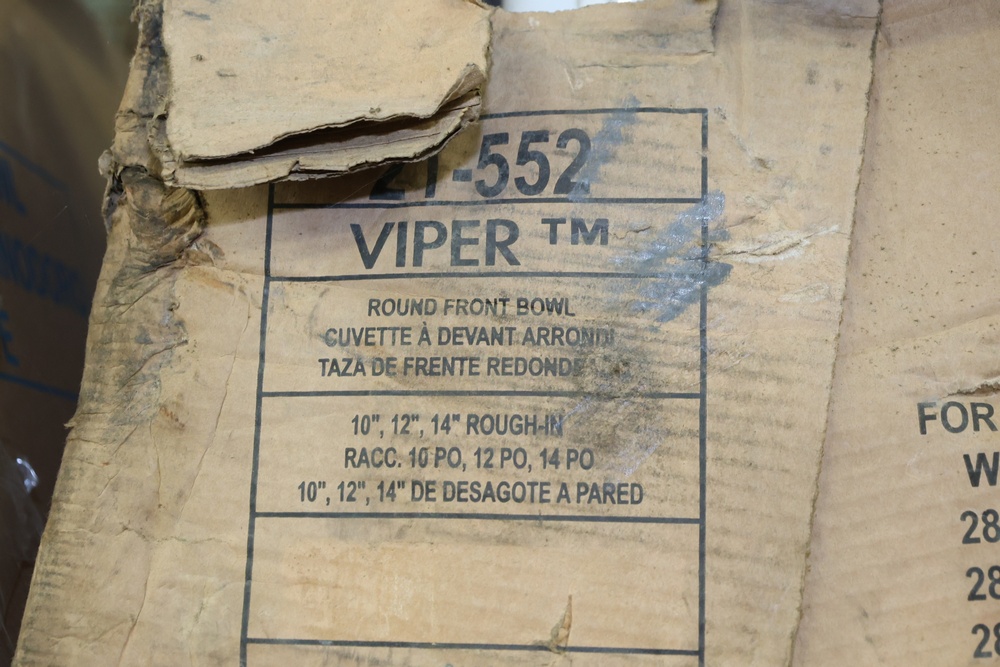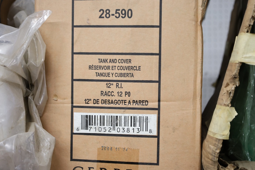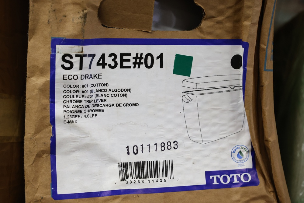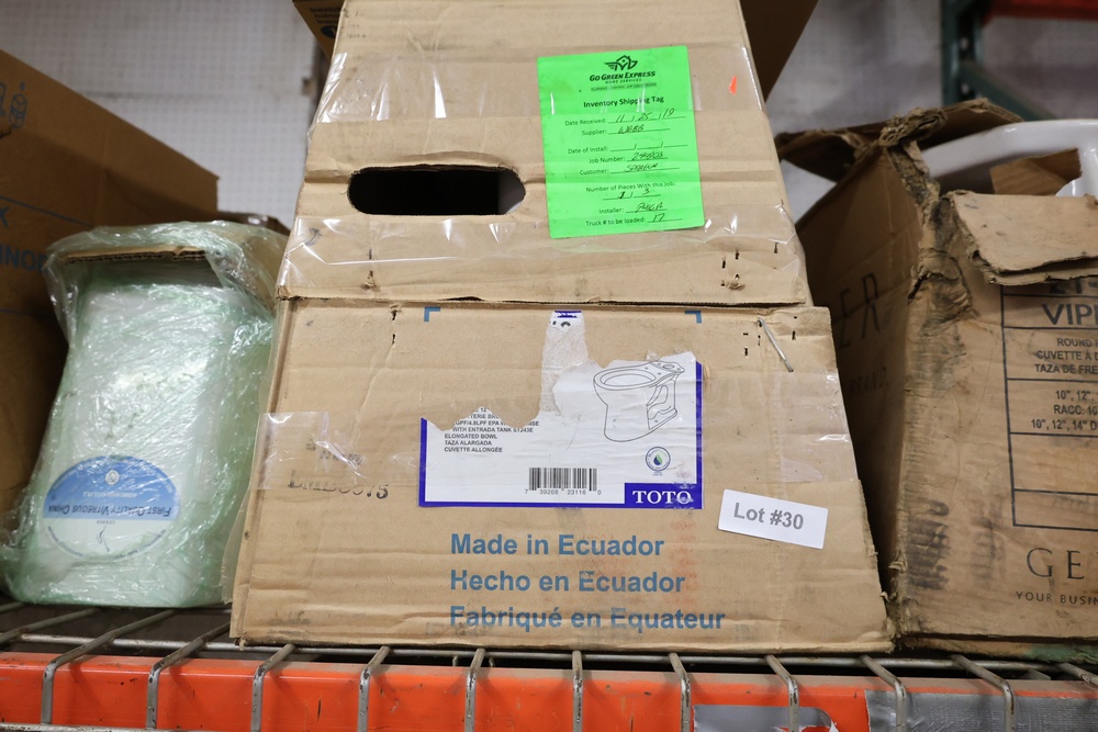 Gerber toilet tank assemblies including model VP-28-594 Viper 1.6 and model 28-590, both with tank and cover. The VP-28-594 features a 14" rough-in, and the 28-590 is labeled with a 12" rough-in. Additional components include a Toto ST743E#01 Eco Drake tank in color #01 Cotton, rated at 1.28 GPF / 4.8 LPF with chrome trip lever, and Bemis Easy Clean model 500EC 000 molded wood toilet seats in white. Units appear packed on a shelf with other associated parts, bases, and packaging materials. Buyer must take all.