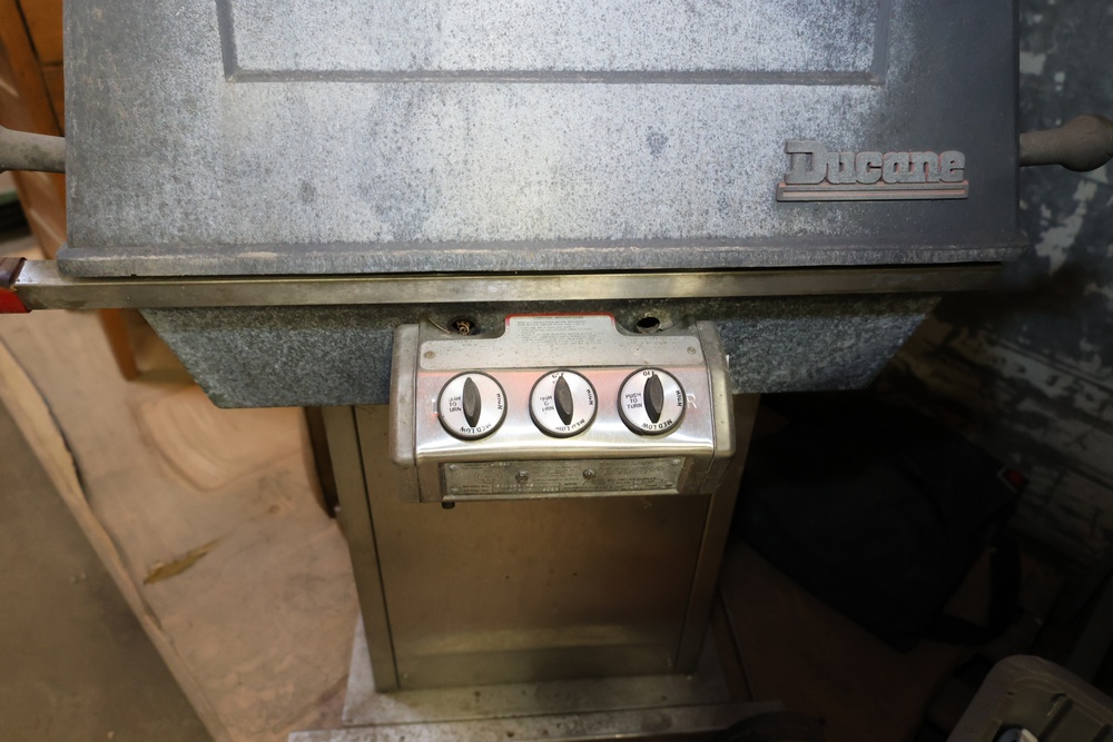 Ducane freestanding gas grill with three front-mounted control knobs and integrated push-button ignition. Features include dual side handles, cast grates, and internal burner shields. Grill lid is embossed with the Ducane brand mark, and unit is mounted on a cabinet-style stainless base with caster wheels. No model or serial number is visible in the provided images.